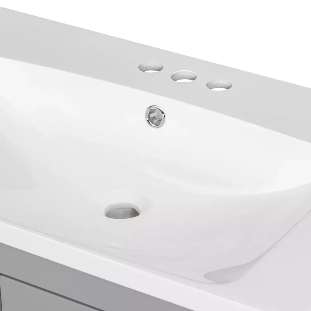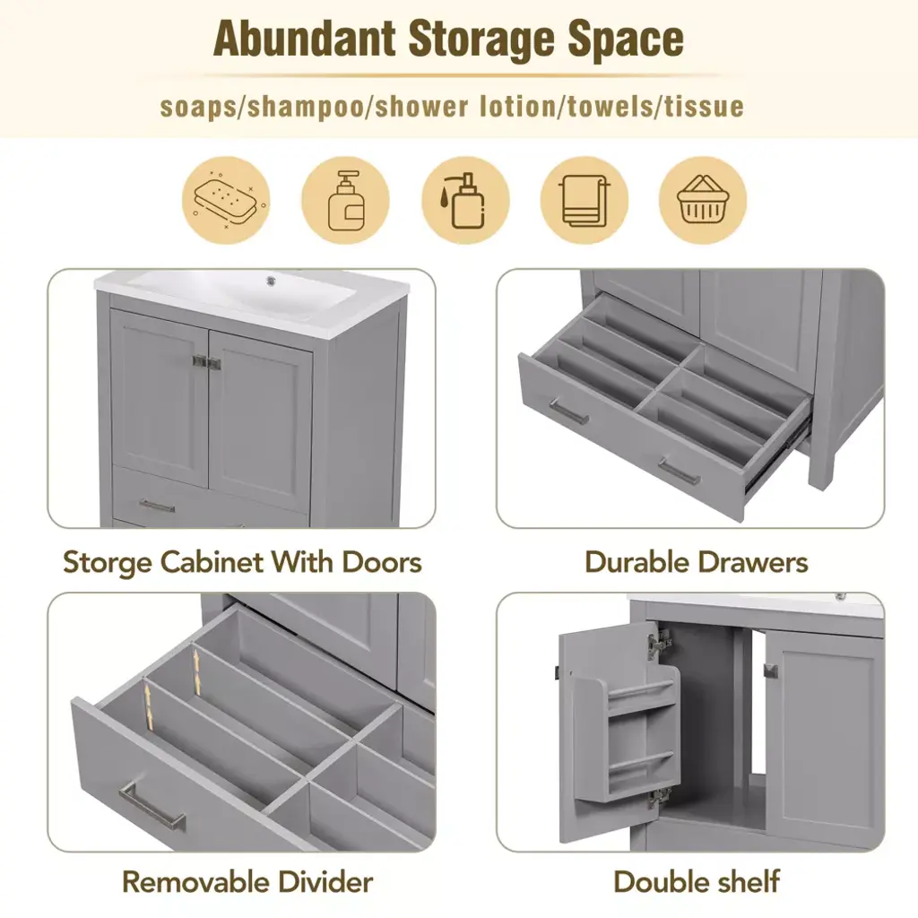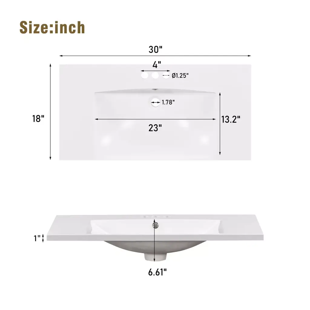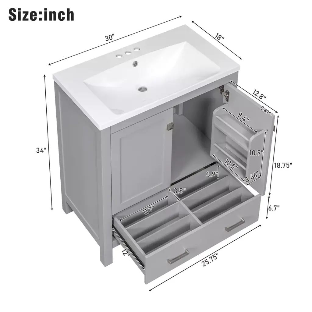 Our bathroom cabinets are designed with convenient storage in mind. The doors feature built-in shelves that provide a safe place to store bath essentials such as cosmetics, shampoo, body wash, razor and more, preventing items from slipping easily. The drawers are thoughtfully designed with sectioned compartments that allow you to neatly store bathroom essentials, keeping your bathroom clean and tidy. Specifications Material: Solid Wood+MDF+Resin+Zinc Alloy. Overall Dimension: 30"W x 18"D x 34"H. Sink Dimensions: 30"W x 18"D x 6.61"H. Drawer Weight Capacity: 50 LBS. Shelf Weight Capacity: 30 LBS. Overall Weight Capacity: 300 LBS. Faucet Mount: Centre 4"(not included).
