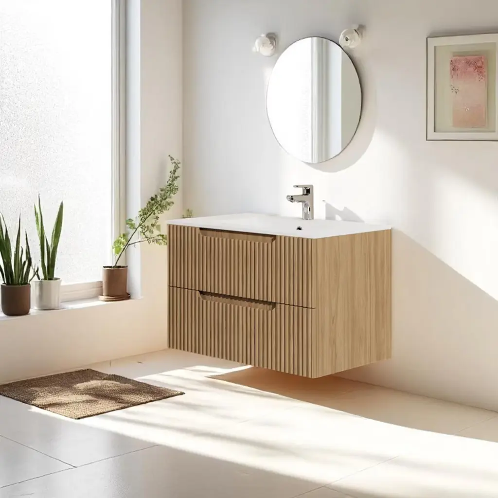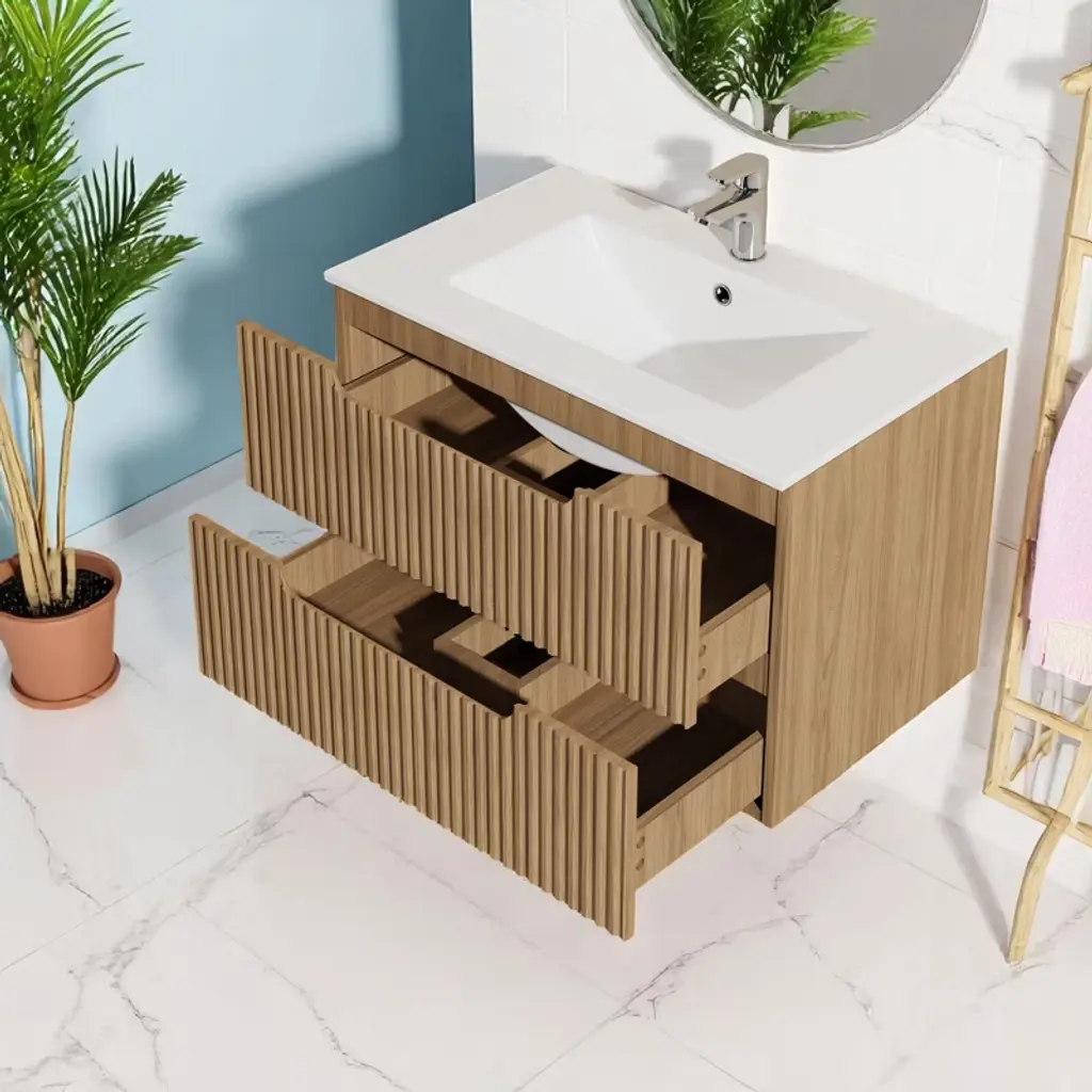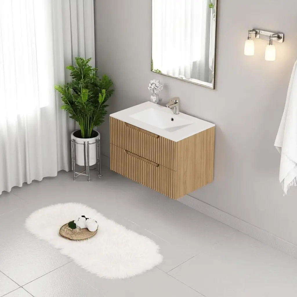 Product OverviewAdd sleek, modern functionality to your bathroom with this 30"" Wall-Mounted Bathroom Vanity. Designed with clean lines and a floating silhouette, this vanity features a drop-in ceramic sink and two spacious soft-close drawers that offer practical storage while complementing contemporary and mid-century styles. Crafted from high-quality MDF, it's built to withstand daily use in humid environments and provide long-lasting durability.Product FeaturesDimensions: Measures 30”W x 18”D x 19”H. Includes a drop-in ceramic sink for a clean and polished finish (faucet and drain not included).Premium Construction: Made from moisture-resistant MDF for exceptional strength and long-lasting performance in humid bathroom settings.Generous Storage Space: Equipped with two deep drawers, this vanity helps keep toiletries, towels, and other bathroom items neatly organized and within easy reach.Soft-Close Drawers: The drawers feature a soft-close mechanism that ensures quiet, gentle operation, enhancing both convenience and durability.Modern Floating Design: The wall-mounted installation gives your bathroom a more spacious and open feel while adding a touch of refined elegance. The textured drawer fronts bring visual depth and timeless appeal.SpecificationsProduct Dimensions: 30"" L x 18.5"" W x 19.1"" HChargeable Weight: 130 lbsMaterial: MDF cabinet, ceramic sinkMounting Type: Wall-mounted / floatingSink Type: Drop-in ceramic sinkFaucet Compatibility: Standard faucet (not included)Drawer Quantity: 2Assembly Required: YesSuitable ScenariosPerfect for contemporary or mid-century modern bathroomsIdeal for small to medium spaces seeking a minimalist lookGreat for homeowners, remodelers, or rental propertiesNotesFaucet and drain are not included.Assembly is required. All hardware and instructions are included for easy installation.Colors may vary slightly due to screen settings and lighting conditions.