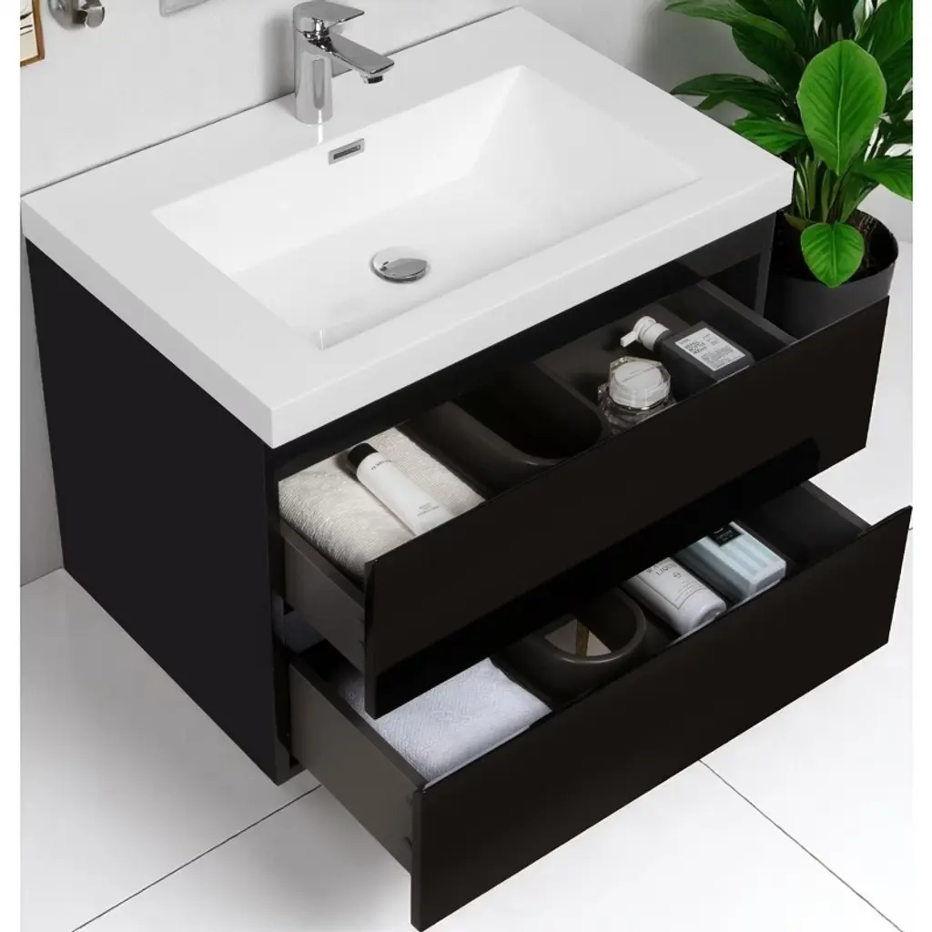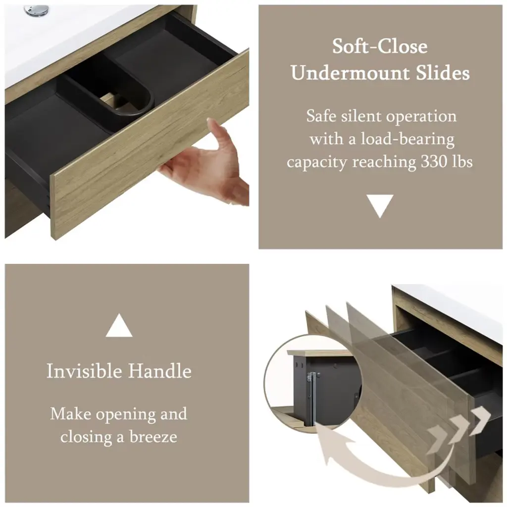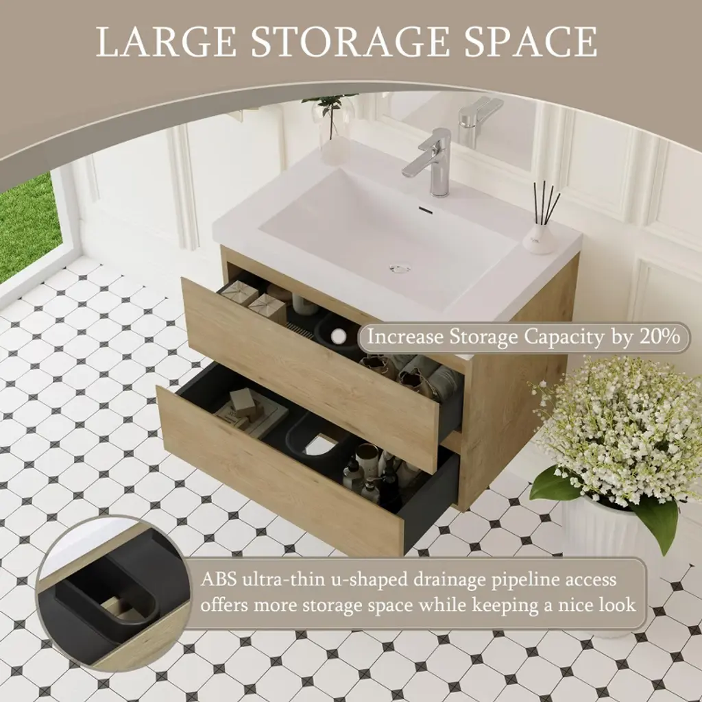 Product OverviewRefresh your bathroom with this 30-inch wall-mounted vanity that delivers both contemporary style and efficient functionality. Designed to maximize space while enhancing visual appeal, this modern floating cabinet features a glossy white resin sink, water-resistant finish, and soft-close hinges. Ideal for smaller spaces or those seeking a sleek and clean design, this vanity offers the perfect combination of form and practicality.Product FeaturesClean and Functional Design: This compact floating vanity is perfect for organizing toiletries and cosmetics. Its minimalist silhouette complements a wide range of bathroom interiors while freeing up floor space for a clean and open look.Glossy Resin Countertop: The integrated one-piece sink is made of high-quality resin, offering a durable, non-porous surface that is easy to clean and resistant to yellowing. It supports standard 1-3/8"" single-hole faucets and 1-3/4"" pop-up drains (faucet and drain not included).Easy to Install: Designed with an open back for straightforward plumbing access, this vanity arrives with pre-drilled components, making assembly quick and simple—typically under 30 minutes.Durable and Water-Resistant: Crafted from premium engineered wood with a protective, water-resistant finish, this vanity is built to withstand daily moisture exposure. Soft-close hinges ensure smooth, silent operation for a more refined bathroom experience.SpecificationsAssembled Dimensions: 29.53"" L x 19.69"" W x 22.44"" HTotal Weight: 102.1 lbsMaterial: High-quality engineered woodCountertop Material: Glossy resinMounting Type: Wall-mountedSink Type: Integrated resin sinkFaucet Compatibility: 1-3/8"" single-hole (not included)Drain Compatibility: 1-3/4"" pop-up drain (not included)Assembly: Required, with pre-drilled parts and clear instructionsSuitable ScenariosIdeal for small bathrooms, powder rooms, apartments, or modern minimalist interiorsGreat choice for renovations or upgrading to a sleek, space-saving designNotesFaucet and drain assembly are not included with this vanity.Color may vary slightly depending on lighting or monitor settings.Assembly required; installation recommended with two people.
