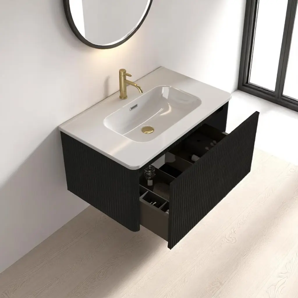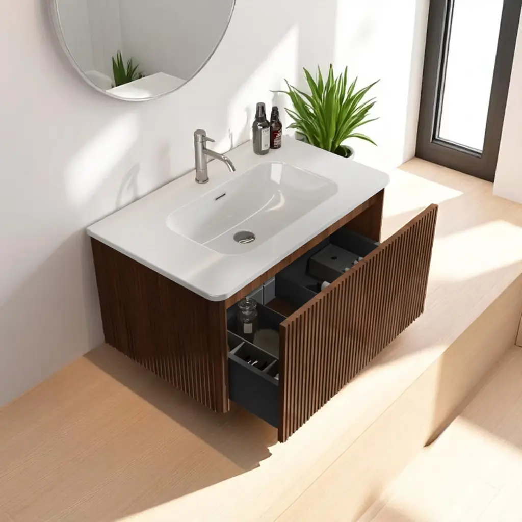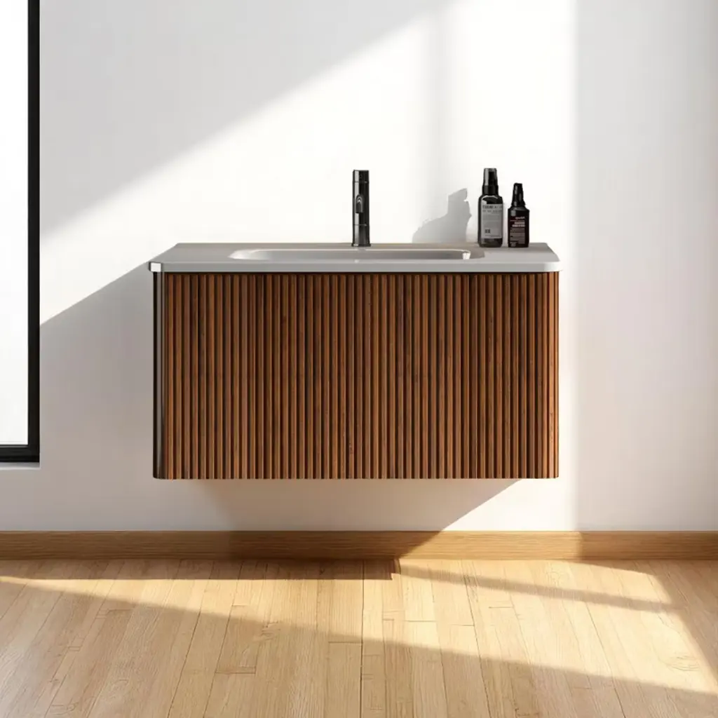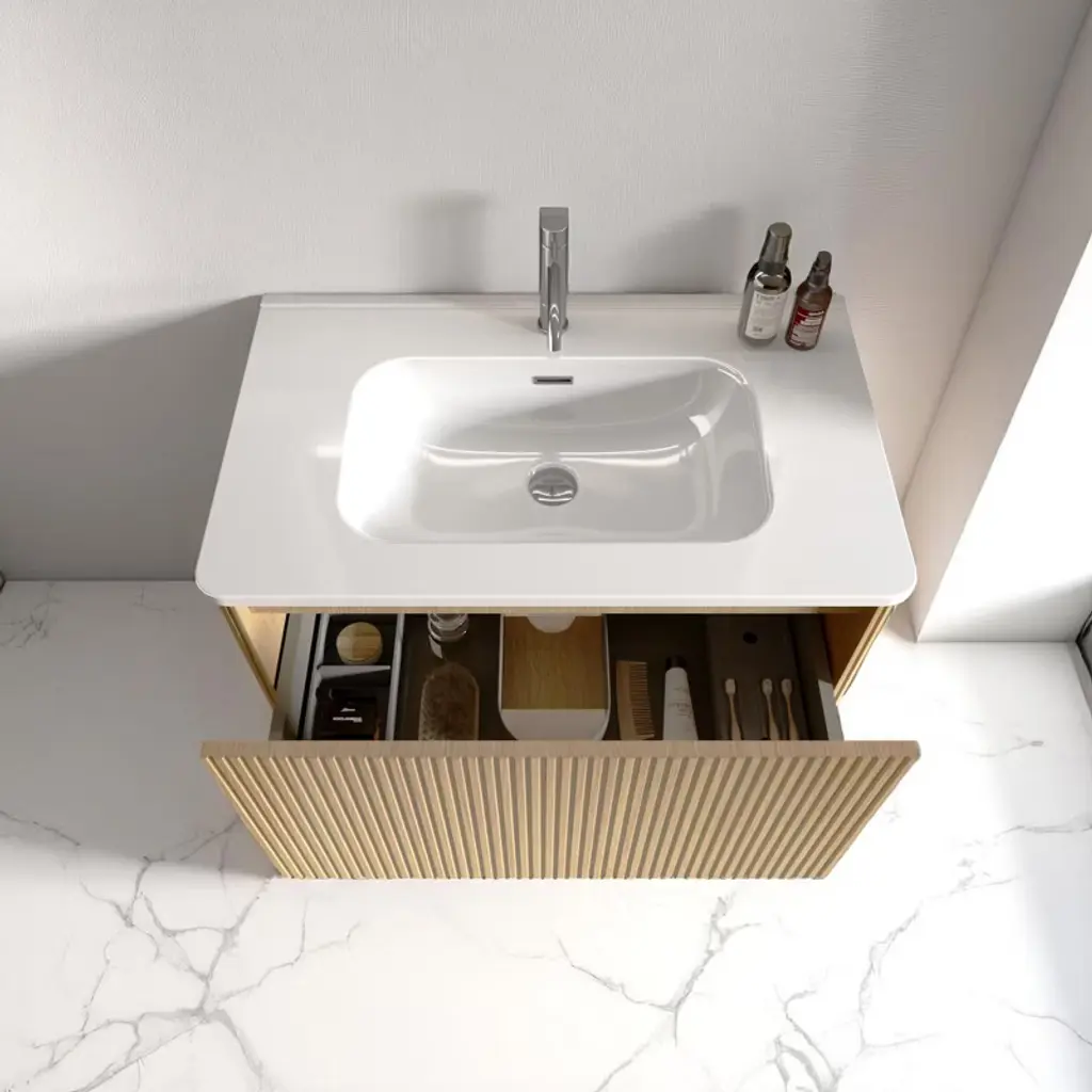 Product Overview Upgrade your bathroom with the 24" Floating Bathroom Vanity, featuring a modern striped natural oak texture, wall-mounted design, and integrated glossy ceramic sink. Its push-open drawer system offers clean lines and smart storage, ideal for compact spaces. Product Features Striped oak wood grain finish adds sophistication to modern bathrooms Curved edges provide safety and a smooth, minimalist silhouette Glossy white ceramic sink is easy to clean and visually sleek Push-to-open drawer eliminates handles for a streamlined look Over 12" drawer height accommodates towels and toiletries U-shaped drawer fits around plumbing to increase usable space by up to 50% Specifications Assembled Size: 24.01"L x 18.3"W x 15.6"H Chargeable Weight: 67 lbs Mounting Type: Wall-mounted (floating) Sink Material: Glossy white ceramic Cabinet Material: Engineered wood with natural oak texture Drawer: Push-to-open, handle-free design Suitable Scenarios Ideal for small bathrooms, powder rooms, and modern apartments Great for minimalist interiors with hidden storage Suitable for families needing safer vanity solutions Notes Assembly and installation required; hardware and instructions included Faucet and mirror not included