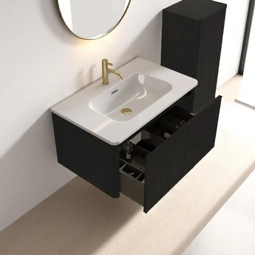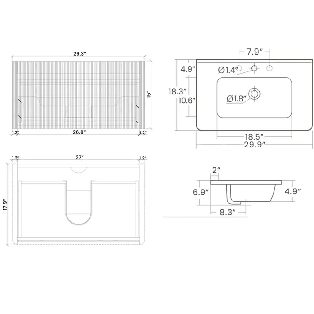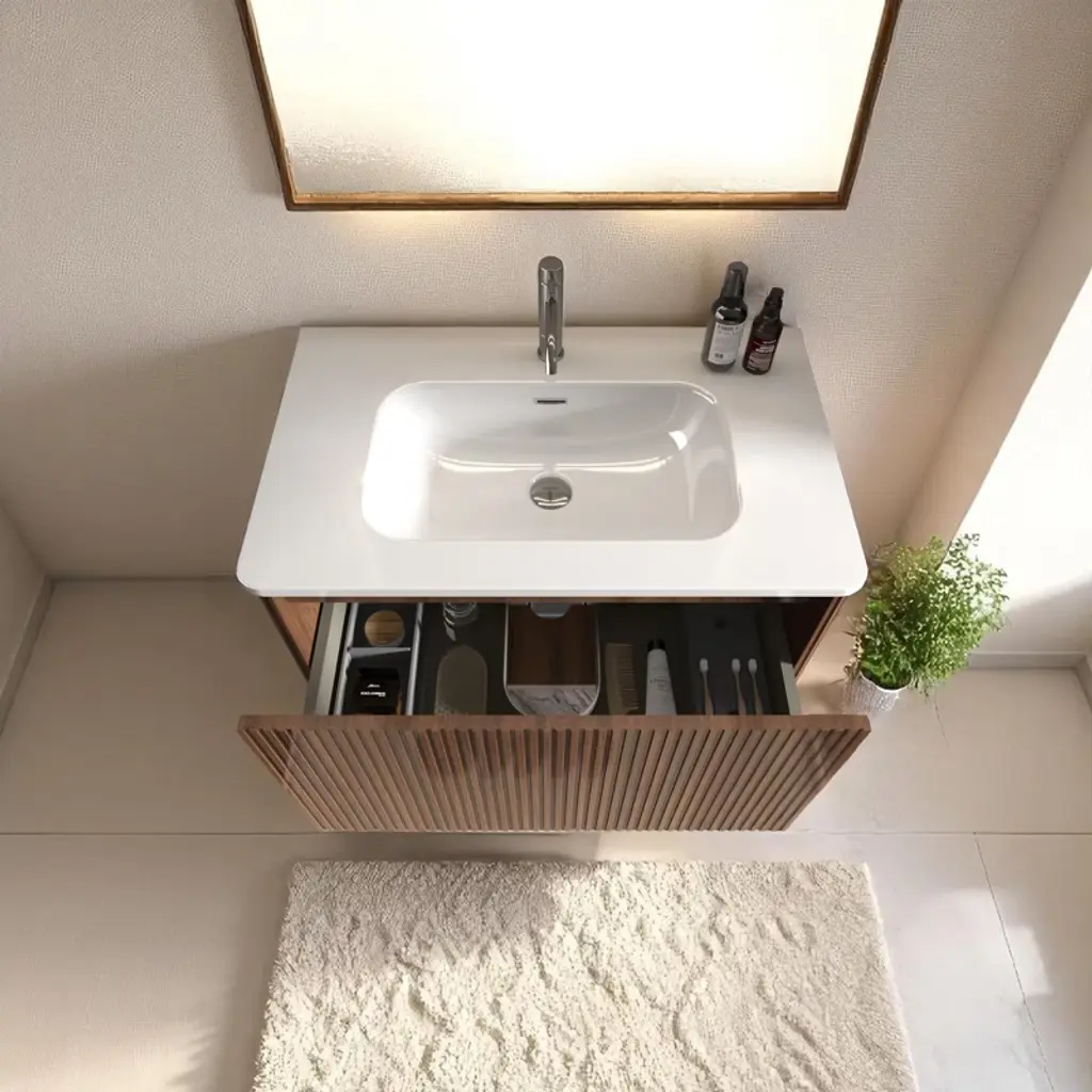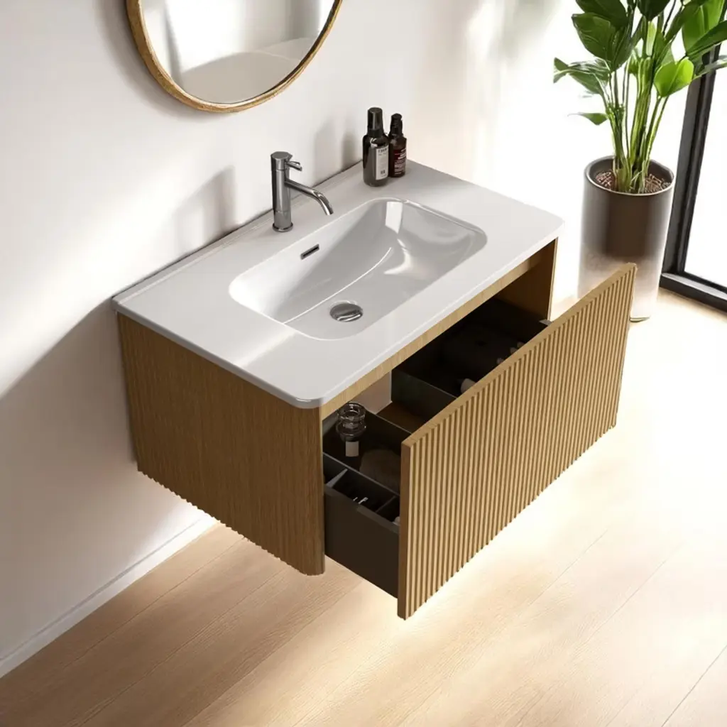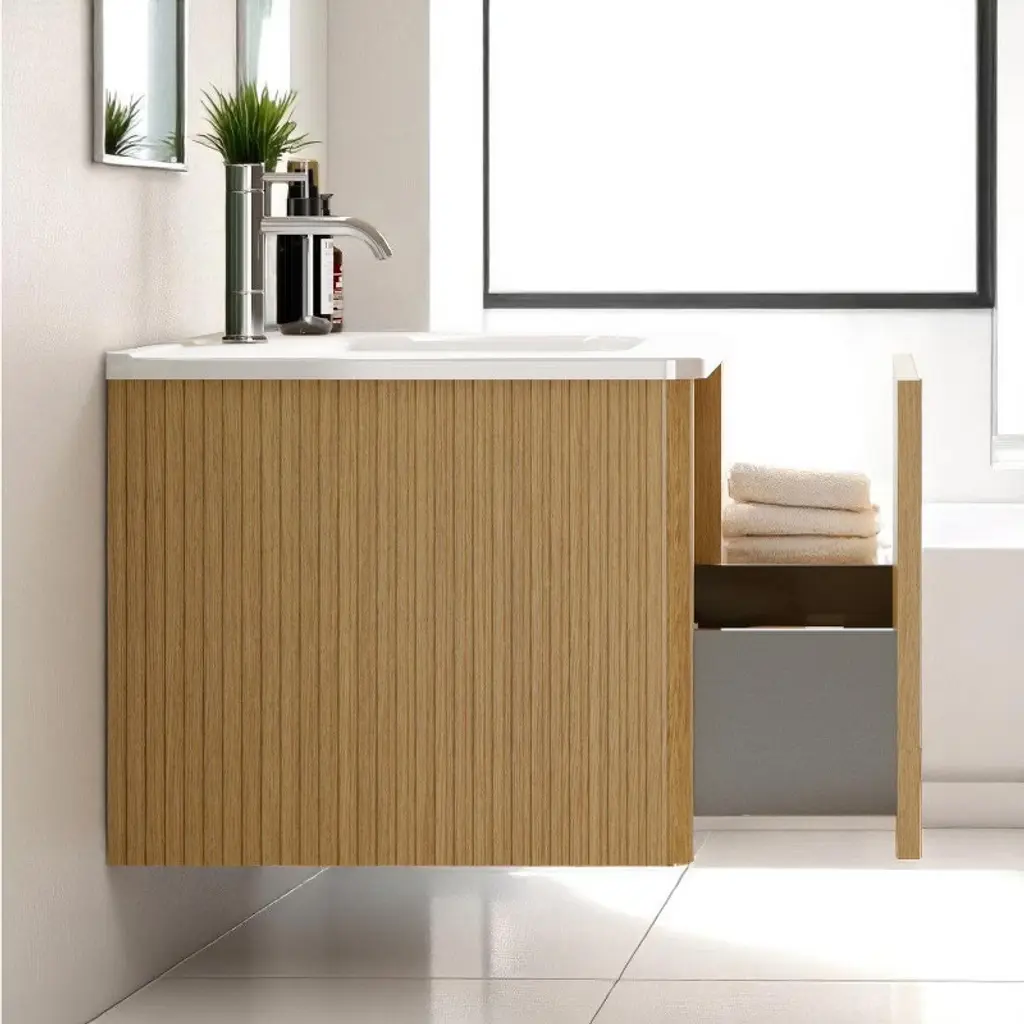 Product Overview Upgrade your bathroom with the 24" Floating Bathroom Vanity, featuring a modern striped natural oak texture, wall-mounted design, and integrated glossy ceramic sink. Its push-open drawer system offers clean lines and smart storage, ideal for compact spaces. Product Features Striped oak wood grain finish adds sophistication to modern bathrooms Curved edges provide safety and a smooth, minimalist silhouette Glossy white ceramic sink is easy to clean and visually sleek Push-to-open drawer eliminates handles for a streamlined look Over 12" drawer height accommodates towels and toiletries U-shaped drawer fits around plumbing to increase usable space by up to 50% Specifications Assembled Size: 24.01"L x 18.3"W x 15.6"H Chargeable Weight: 67 lbs Mounting Type: Wall-mounted (floating) Sink Material: Glossy white ceramic Cabinet Material: Engineered wood with natural oak texture Drawer: Push-to-open, handle-free design Suitable Scenarios Ideal for small bathrooms, powder rooms, and modern apartments Great for minimalist interiors with hidden storage Suitable for families needing safer vanity solutions Notes Assembly and installation required; hardware and instructions included Faucet and mirror not included