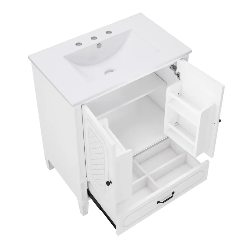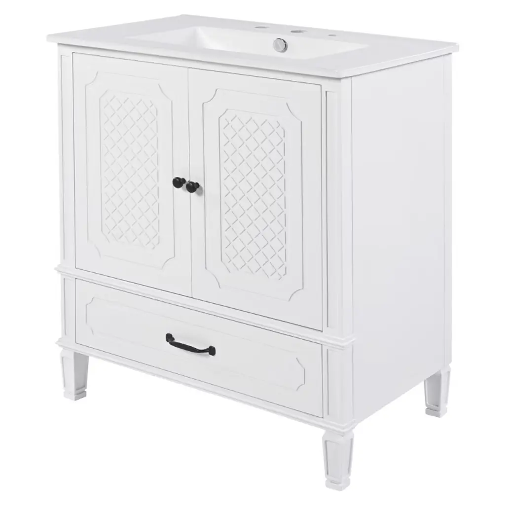 Enhance your bathroom with this 30" white vintage-style vanity. Designed with a built-in sink, soft-closing door, and a functional storage shelf, it offers both elegance and practicality for an organized space.