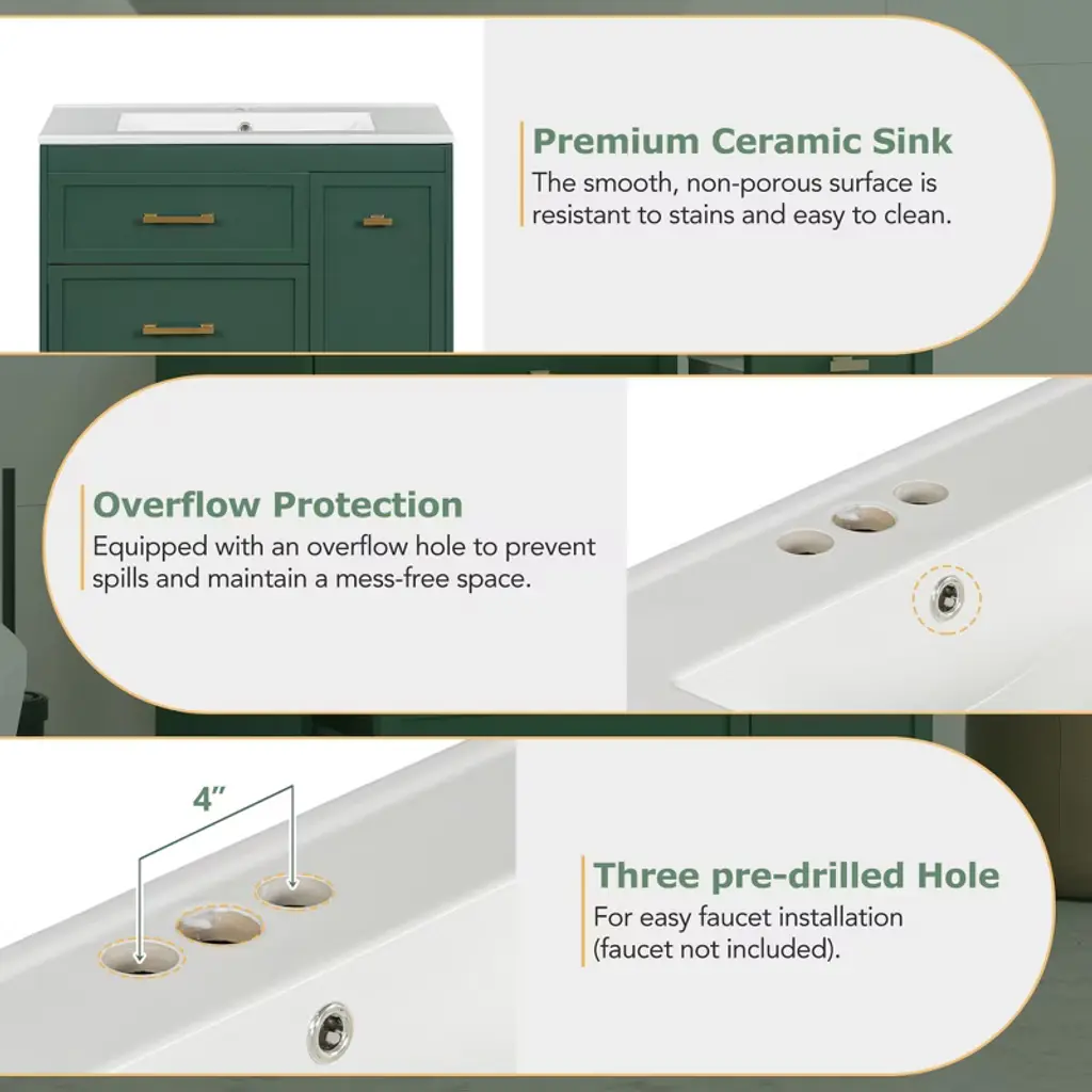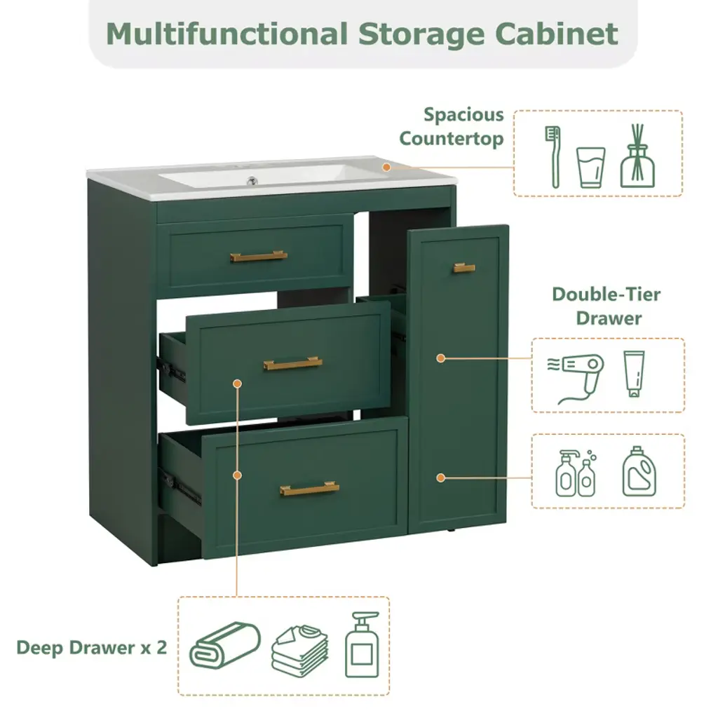 Transform your bathroom into a serene retreat with this 30" wide vanity, designed to elevate both space and style in smaller bathrooms. Its forest-green elegance and golden accents add a timeless sophistication, while the ceramic basin with overflow promises effortless maintenance and a clean, dry space. Every inch is crafted for functionality: a double-layer drawer and deep compartments offer ample storage, keeping essentials organized and within reach. Built with durable MDF, this piece embodies enduring quality, blending beauty and utility seamlessly. Envision the harmony—where form meets function in your personal sanctuary.