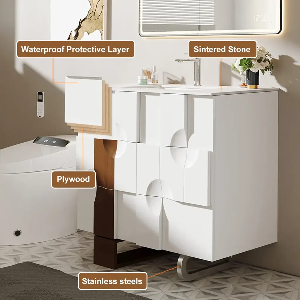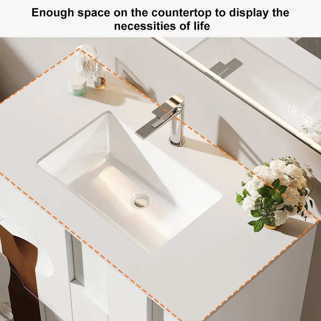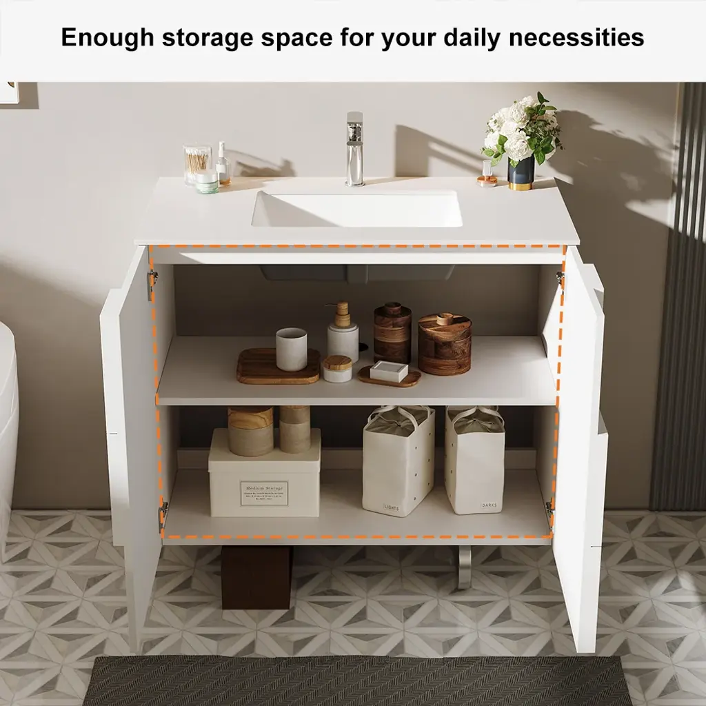 This bathroom vanity is constructed of plywood, sintered stone, and ceramic with a durable, water-resistant coating on the exterior and a waterproof interior. The sintered stone vanity top includes an integral white sink for easy cleaning. This bathroom vanity with sintered stone top has 2 wood doors to keep all your essentials organized.