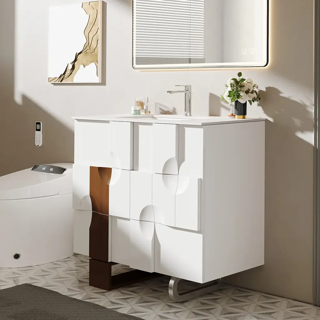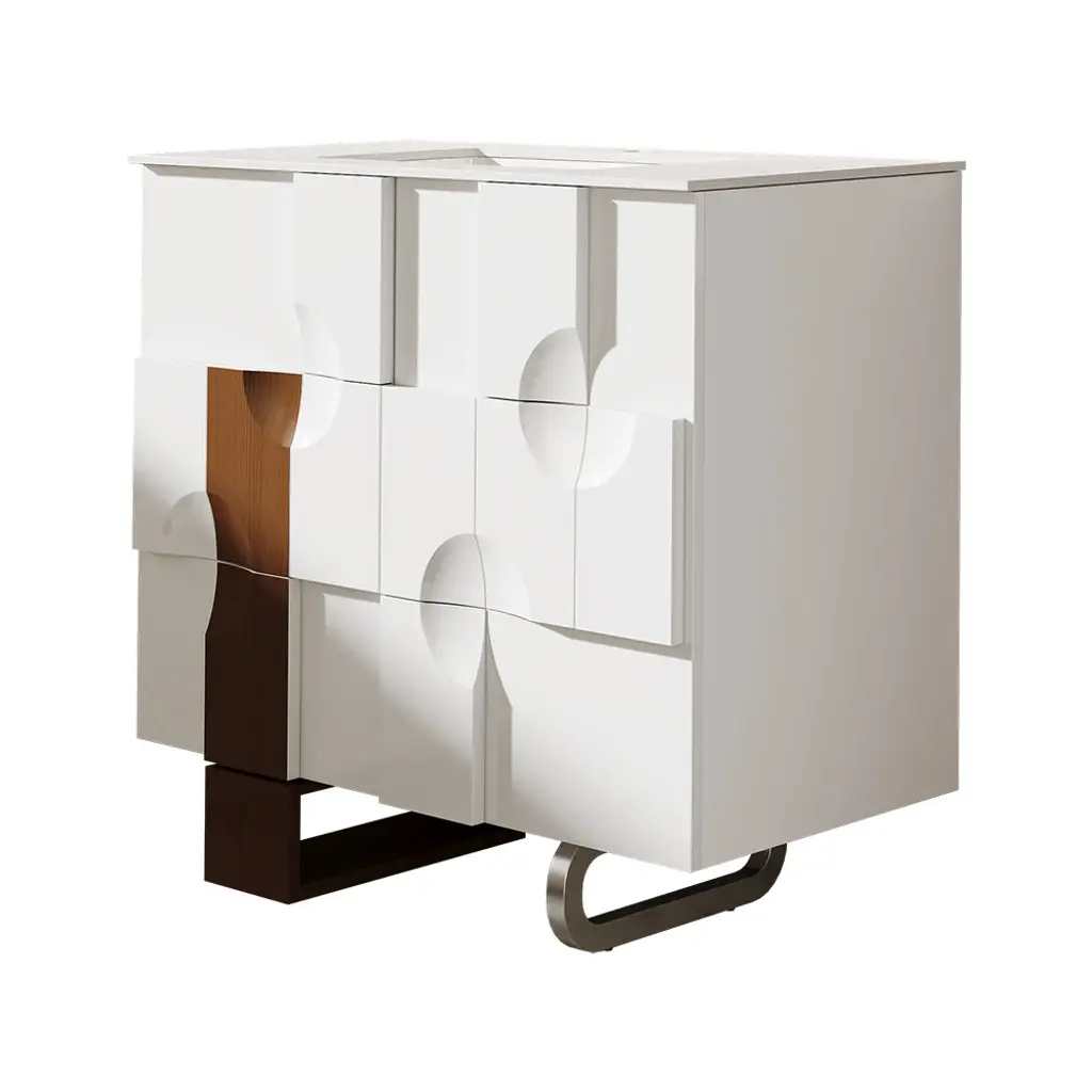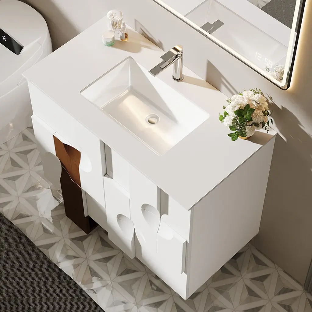 This bathroom vanity is constructed of plywood, sintered stone, and ceramic with a durable, water-resistant coating on the exterior and a waterproof interior. The sintered stone vanity top includes an integral white sink for easy cleaning. This bathroom vanity with sintered stone top has 2 wood doors to keep all your essentials organized.