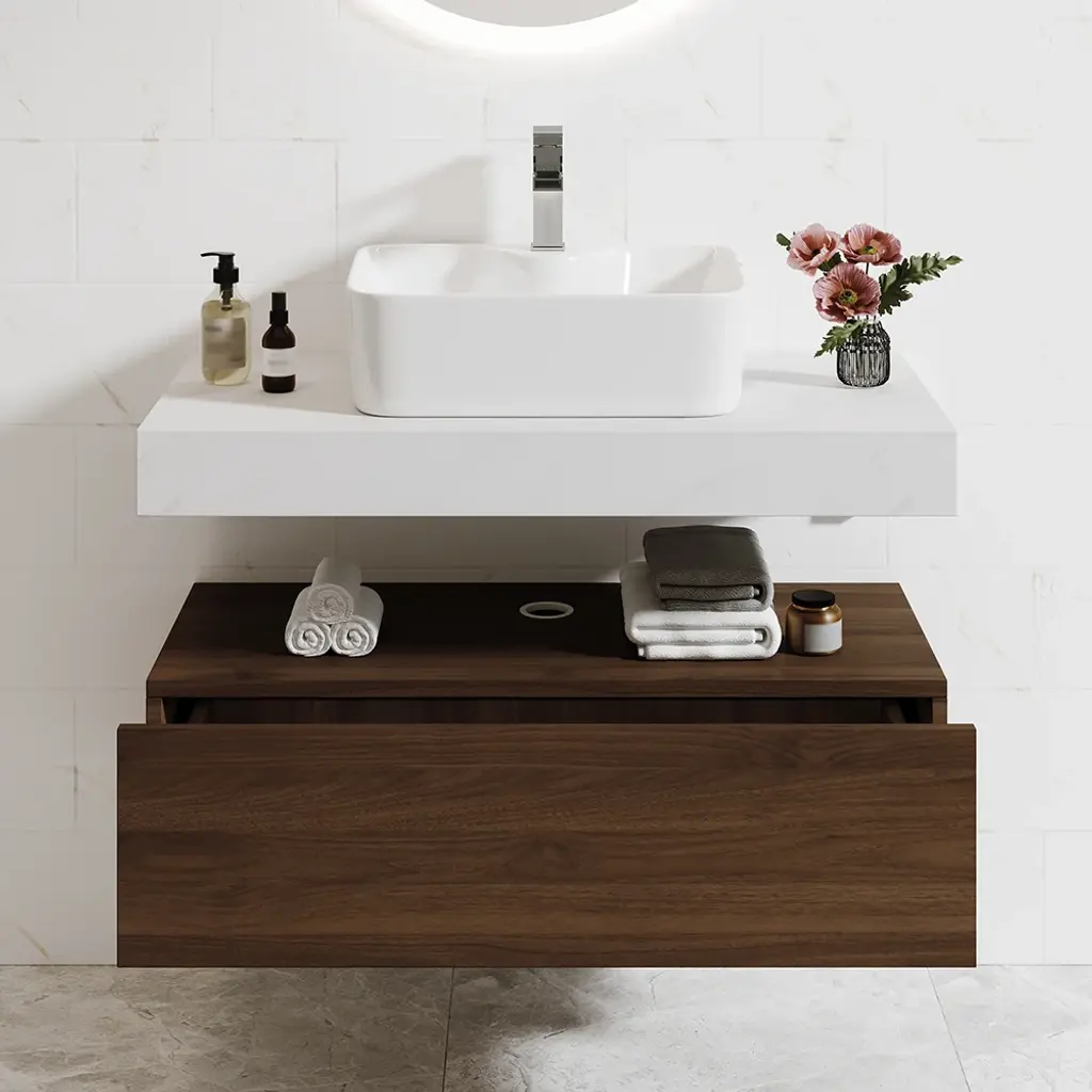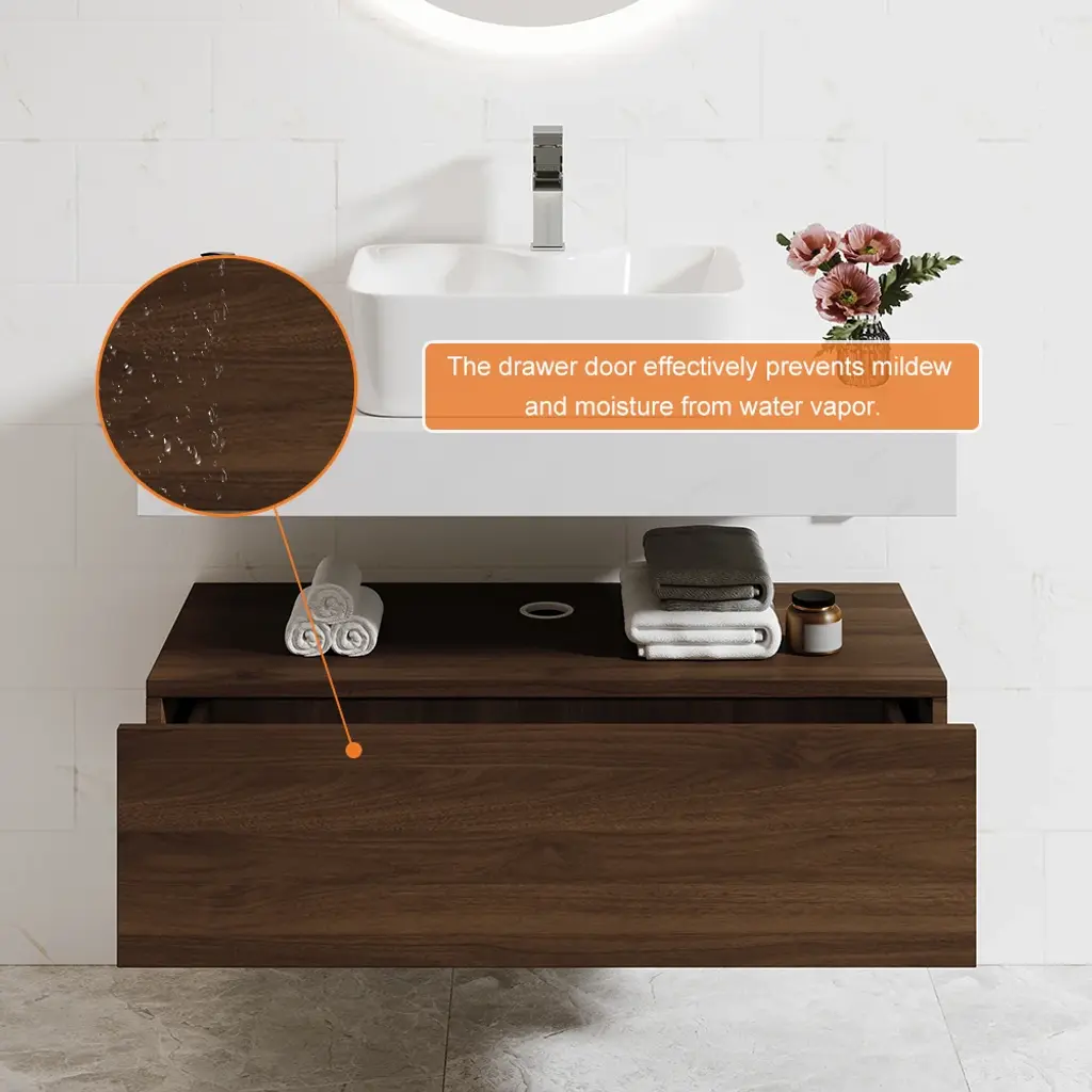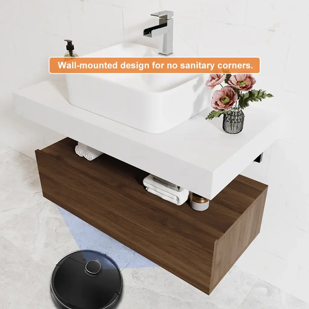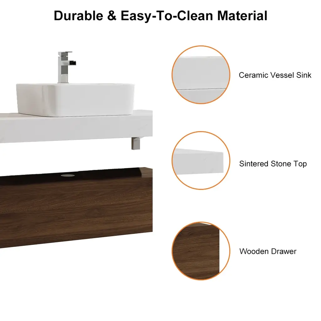 Elevate your bathroom with this 35.4" wall-mounted bathroom vanity. It features a durable sintered stone countertop, a modern rectangular vessel sink, and soft-close storage with a concealed cabinet. Sleek chrome hardware completes the minimalist look, offering both style and functionality.