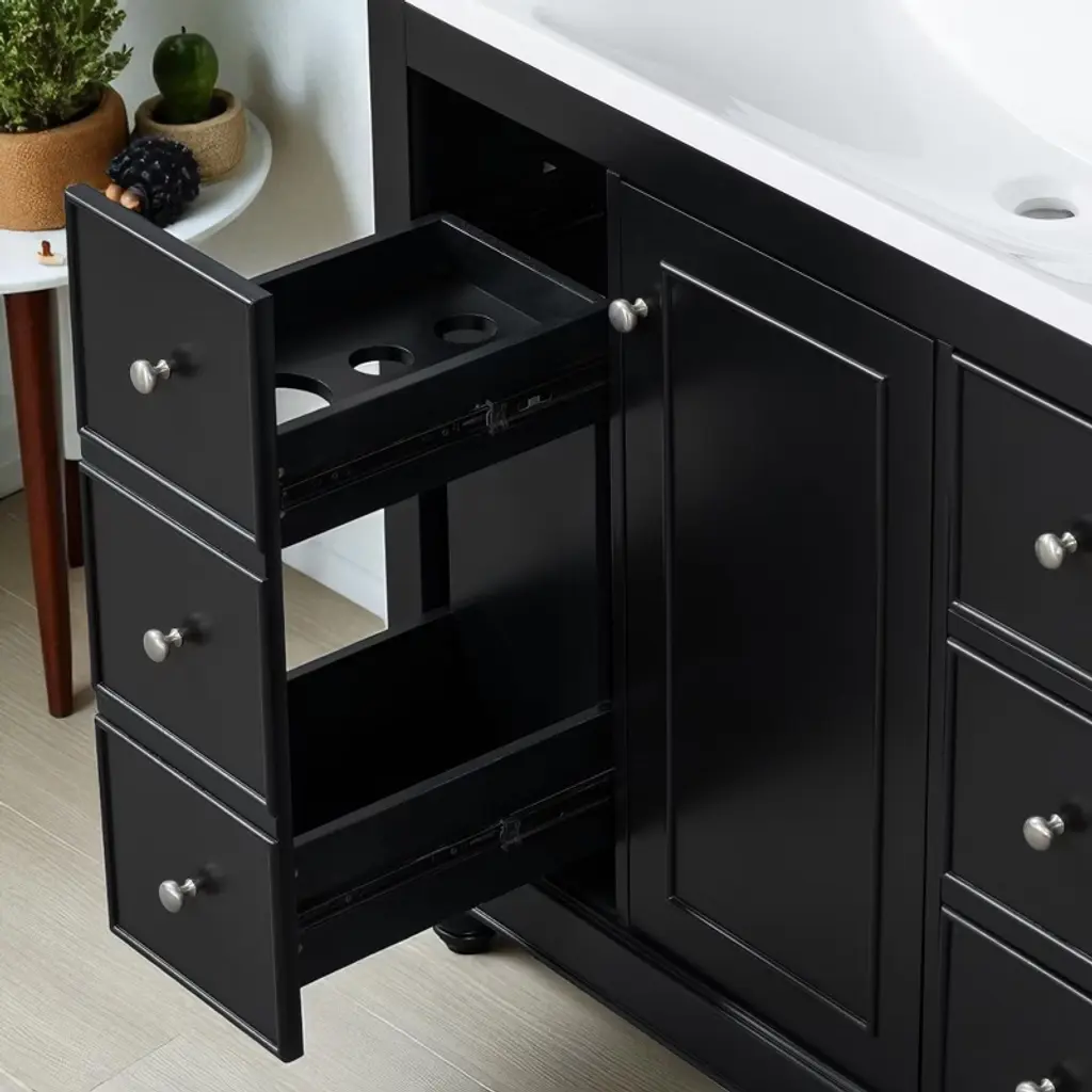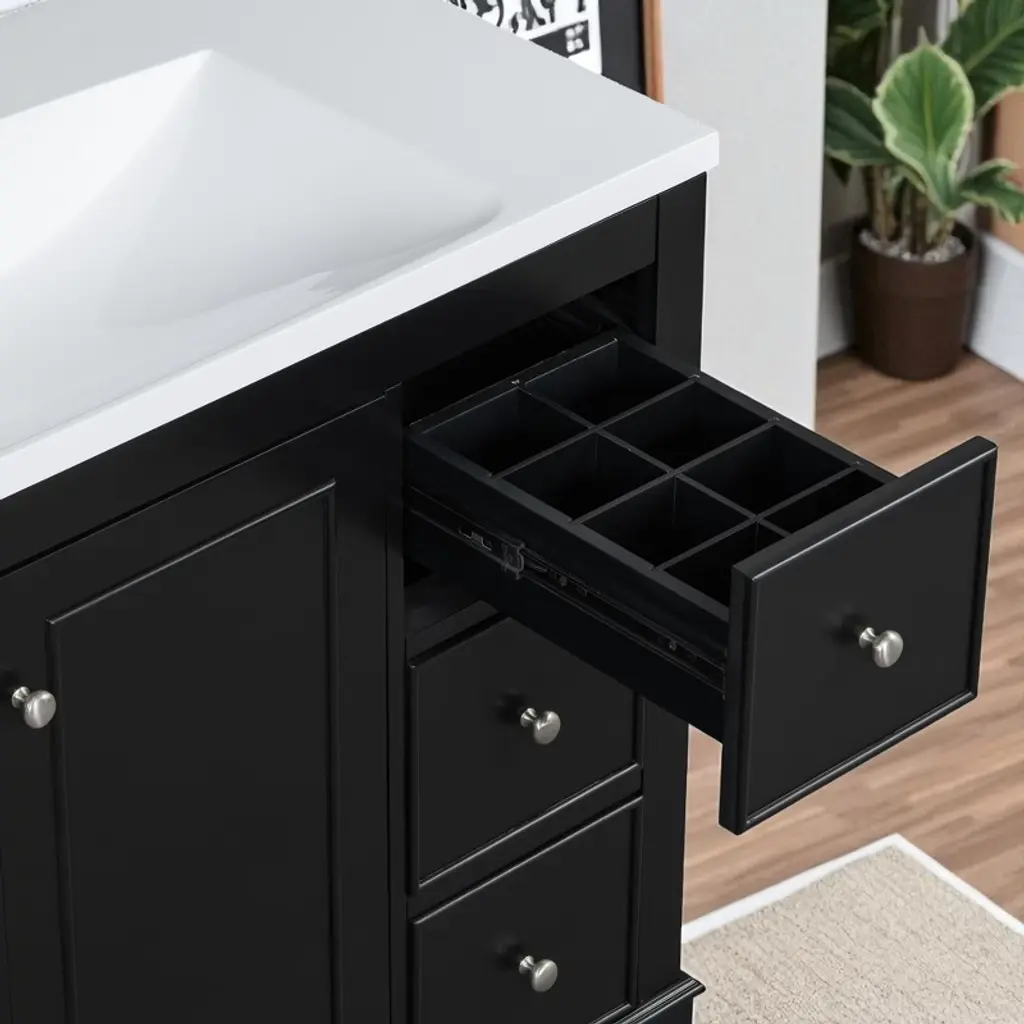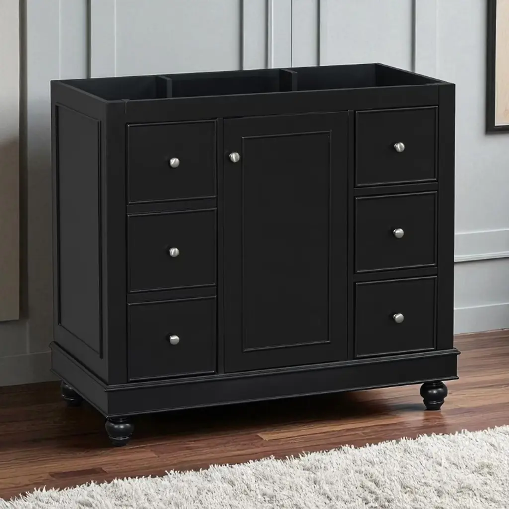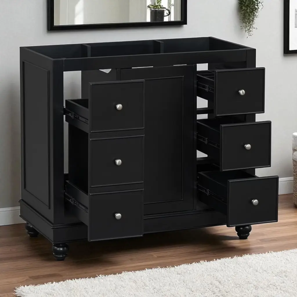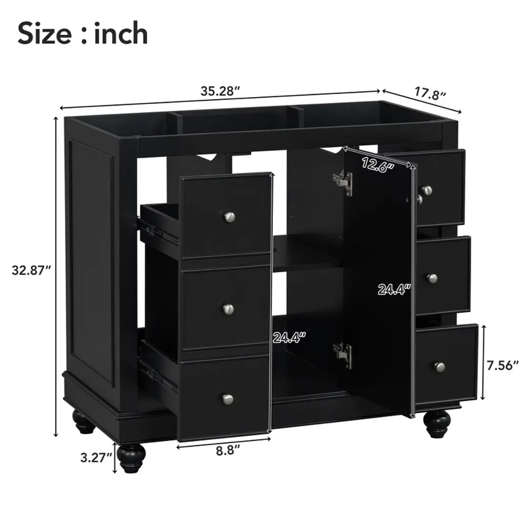 Product Overview This 36-inch bathroom vanity cabinet (sink not included) combines practicality and timeless design. Built with a solid wood frame and durable MDF, it offers lasting stability while providing versatile storage with four drawers and a cabinet door. The open-back design ensures easy plumbing installation, making it an ideal choice for modern bathrooms. Specifications Product Type: Bathroom Vanity (Cabinet Only) Main Material: Solid Wood + MDF + Resin Use Case: Bathroom Finish: Painted Finish Number of Doors: 1 Number of Drawers: 4 Shelves: Adjustable Assembly: Assembly Required Product Features [Premium Construction] Crafted with a solid wood frame and sturdy MDF for long-term durability. [Ample Storage] Includes 4 drawers and 1 cabinet door, providing versatile storage for toiletries, towels, and daily essentials. [Adjustable Shelves] Flexible shelving lets you organize and customize interior space to fit items of different sizes. [Open-Back Design] Easy access to plumbing and simplified installation process. [Soft-Close Hardware] Features high-quality metal handles and soft-close components for quiet, smooth use. [Easy Assembly] Comes with detailed step-by-step instructions and hardware for quick setup. Product Dimensions Overall: 35.25"W x 18.00"D x 33.00"H Product Weight: 86.86 lbs Suitable Scenarios Ideal for primary bathrooms, powder rooms, or guest baths where efficient storage and flexible sink pairing are desired. Its neutral design suits both modern and transitional interiors. Notes 1. Real product color may slightly differ due to lighting or monitor display. 2. Manual measurement has been used; reasonable variations may exist.
