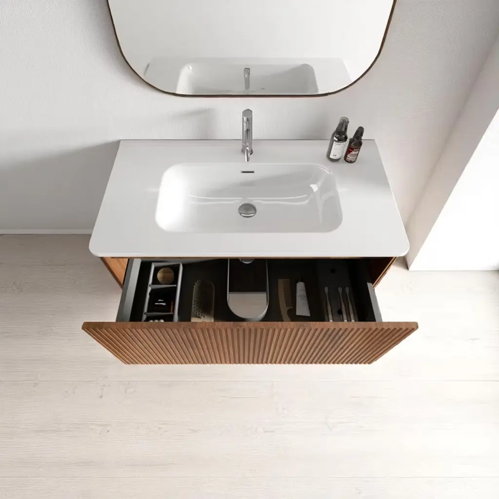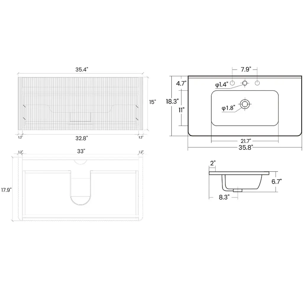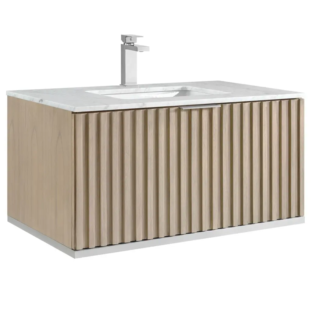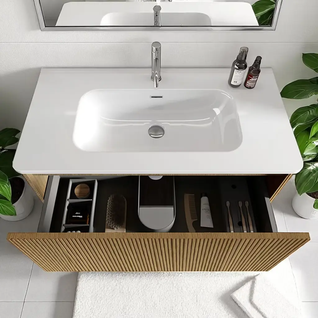 Product OverviewRedefine your bathroom with the Floating Bathroom Vanity – a stylish, space-saving solution that combines modern aesthetics with practical function. Featuring a fashionable striped light oak texture, soft curved edges, and a sleek, integrated ceramic sink, the vanity offers the perfect balance of elegance and everyday convenience. Designed to maximize under-sink space and elevate any bathroom with contemporary charm, this vanity is ideal for small spaces where beauty and efficiency are equally essential.Product FeaturesModern Striped Oak Finish: Showcasing a fashionable light oak wood grain with vertical striping, this vanity adds warmth and sophistication to your bathroom decor.Curved Edge Design: Safety meets style with gracefully curved corners that reduce sharp edges while creating a smooth, modern silhouette.Glossy Integrated Ceramic Sink: The high-gloss, white ceramic sink features a seamless one-piece design that resists stains and is easy to clean, enhancing both form and function.Push-Open Drawer Mechanism: Eliminate bulky handles and enjoy minimalist functionality with a push-to-open drawer that glides smoothly for easy access.Spacious Interior Storage: With over 12 inches of drawer height, the vanity provides ample space for towels, toiletries, and other bathroom essentials, helping you maintain a clutter-free space.U-Shaped Wall Fitting: A smart U-shaped drawer cutout accommodates plumbing without sacrificing storage, increasing usable drawer space by up to 50%.Premium MDF & PVC Lamination: Built from moisture-resistant MDF and wrapped in a soft-touch PVC film, the vanity offers durability, smooth texture, and resistance to daily wear.Quality DTC Hardware: Rust-proof and corrosion-resistant hardware ensures long-lasting drawer performance, even in humid bathroom conditions.SpecificationsProduct Dimensions: 35.8"" W x 18.3"" D x 15.6"" HTotal Weight: 91.7 lbsMaterial: MDF body with PVC film finishSink Type: Integrated ceramic sinkMounting Type: Wall-mounted / FloatingStorage: 1 push-open drawer with U-shaped plumbing cutoutFinish: Striped light oak with natural wood grain appearanceHardware: DTC brand soft-close, rust-resistant drawer glidesInstallation: Ships flat-packed, assembly requiredSuitable ScenariosPerfect for small to mid-sized bathrooms, apartments, condos, and powder roomsIdeal for homeowners seeking a modern, handle-free, space-efficient vanityComplements minimalist, Scandinavian, and modern farmhouse interiorsNotesFaucet not included. Compatible with standard plumbing configurations.Assembly required. Installation hardware and detailed instructions included.Color and grain may vary slightly due to lighting and screen display.