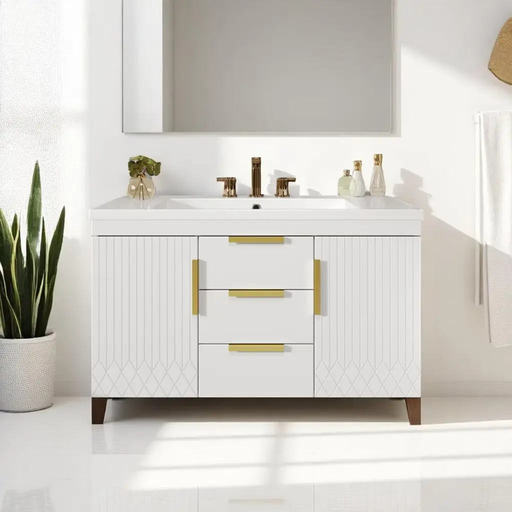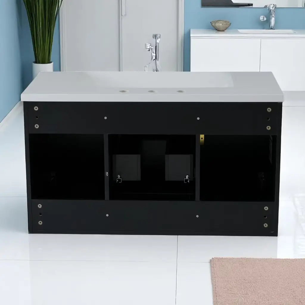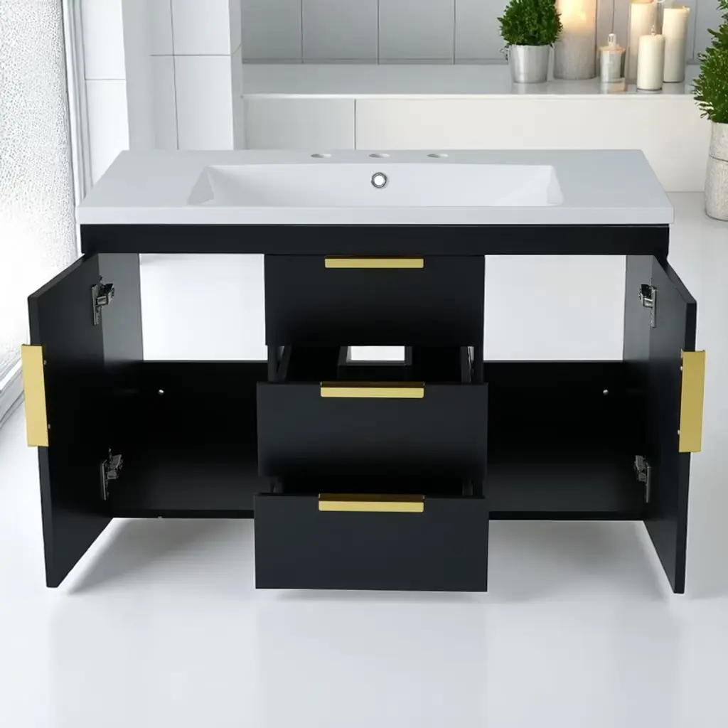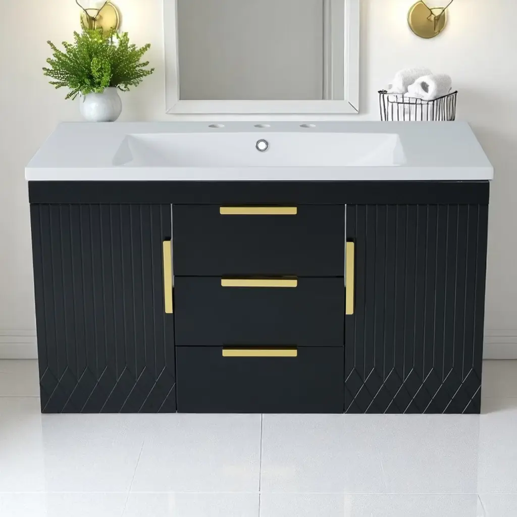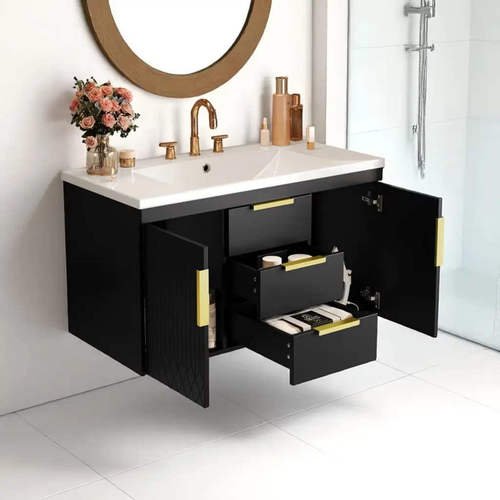 Product OverviewUpgrade your bathroom with this 36-inch wall-mounted vanity set, thoughtfully designed for style, functionality, and durability. Featuring a sleek black finish, a spacious resin sink, and soft-close drawers and doors, this floating bathroom cabinet maximizes storage while saving valuable floor space. Whether you’re furnishing a compact bathroom or seeking a modern upgrade, this vanity provides a perfect balance of elegance and practicality.Product FeaturesIndependent Bathroom Vanity: The unique pattern on the cabinet surface adds a refined visual appeal that comes alive under ambient lighting, enhancing any contemporary bathroom décor.Wall-Mounted Floating Design: This space-saving floating vanity frees up floor area for easy cleaning and contributes to a clean, streamlined bathroom aesthetic. Ideal for smaller bathrooms or modern interiors where minimalism is key.Durable MDF Construction: Built with high-quality MDF board and metal hardware, this vanity offers outstanding strength, moisture resistance, and long-lasting reliability.Reinforced Wall Support: Includes an additional cleat for extra support. Successfully pressure-tested on drywall, wood, solid, and plastered walls to ensure secure installation and user safety.Spacious Resin Sink: The integrated 36” x 18” resin sink features a smooth, easy-to-clean surface and includes three pre-drilled holes for an 8"" centerset faucet (faucet not included).Optimized Storage: Two soft-close drawers and two cabinets provide generous storage space for toiletries, towels, and daily essentials. Smooth sliding rails and premium hinges ensure quiet and effortless operation.Easy Assembly & Packaging: Comes in two packages—one for the cabinet and one for the basin—to reduce damage during transit. All hardware and clearly marked components are included for a straightforward installation experience with 2–3 people.SpecificationsOverall Dimensions: 36"" L x 18"" W x 20.3"" HSink Dimensions: 36"" L x 18"" W x 6.5"" HCabinet Dimensions: 35.5"" L x 17.9"" W x 19.3"" HSink Basin Interior: 23"" L x 12.8"" WTotal Weight: 84.11 lbs (Sink: 27.23 lbs / Cabinet: 56.88 lbs)Weight Capacity: Overall: 220.46 lbs / Panel: 66.14 lbs / Drawer: 11.02 lbsMaterial: Cabinet – MDF, Sink – Resin, Hardware – MetalColor: BlackMounting Type: Wall-MountedFaucet Compatibility: 8"" Centerset (not included)Assembly Required: Yes (Recommended: 2–3 adults)Country of Origin: MalaysiaSuitable ScenariosIdeal for urban bathrooms, powder rooms, and compact spaces where floor space is limitedPerfect for contemporary or minimalist bathroom remodels seeking a sleek, floating lookNotesColor may vary slightly due to lighting, monitor settings, and display resolution.Faucet, drain, P-trap, and mounting bracket are not included.To prevent damage during shipping, product is delivered in two separate packages.