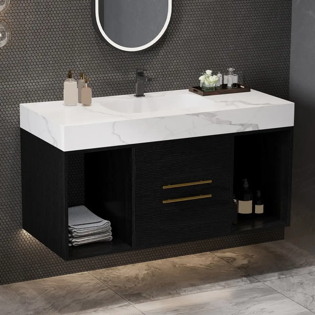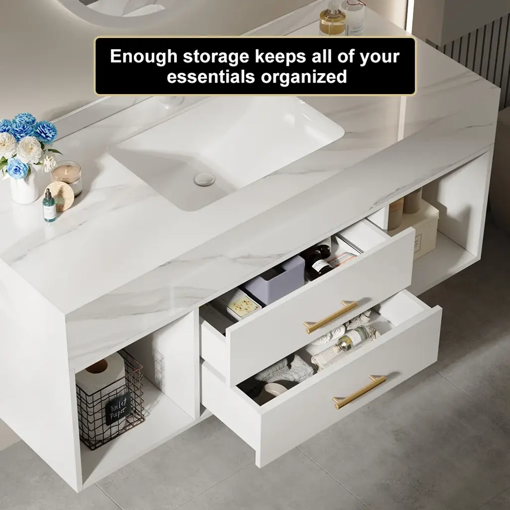 Elevate your bathroom with this 39.4" floating bathroom vanity. Its sintered stone top and undermount ceramic sink offer sleek style, while two soft-close drawers provide ample storage. Wall-mounted to save space, it’s the perfect blend of minimalist design and function for modern bathrooms.