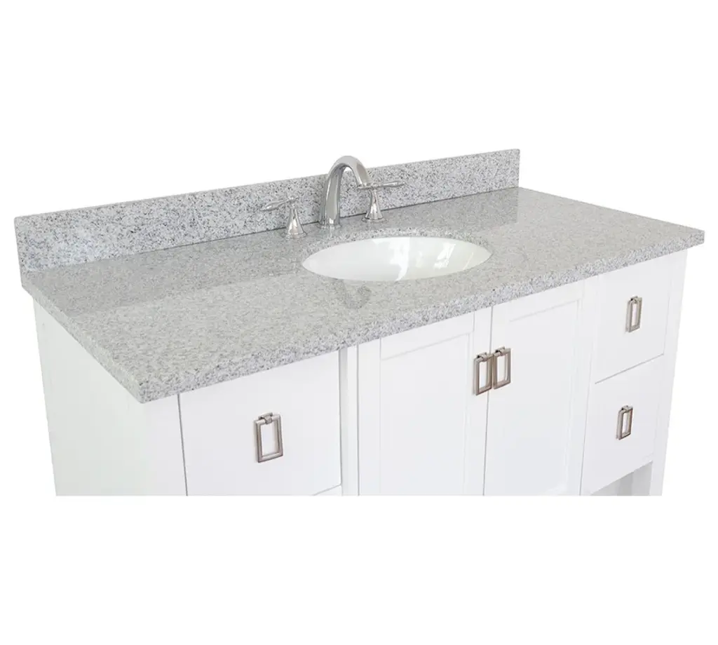 The Monterey collection by Bellaterra Home features simple style bathroom vanities that can accomplish any home design. From the cottage to the cabin or to the grand home design, you will appreciate this beautifully hand crafted piece of furniture as the focal point in your bathroom. The structure of the cabinet is built with solid oak and has full corner block on all corners for stability and to also provide additional support for the counter top. The 4 extra deep full-size drawers are constructed with English dovetail and installed with smooth under mount full extension glides. It provides durability and ample storage. It is hand applied with multiple layers of ecofriendly stain and top coat to prevent pealing, cracking and fading. The interior finish is consistent throughout and matches the exterior finish. The 2 center doors open to one big storage space that can be configured to fit personal storage needs. Solid nickel finish hardware completes the elegant look. The bottom of the cabinet has an open shelf for additional storage or for decorative items. Each cabinet is configured to work with our variety of countertops or any standard sized tops. This collection is offered in a variety of finishes, Brown Ash (Dark brown), Glacier Ash (White), White. This elegant bathroom vanity top features a 1.3” thick Gray granite preinstalled with a white undermount cUPC certified oval ceramic sink and a matching 4 in. H. backsplash for utmost beauty and functionality. It will easily match many home interiors. The vanity top is pre-drilled with 3 holes for an 8” widespread faucet and fits directly on top of a standard vanity cabinet (sold separately). Bellaterra Home’s counter tops are pre-sealed and polished for added protection. All genuine stone material has its variation of veining pattern and color; every top will be slightly different.