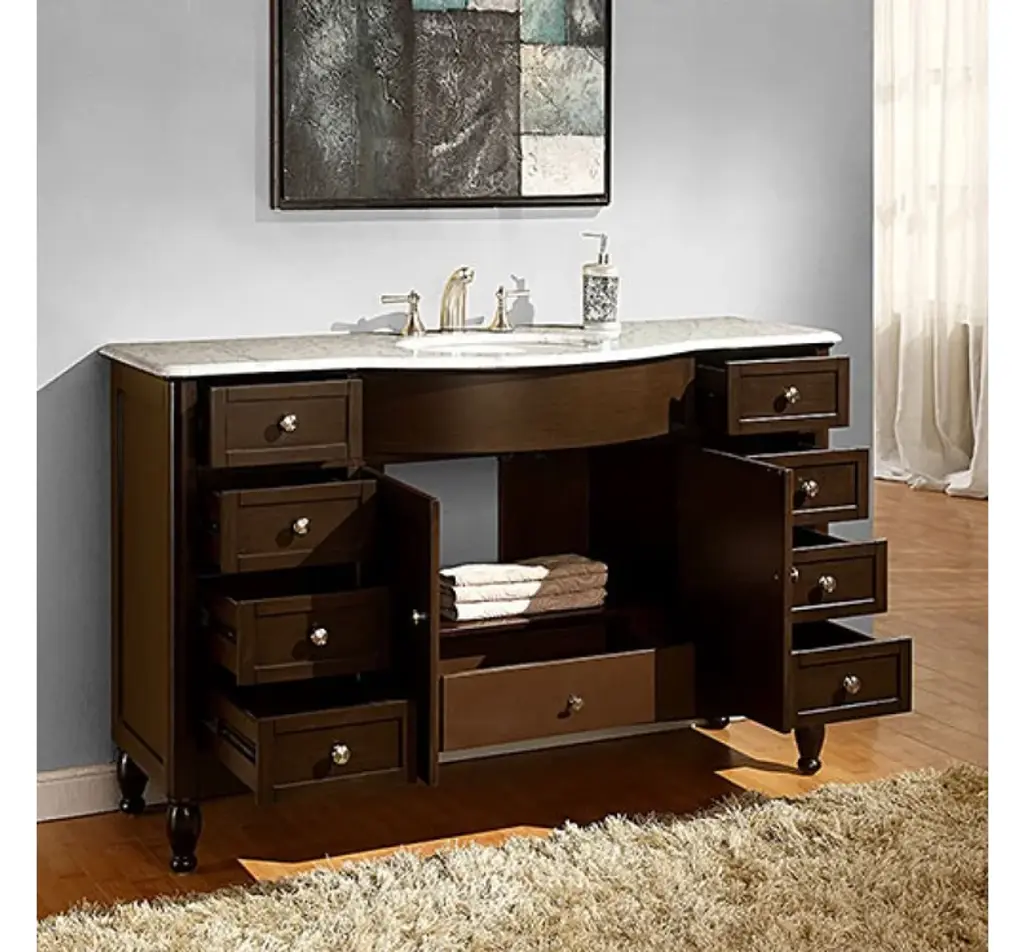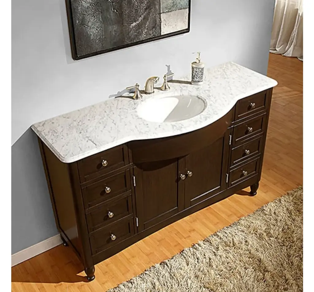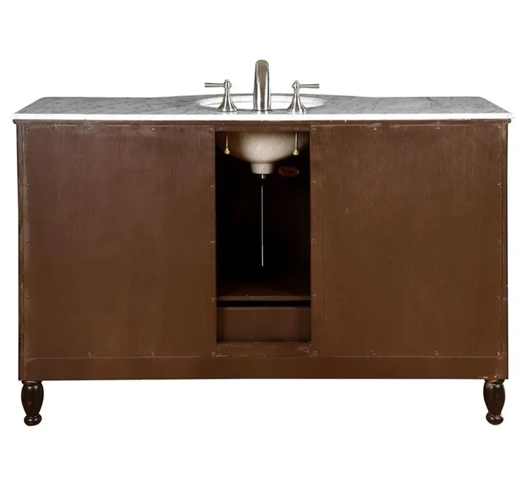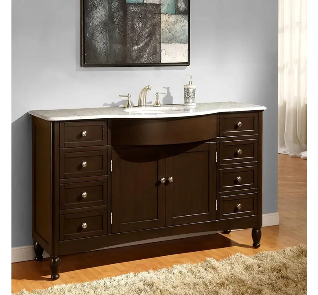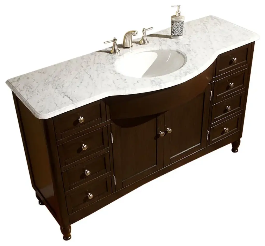 This 58 inch Traditional single sink bathroom vanity is a perfect center piece for your bathroom project. This Dark Walnut bathroom vanity features 2 Doors, 9 Drawers , and a Carerra White Marble counter top with a 16 inch Undermount White Ceramic sink that is Pre-Drilled for Standard Three Hole 8 inch Center (Not Included) faucet. Large opening in back for easy plumbing installation.Included: Base Cabinet, CountertopNot Included: Backsplash, FaucetDimensions: 58"W X 22"D X 36"H (Tolerance: +/- 1/2")Style: TraditionalVanity Type: Vanity with TopMounting Type: FreestandingCountertop Included: YesBacksplash Included: NoSink(s) Included: YesNumber of Sinks: One SinkSink Type: UndermountSink Material: CeramicSink Dimensions: 16" Under Mount White CeramicFaucet Included: NoFaucet Type: WidespreadFaucet Holes Per Sink: 3Overflow Drain Included: NoBase Material: Manufactured WoodFinish: Dark WalnutWood Tone: Dark WoodNumber of Drawers: 9Dovetail Drawers: NoNumber of Doors: 2Soft Close Doors: NoNumber of Shelves: 0Shelves Adjustable: NoShelves Removable: NoHardware Finish: Satin NickelMirror Included: NoAdditional Details:Open back fits all plumbing typesHandles and pulls are shipped screwed to the inside of each door or drawer; simply unscrew and attach them to the outsideDo not use harsh cleaning productsDo not use products that contain lemon, vinegar or other acidsProlonged exposure to sunlight may cause discolorationPeriodic resealing is recommended for stone countertopsAccommodates a standard size drain and p-trap (sold separately)