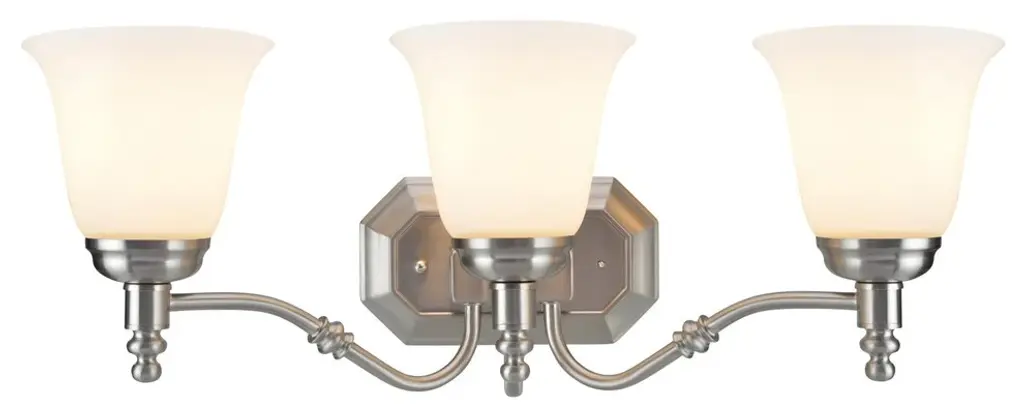Aspen Creative is dedicated to offering a wide assortment of attractive and well-priced portable lamps, kitchen pendants, vanity wall fixtures, outdoor lighting fixtures, lamp shades, and lamp accessories. We have in-house designers that follow current trends and develop cool new products to meet those trends. Product Detail• 3 Light bathroom lighting fixture in Satin Nickel with Frosted Glass shade• Fixture Dimensions: 8" Deep x 23" Wide x 9" Height• Requires 3 medium base light bulb, 60 watt max (not included)• UL listed for bathroom wall installation above the mirror and vanity cabinet as well as powder rooms and make up rooms