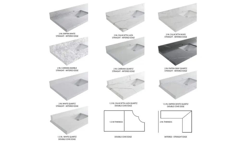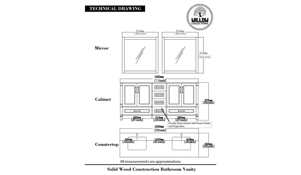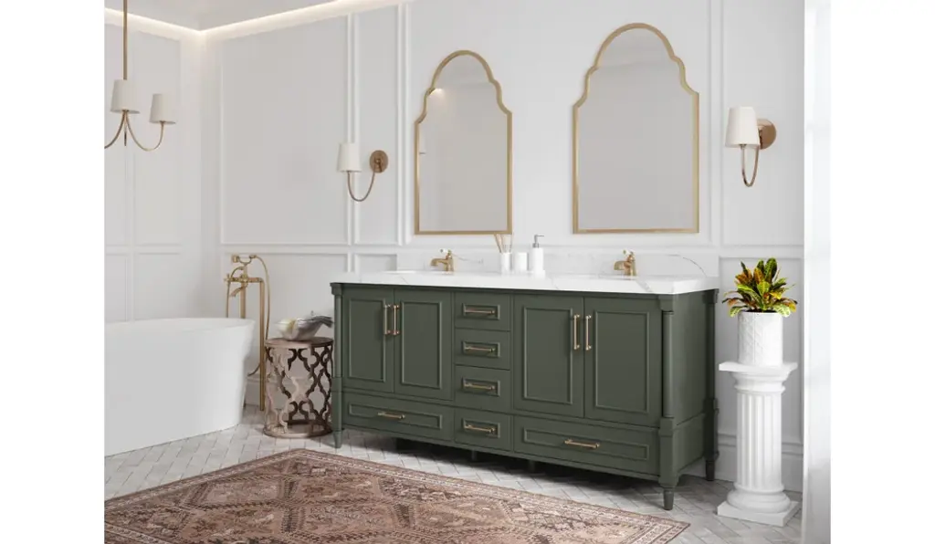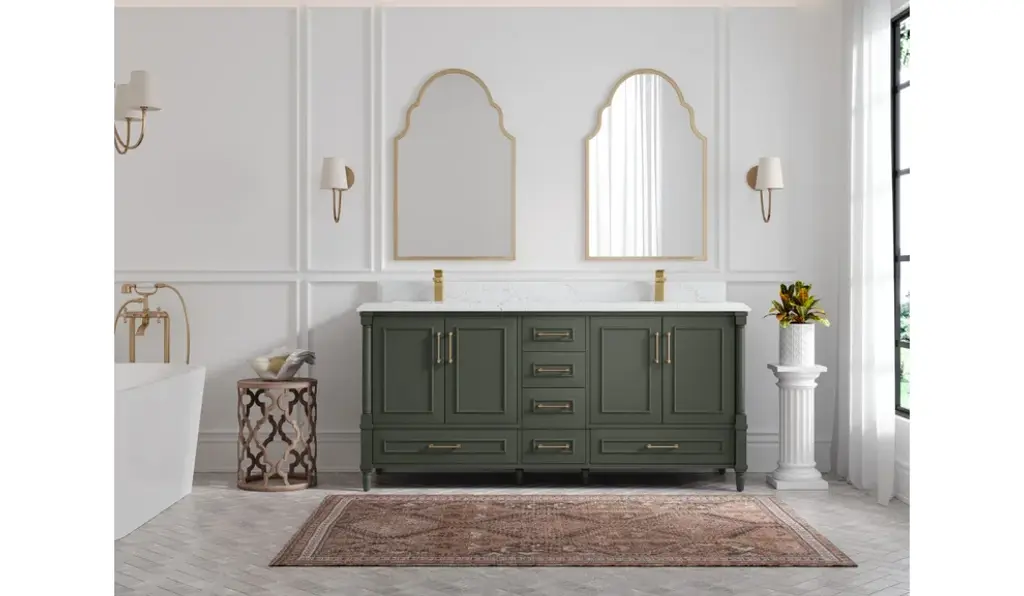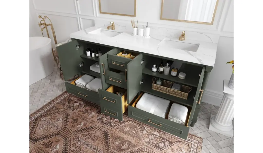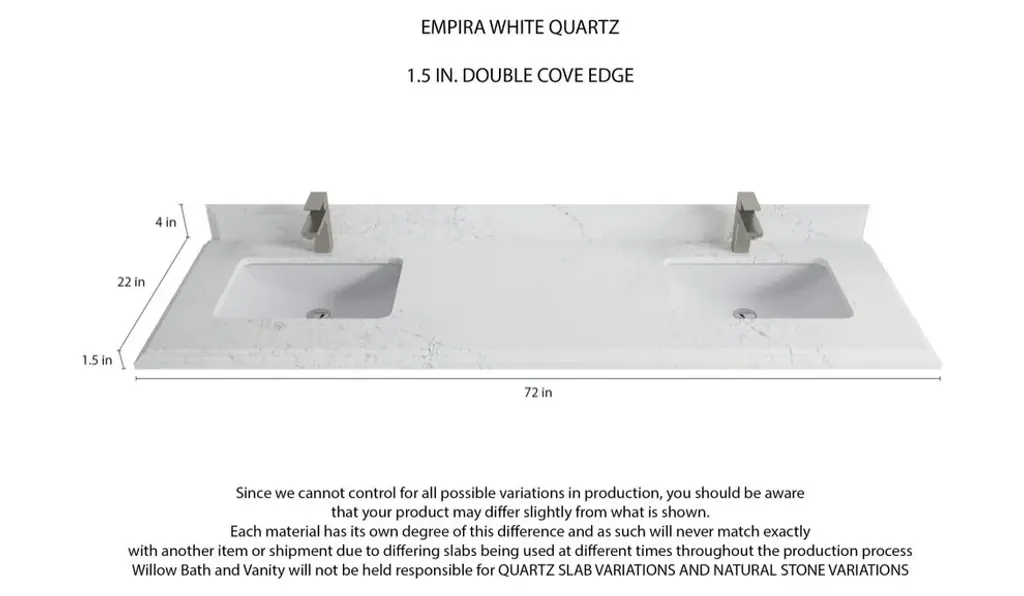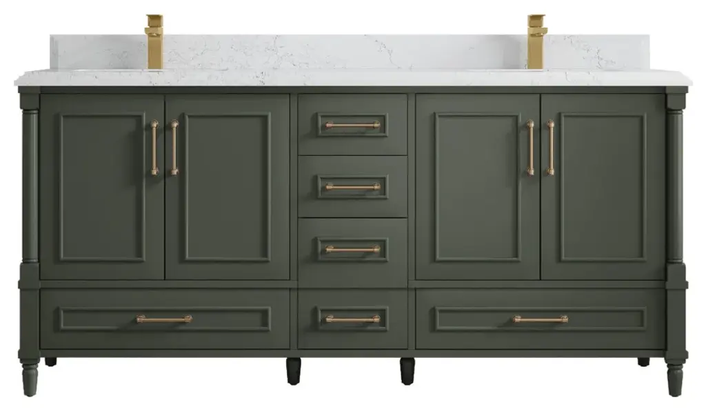 Willow Collection Aberdeen 72 x 22 Double Sink Bath Vanity in Pewter Green with with 1.5" Cove Edge Empira QuartzWhen it comes to designing your dream bathroom, nothing beats bringing in a piece like the Aberdeen vanity. With its classic, traditional style, and spacious storage options, this freestanding vanity is the perfect addition to any bathroom. Whether you prefer clean, modern lines or more ornate design details, the Aberdeen vanity has something for everyone. Not only does it offer ample room to store all your toiletries and bath accessories, but it also seamlessly blends into any existing decor, giving your entire bathroom a sense of style and sophistication. This Aberdeen vanity features a handy power plug and hairdryer holder that is available in sizes starting from 42 in up to 84 in. With its stylish design and practical features, this vanity is a great addition to any bathroom.Details:Material: Birch Wood and Plywood (NO MDF or PRESSBOARD)Finish Available: White, Black, Pewter Green, Dark Forest Green, Hale Navy Blue, Coventry Gray, Evergreen, Black TopNumber of Drawers: 4 Regular Drawers, 1 Double Drawer with Power Plug and Accessories (Deep), 2 ShelvesSink Installation: Under-mounted rectangle SINK(S)Hardware: Soft closing hinges and sliderHardware Finish : GoldCabinet Width: 71 (in.)Cabinet Depth: 21-1/2 (in.)Countertop Width: 72 (in.)Countertop Depth: 22 (in.)Cabinet Height: 34 (in.)Countertop Height: 1.5 (in.) Double Cove Edge or 2 (in.) Straight/ Mitered EdgeCabinet Height with Top: 36 (in.)Backsplash Height: 4 (in.)Faucet: NOT IncludedFaucet Hole(S): Comes with SINGLE hole faucetVanity Countertops options: Mitered /Straight edge or Double Cove Edge (White Quartz, Calacatta Laza Quartz, Calacatta Nuvo Quartz, Carrara Quartz, Empira Quartz, Carrara Marble, Piatra Gray Quartz, Pearl Light Gray Quartz, Venatino Quartz, Calacatta Gold Quartz, Calacatta Black Quartz)