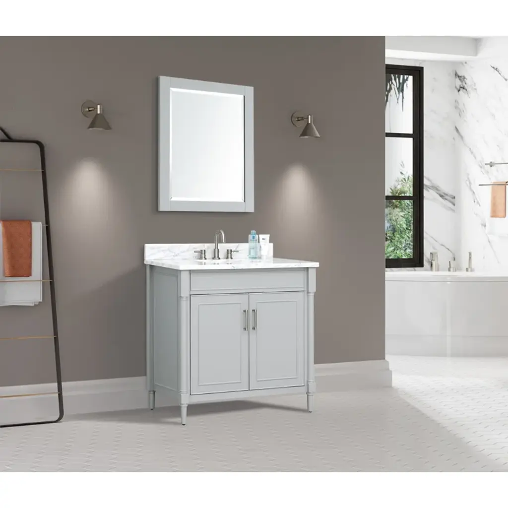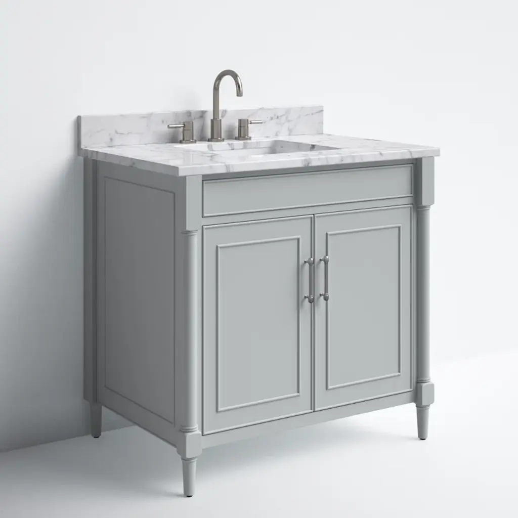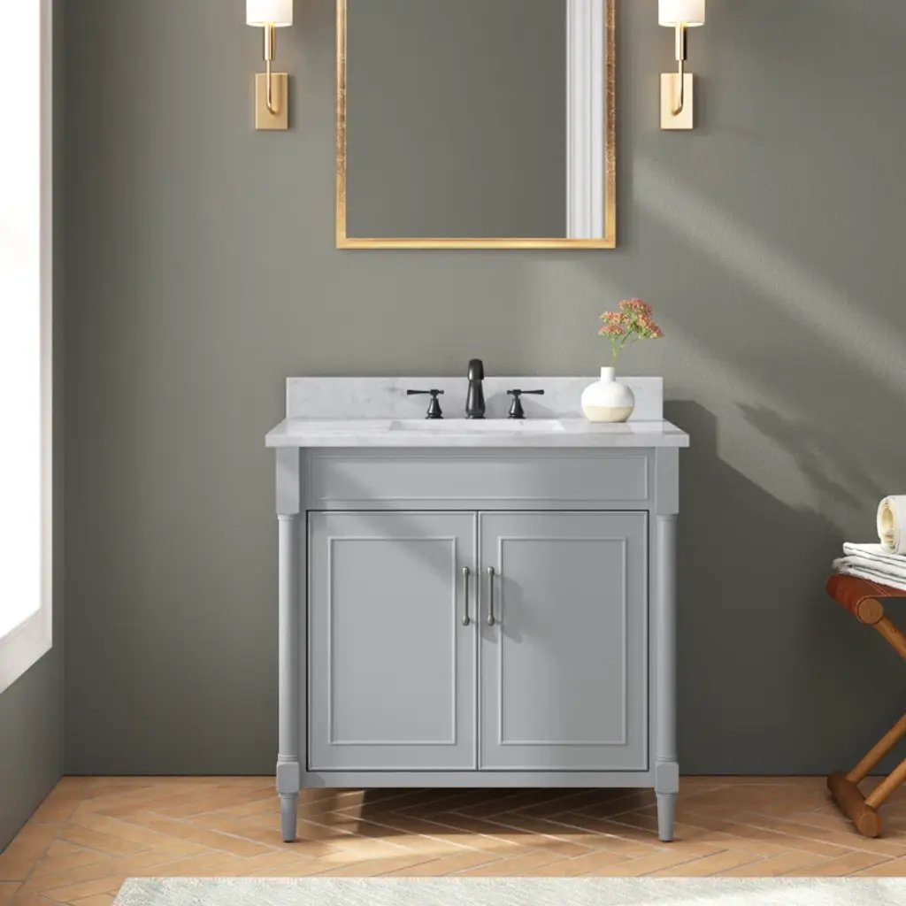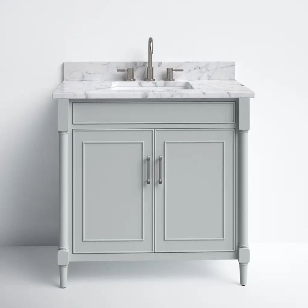 This freestanding single vanity adds an elevated look to your bathroom with its gleaming hardware and turned detailing. It features a white marble countertop with a built-in backsplash, and the Vitreous china under-mount sink has a rectangular shape for an on-trend look we love. Two soft-close doors open to reveal hidden storage for extra linens, toiletries, and bathroom must-haves. This vanity is compatible with a widespread faucet (sold separately), and it's fully assembled, so it's ready for installation the moment it arrives.