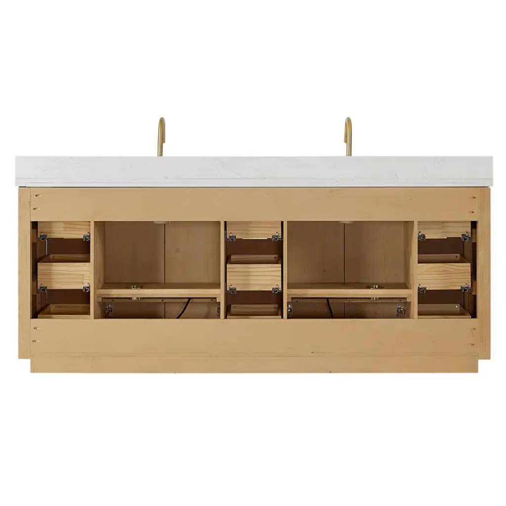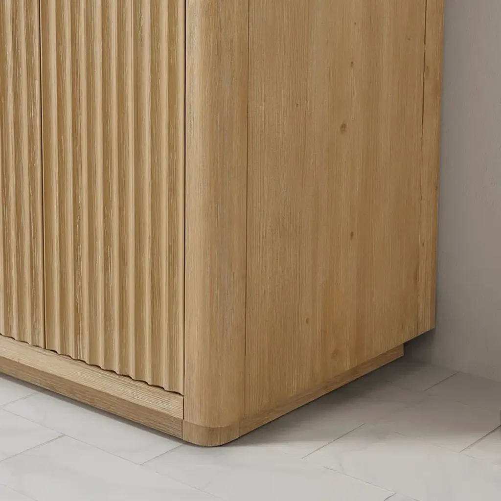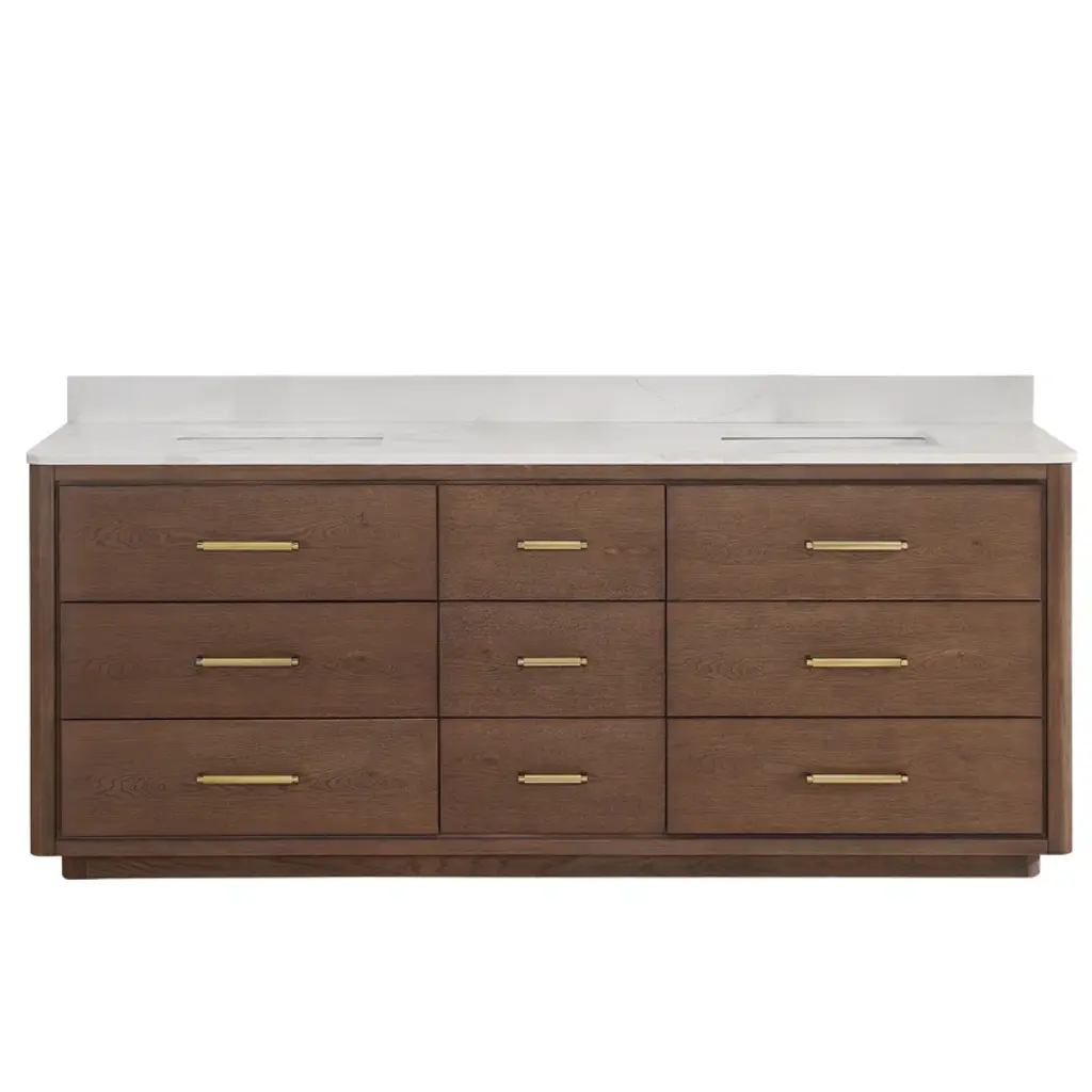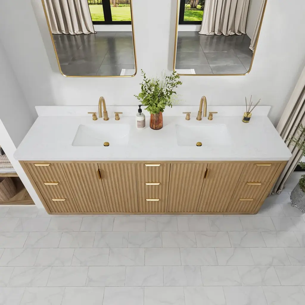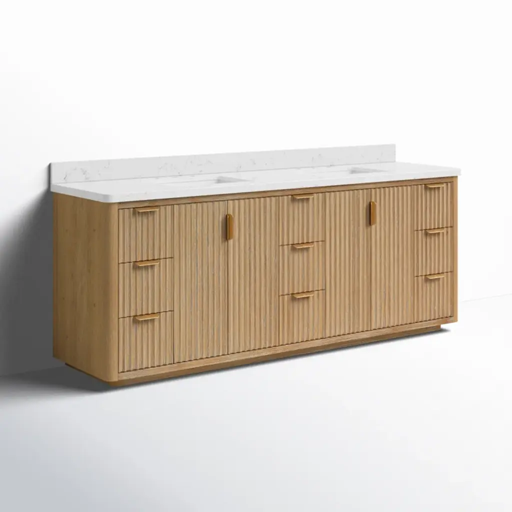 Our freestanding double vanity set gives you a spacious spot in your bathroom to get ready for the day. It has a solid wood base that comes in a bold finish with corrugated fronts for a hefty dash of dimension. Nine functional drawers and two cabinets, each with double doors, provide ample room to house towels and toiletries. A stone countertop and backsplash measure 84" wide and include two ceramic undermount sinks – faucets sold separately. And our favorite part? There are integrated power and USB outlets and a hair dryer holder on one of the cabinet shelves.