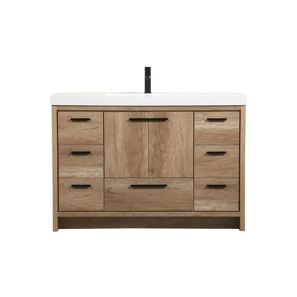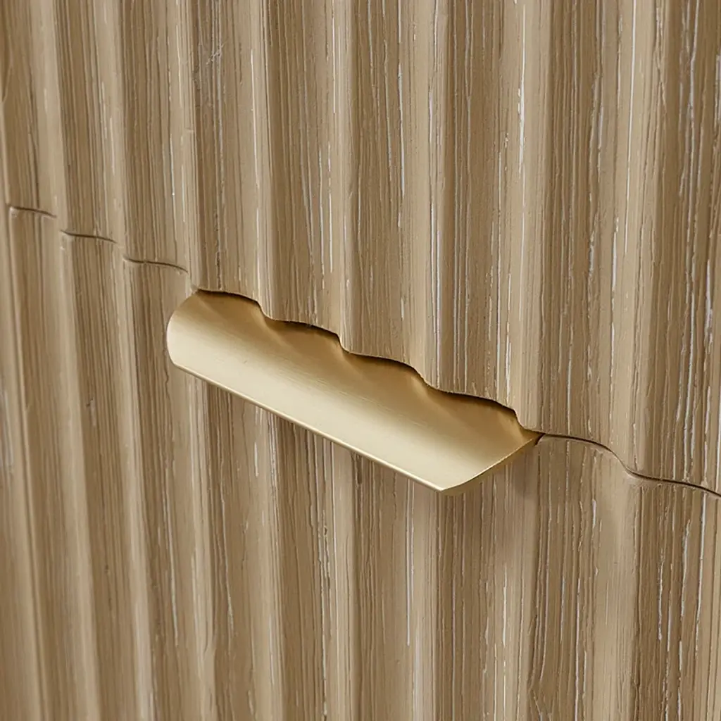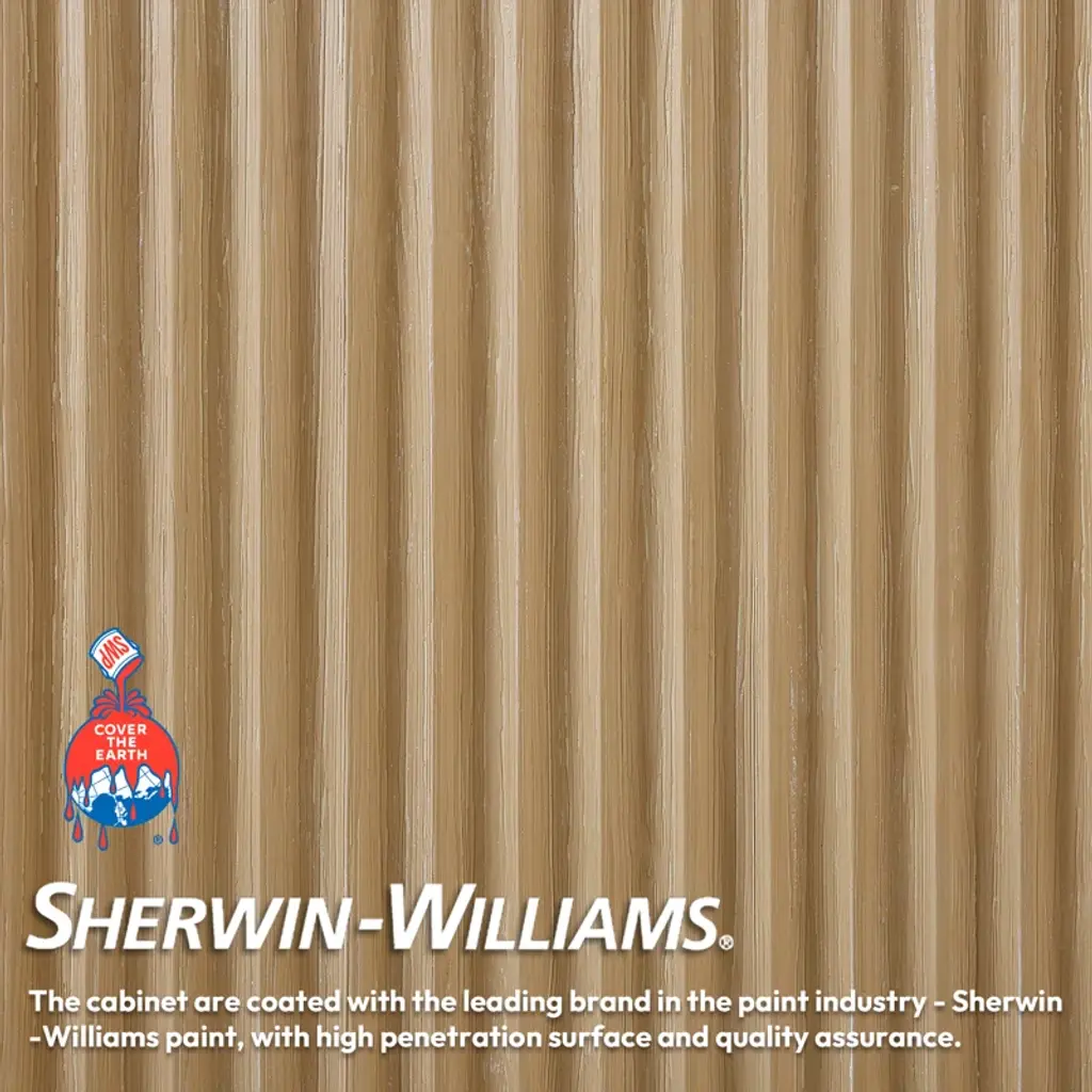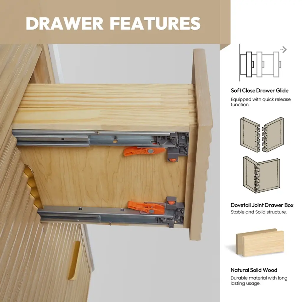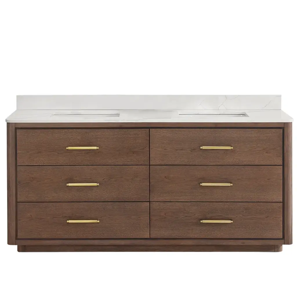 Our freestanding double vanity set gives you a spacious spot in your bathroom to get ready for the day. It has a solid wood base that comes in a bold finish with corrugated fronts for a hefty dash of dimension. Nine functional drawers and two cabinets, each with double doors, provide ample room to house towels and toiletries. A stone countertop and backsplash measure 84" wide and include two ceramic undermount sinks – faucets sold separately. And our favorite part? There are integrated power and USB outlets and a hair dryer holder on one of the cabinet shelves.
