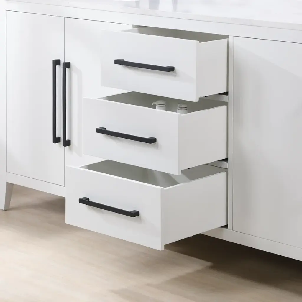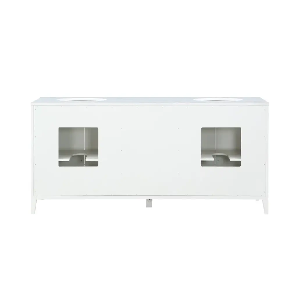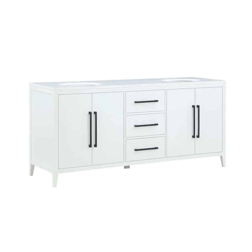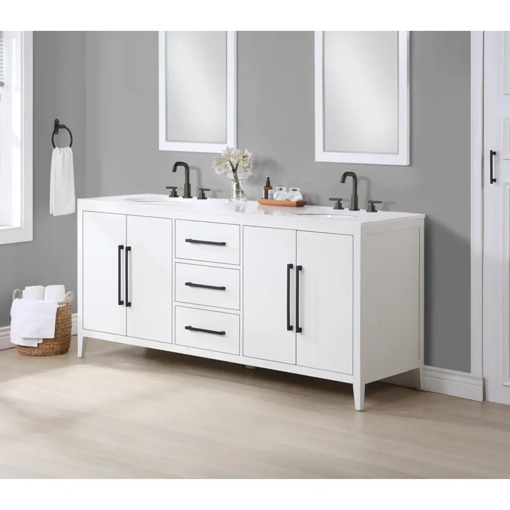 This freestanding double-bathroom vanity adds a two-tone look, clean lines, and plenty of mid-century modern style to your bathroom. The base is made from engineered wood with a neutral finish, and it is topped with a crisp white quartz countertop. Two oval under-mount sinks are included, creating a clean, seamless look. The two sets of double doors and three drawers have hardware for plenty of contrast. And splayed legs give it a mid-century silhouette. Plus, this vanity has shelves inside the cabinets and plenty of drawer space for all your towels and toiletries.