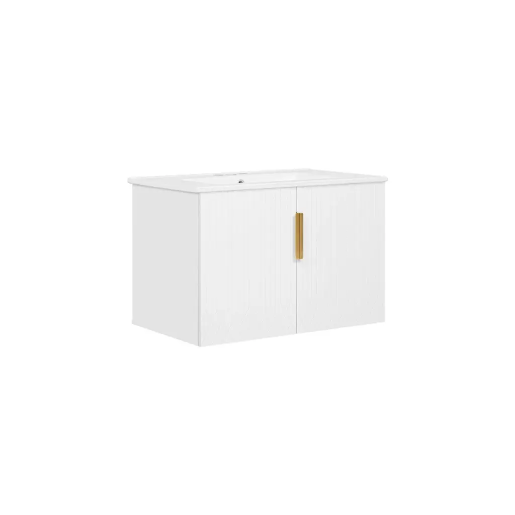 Its sleek striped finish, paired with elegant hardware and a wall-mounted design, adds a modern touch to any bathroom. Featuring a smooth, glossy white ceramic basin that resists stains and water spots for easy cleaning.