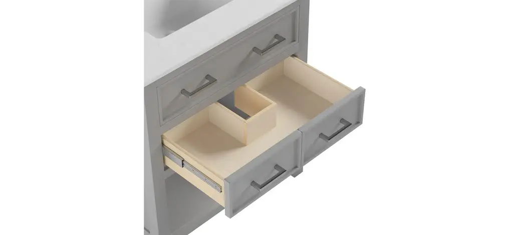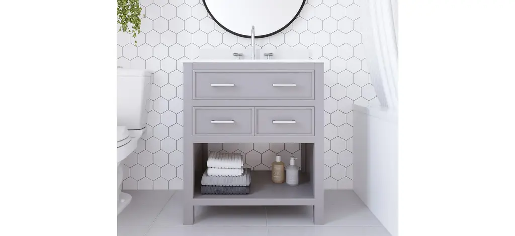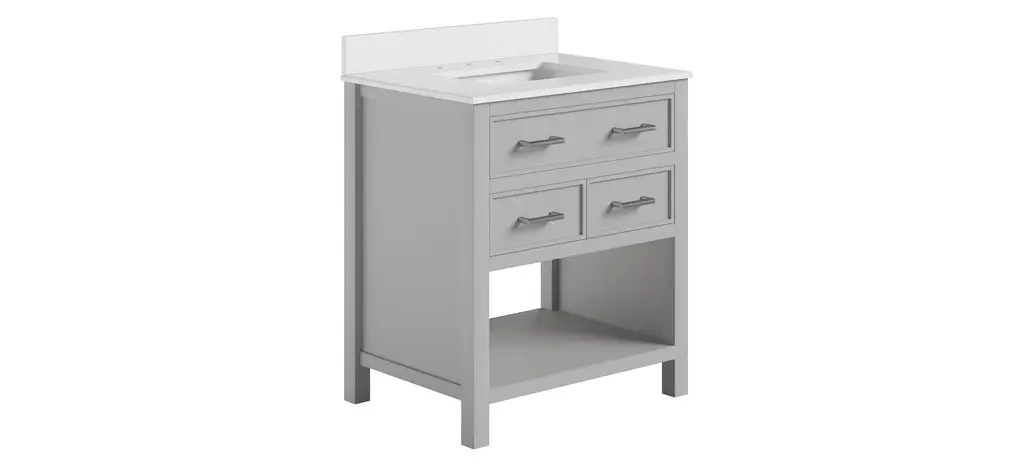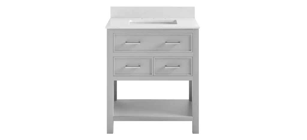 Whether you're a lover of east coast or west coast style, it doesn't matter with the Alabama 30" Bathroom Vanity. Able to traverse each side of the decor spectrum, this transitional styled must-have can take your bathroom to another level. Quality made with the use of solid and engineered wood, this durable accessory will quickly change the look of your space without a hefty investment and give you needed storage in the form of a 2-compartment drawer and an open shelf. Constructed with a sleek built-in rectangular ceramic sink, its modern composite Carrera engineered stone countertop will leave you in awe while the countertop's inherent non-porous, easy clean and scratch-resistant properties will simultaneously make day-to-day life easier. Pre-drilled holes also allow for the easy installation of an 8" widespread faucet (not included).