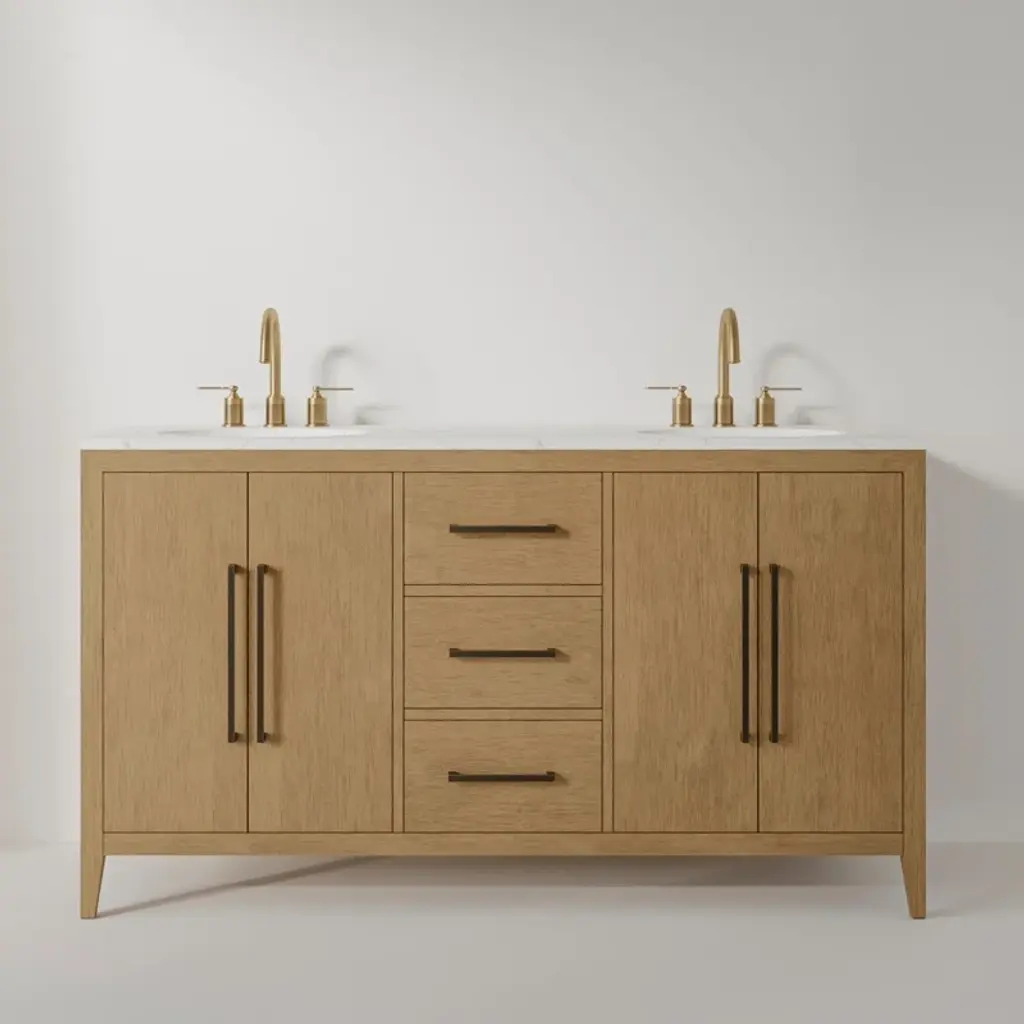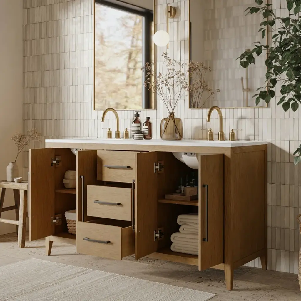 Bring mid-century style and modern functionality to your bathroom with this striking vanity. Add an airy warmth to the solid wood frame. The pure white quartz top is both sleek and functional. Soft-closing doors and drawers provide smooth access to ample storage space.