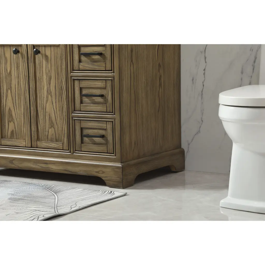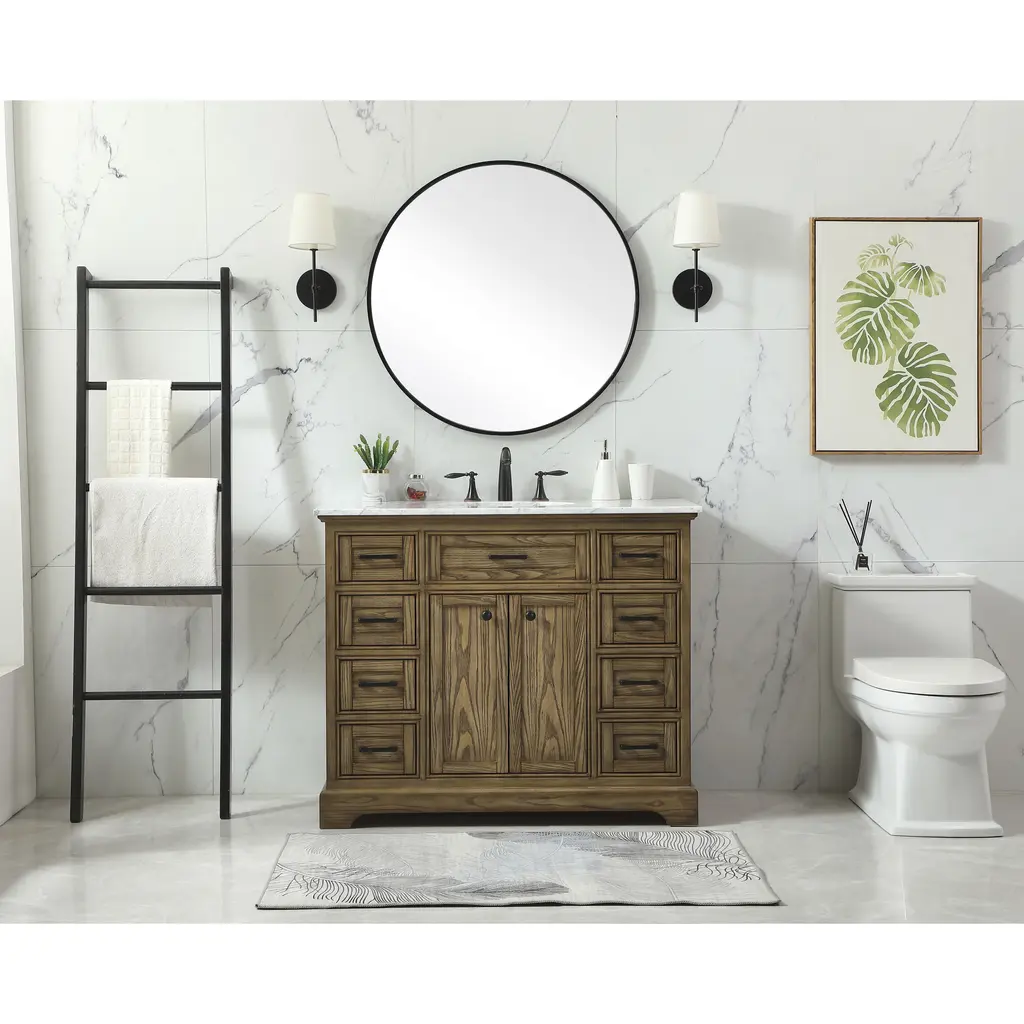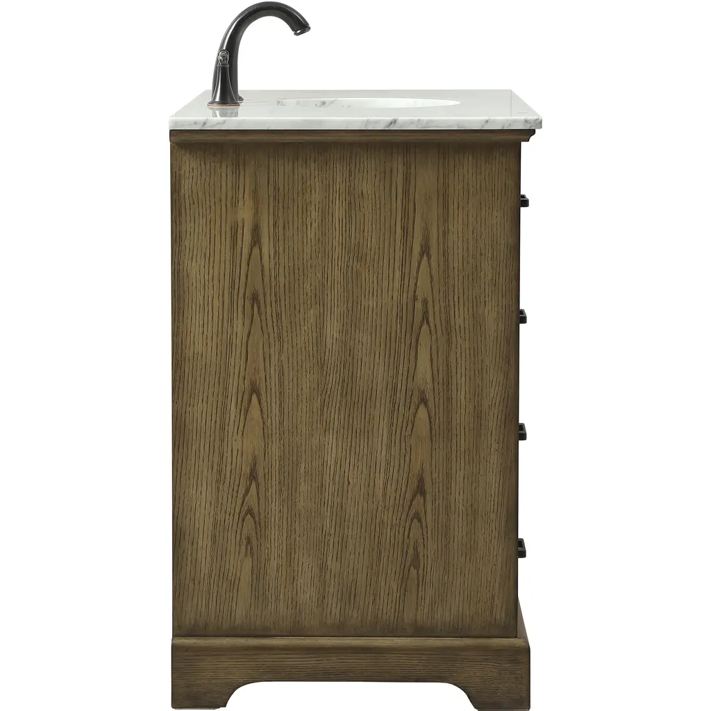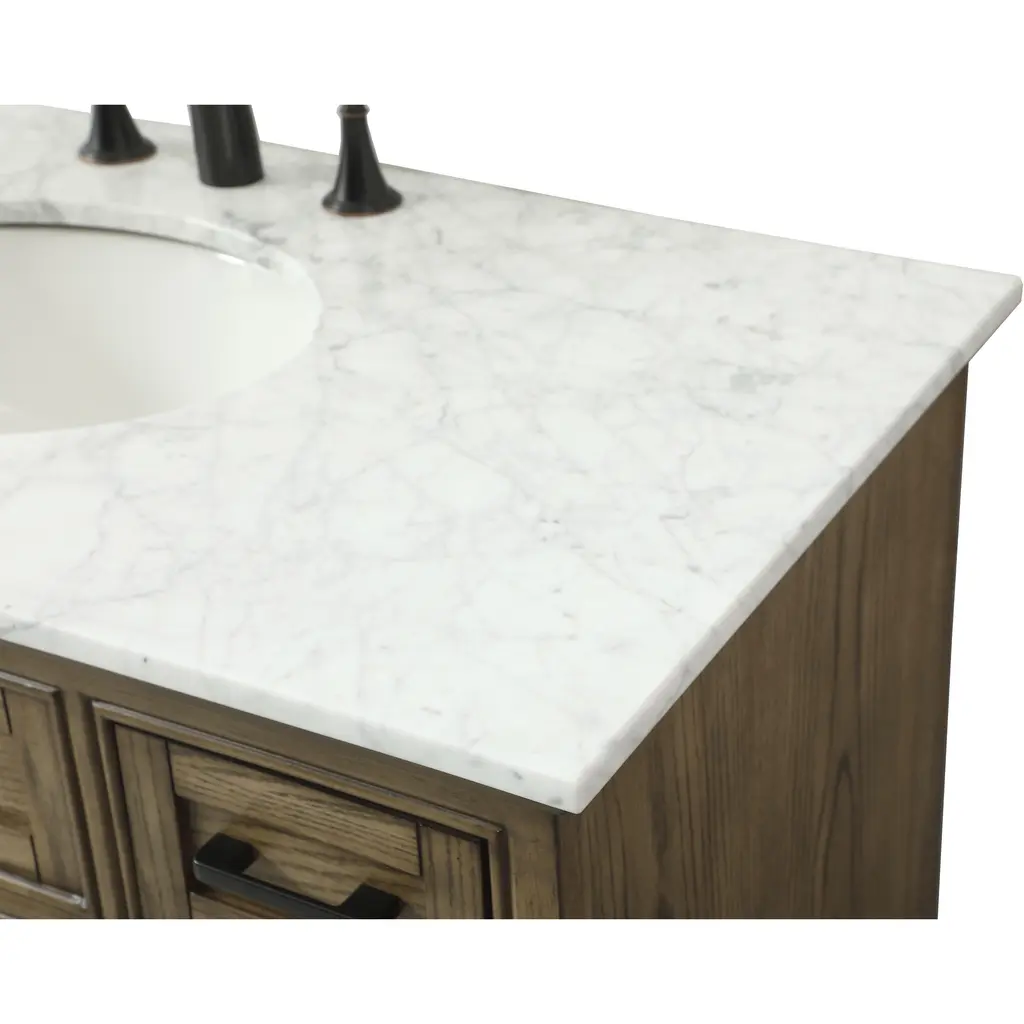 Clean lines and classic form can truly add a fresh look to your bathroom or powder room. This vanity, complemented by round hardware, will surely charm you with its confident style and subtle charisma. This vanity can store all of your bathroom toiletries, from extra towels to make up essentials. The vanity is crowned with carrara white marble and includes a porcelain undermount sink--adding both function and form that will truly amaze.