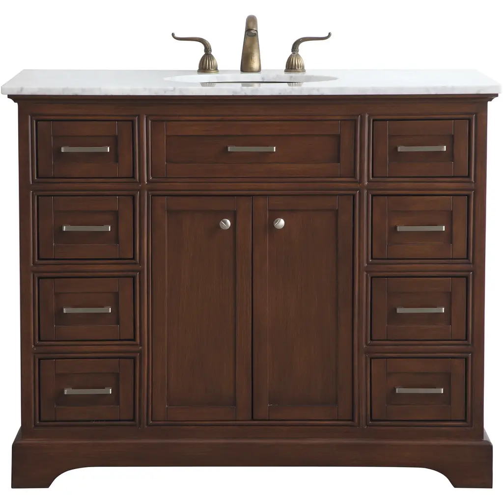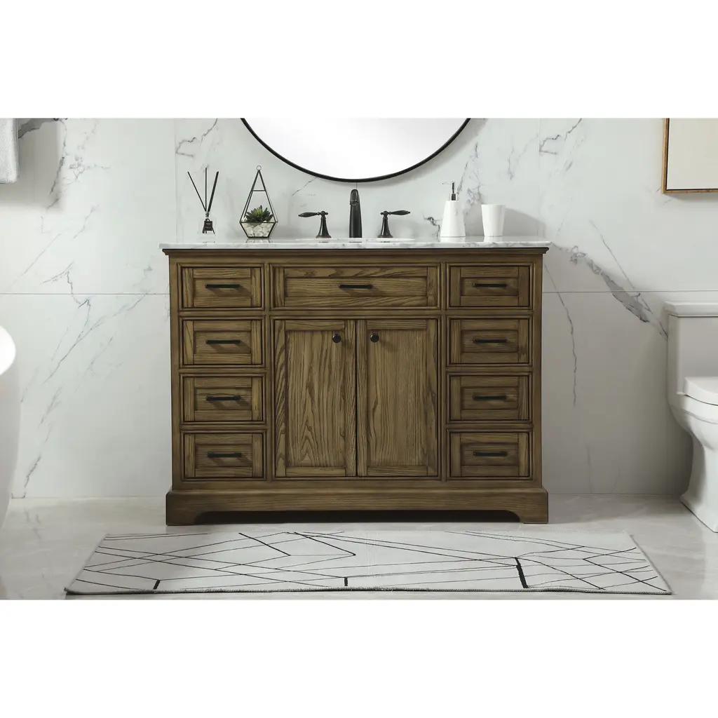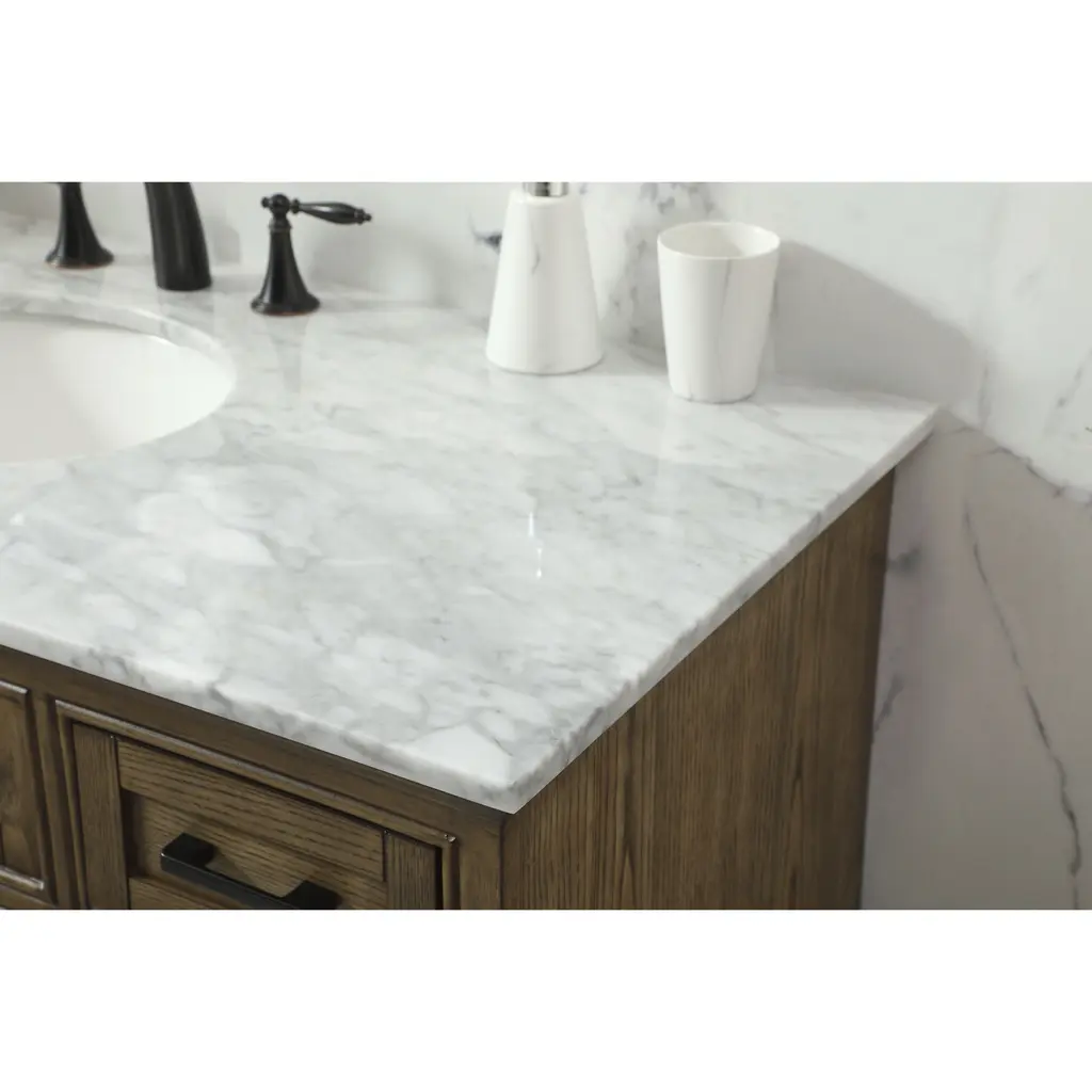 Clean lines and classic form can truly add a fresh look to your bathroom or powder room. This vanity, complemented by round hardware, will surely charm you with its confident style and subtle charisma. This vanity can store all of your bathroom toiletries, from extra towels to make up essentials. The vanity is crowned with carrara white marble and includes a porcelain undermount sink--adding both function and form that will truly amaze.