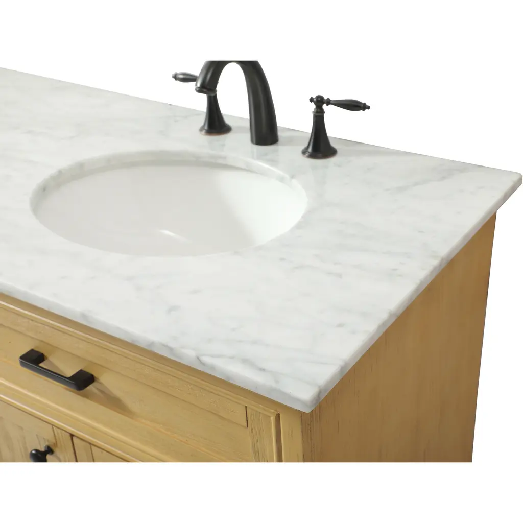Clean lines and classic form can truly add a fresh look to your bathroom or powder room. This vanity, complemented by round hardware, will surely charm you with its confident style and subtle charisma. This vanity can store all of your bathroom toiletries, from extra towels to make up essentials. The vanity is crowned with carrara white marble and includes a porcelain undermount sink--adding both function and form that will truly amaze.