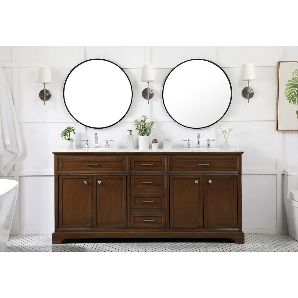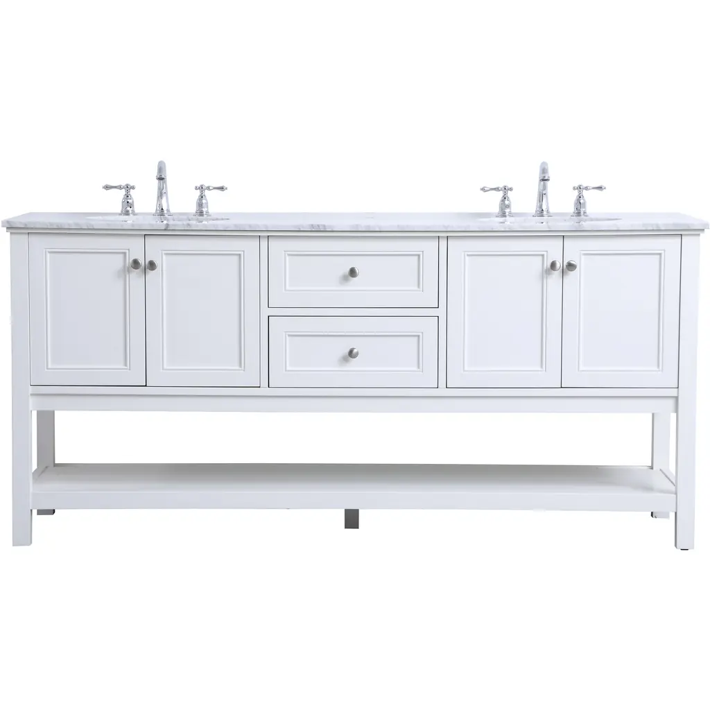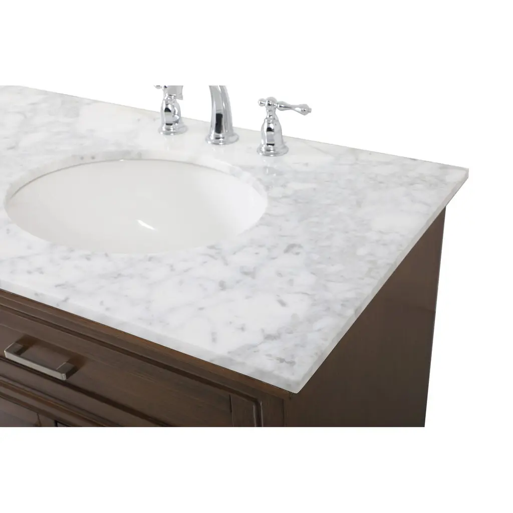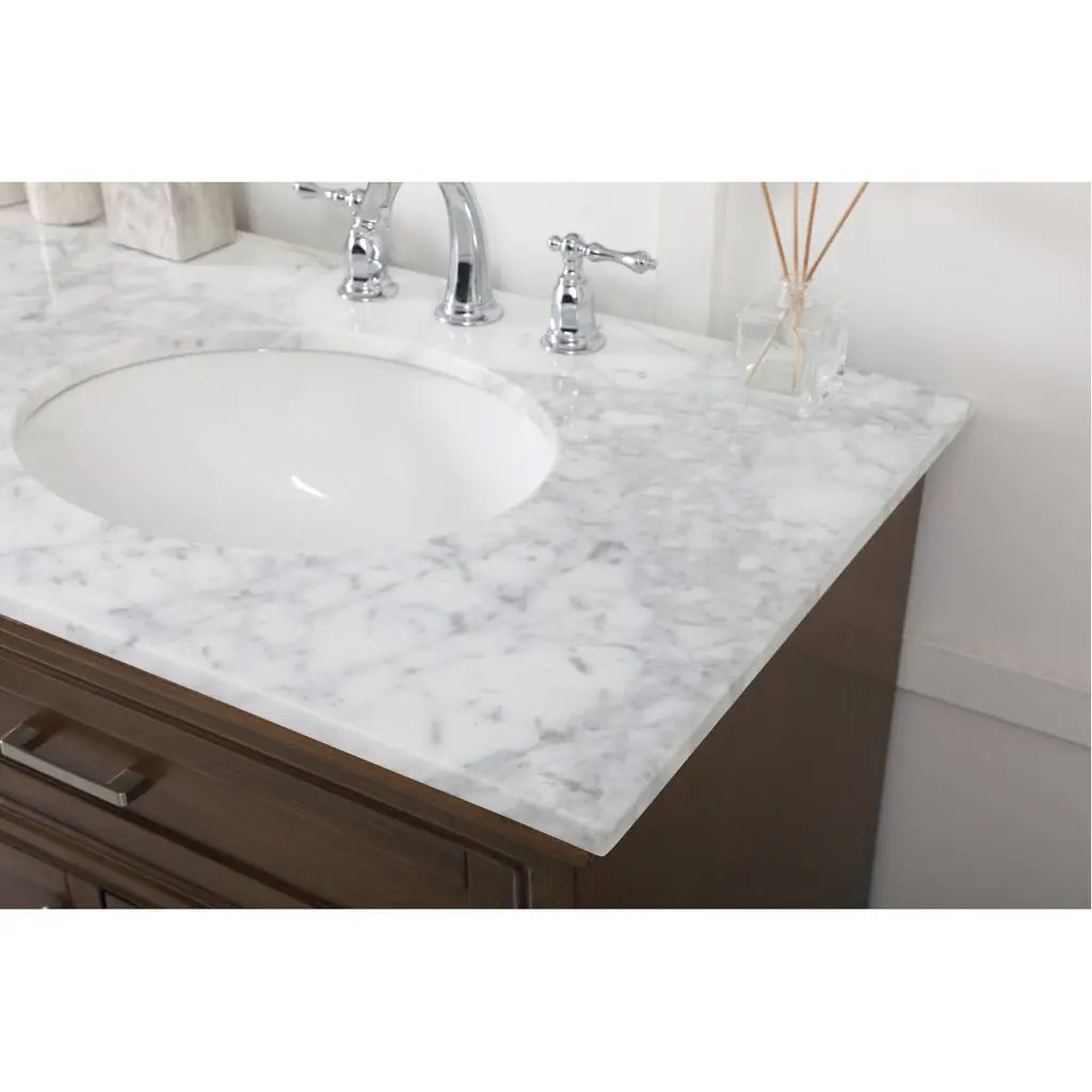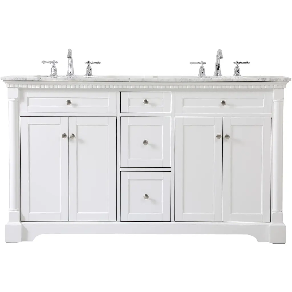 Clean lines and classic form can truly add a fresh look to your bathroom or powder room. This white finish vanity, complemented by round hardware, will surely charm you with its confident style and subtle charisma. This vanity can store all of your bathroom toiletries, from extra towels to make up essentials. The vanity is crowned with carrara white marble and includes a porcelain undermount sink--adding both function and form that will truly amaze.