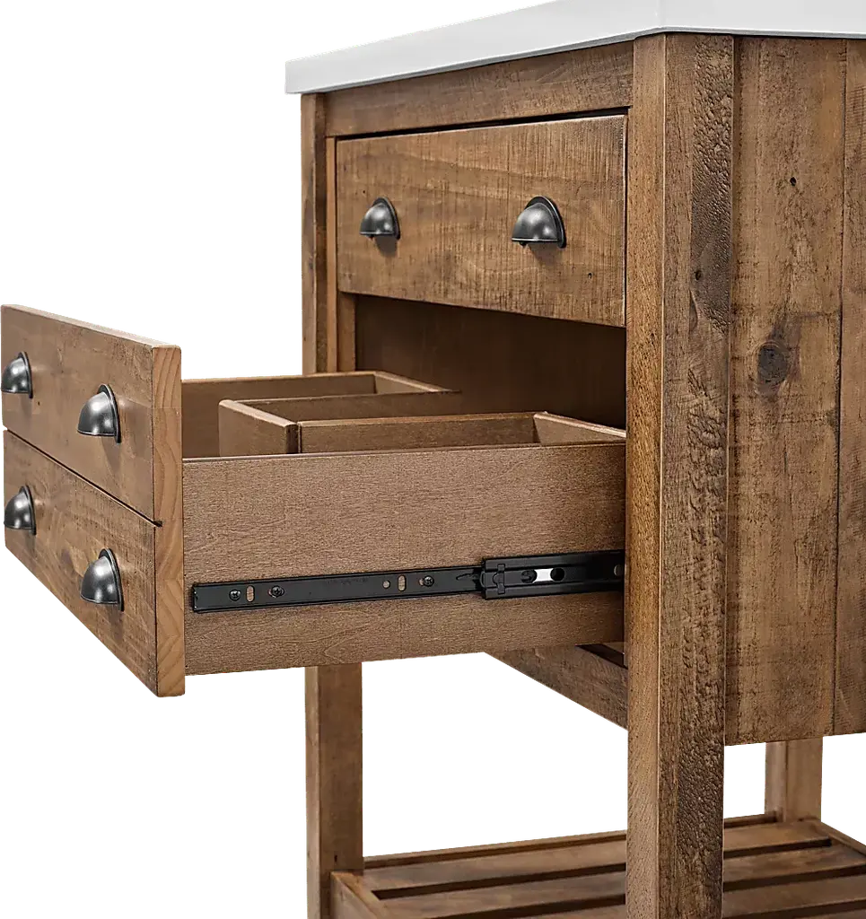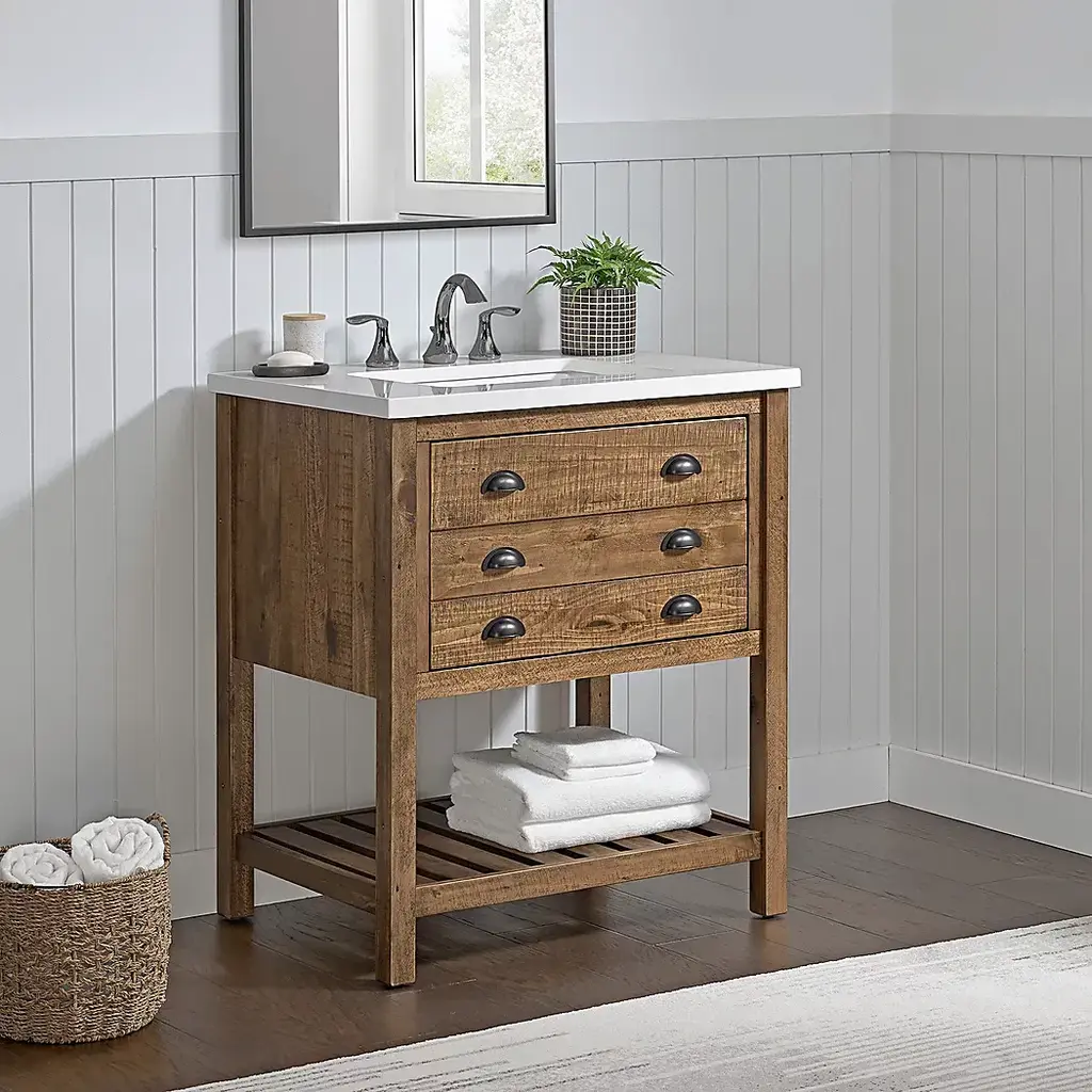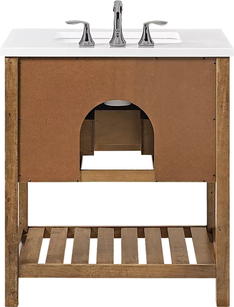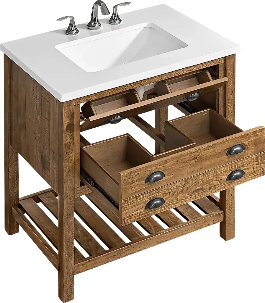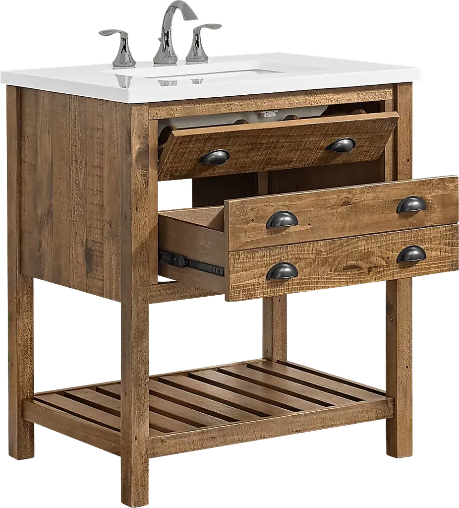 Upgrade your bathroom to a coastal farmhouse look with the Anaar 31-inch wide bathroom vanity. This single sink bathroom vanity features a pine wood base finished in Natural Brown complemented by a solid white cultured marble top. Oil rubbed bronze finished cup pulls on both drawers add an extra dimension to the farmhouse look. One nicely sized split drawer and a top tilt down drawer offers plenty of storage space for toiletries. A bottom slat shelf offers additional storage space for towels, linens, and other items. Customer assembly is required.