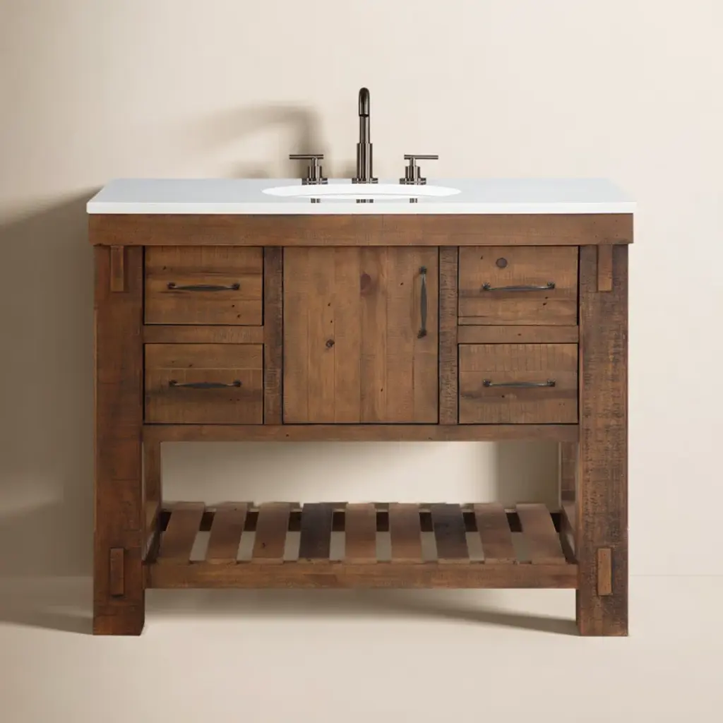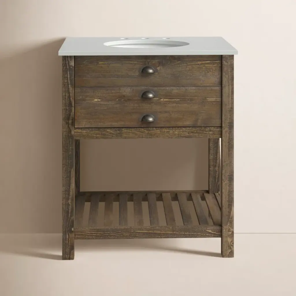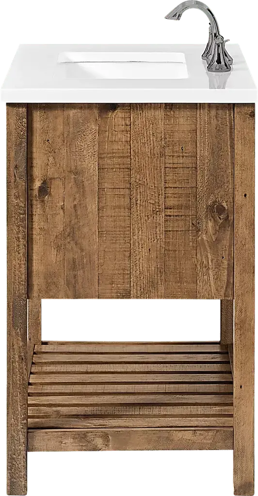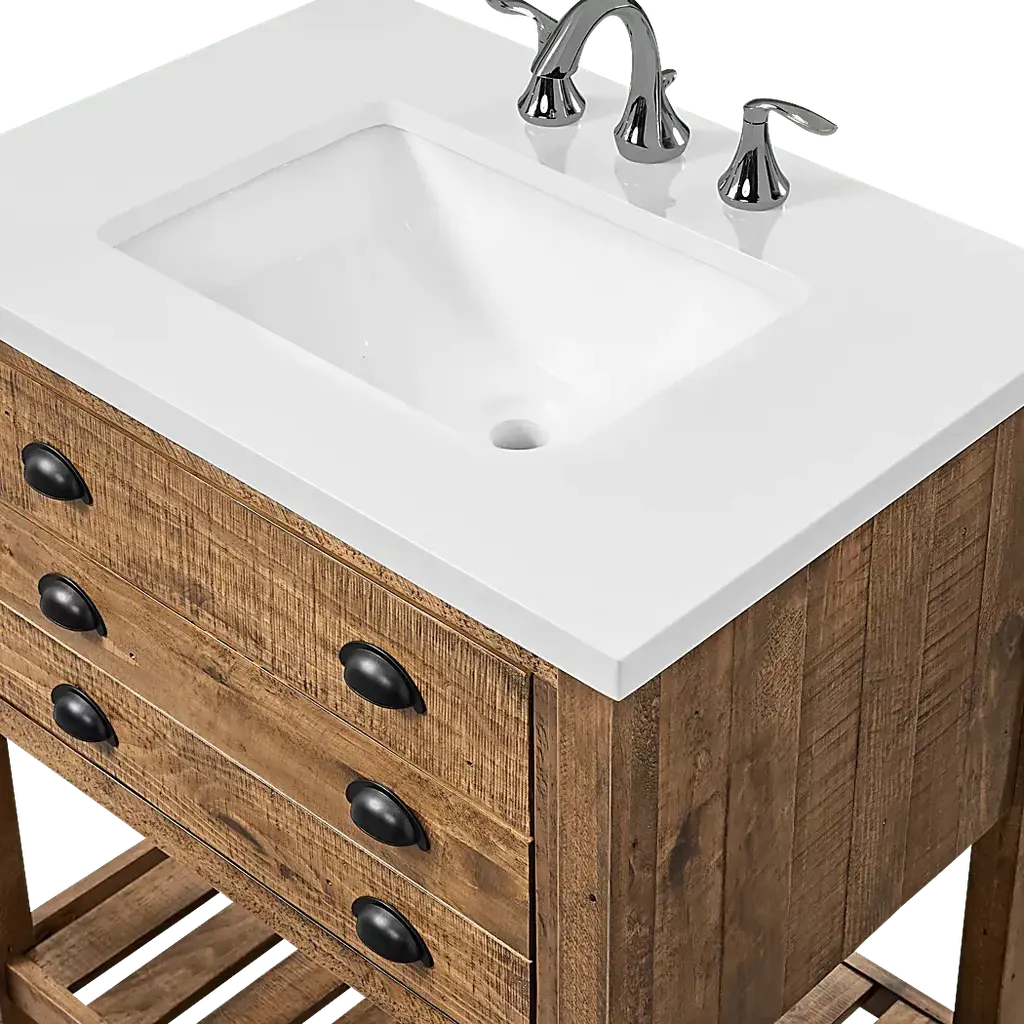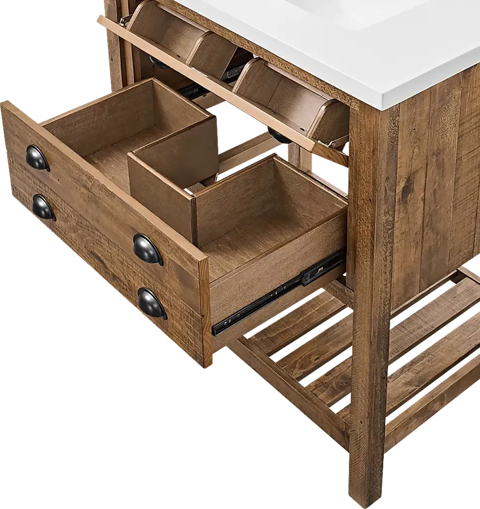 Upgrade your bathroom to a coastal farmhouse look with the Anaar 31-inch wide bathroom vanity. This single sink bathroom vanity features a pine wood base finished in Natural Brown complemented by a solid white cultured marble top. Oil rubbed bronze finished cup pulls on both drawers add an extra dimension to the farmhouse look. One nicely sized split drawer and a top tilt down drawer offers plenty of storage space for toiletries. A bottom slat shelf offers additional storage space for towels, linens, and other items. Customer assembly is required.