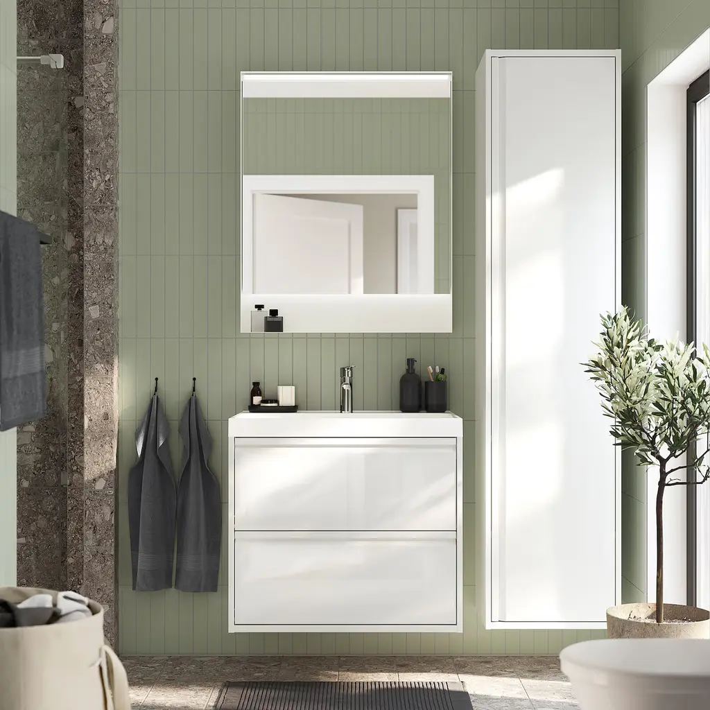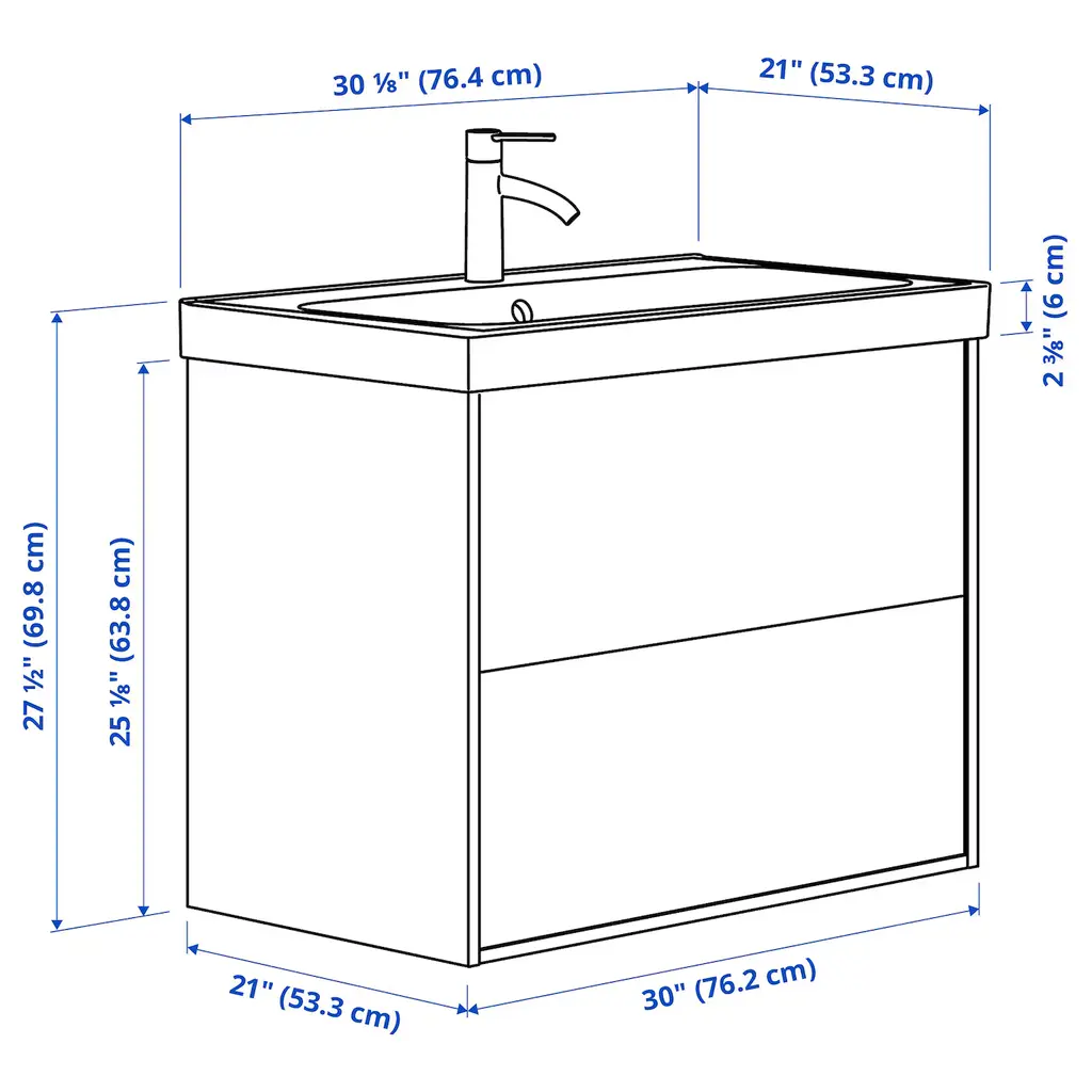 ÄNGSJÖN / BACKSJÖN Bathroom vanity with sink & faucet - high gloss white 30 1/8x21x27 1/2 ". Generous, full drawer storage capacity for all your essentials as piping is led through the back and not via a cut-out in the drawers. Drawers open all the way for a good overview.