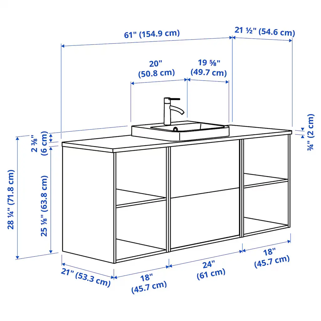 ÄNGSJÖN / BACKSJÖN Bathroom vanity with sink & faucet - high-gloss white/brown oak effect/white marble effect 61x21 1/2x28 1/4 ". Depending on your space and needs, complete this solution with your choice of a mirror or mirror cabinet from our range, sold separately. This product bears the CE mark.
