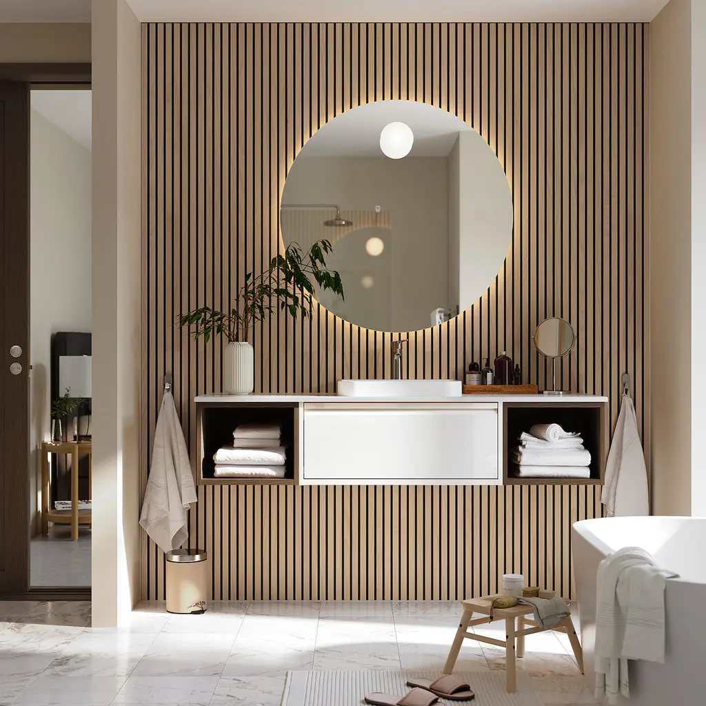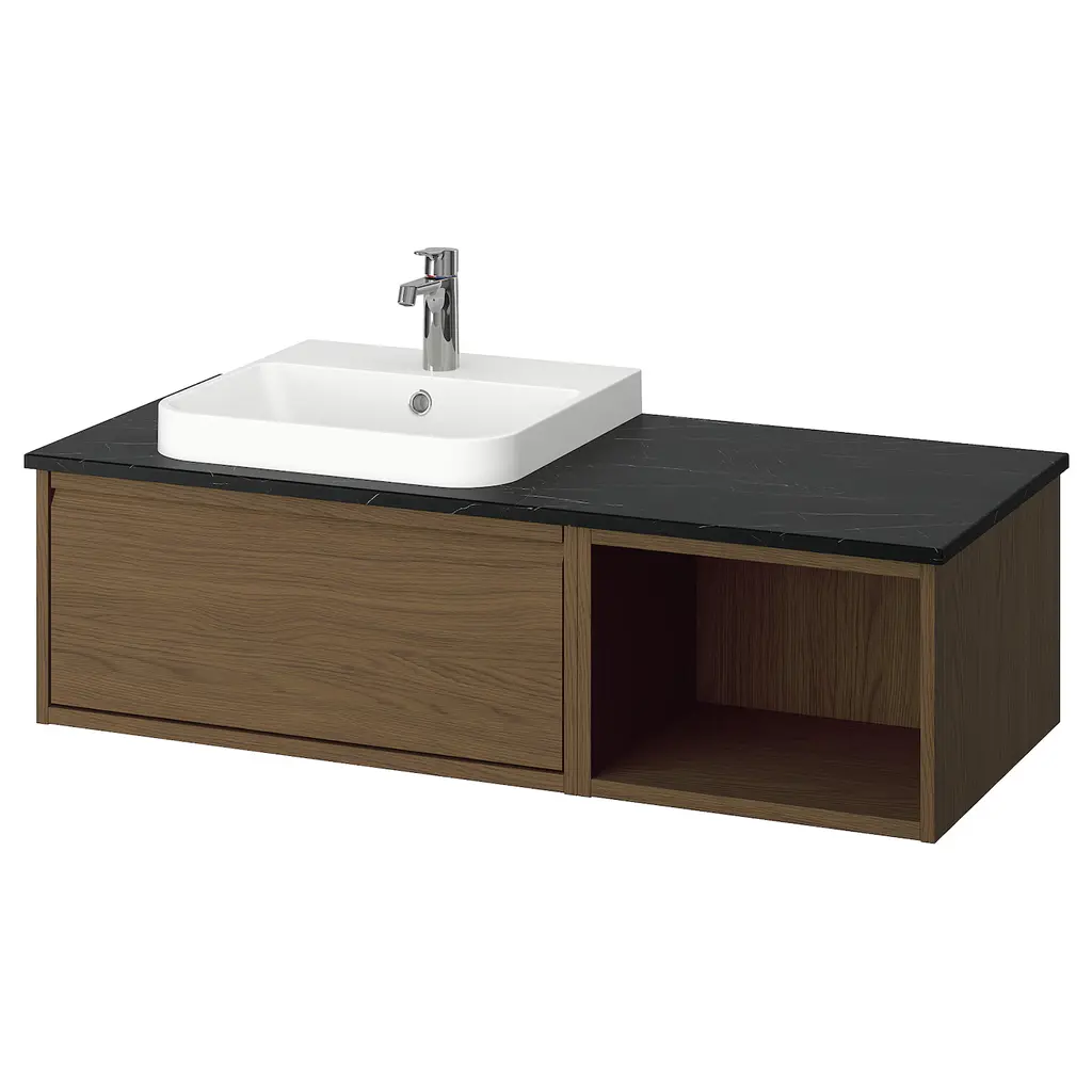 ÄNGSJÖN / BACKSJÖN Bathroom vanity with sink & faucet - high-gloss white/brown oak effect/white marble effect 67x21 1/2x16 1/4 ". Depending on your space and needs, complete this solution with your choice of a mirror or mirror cabinet from our range, sold separately. This product bears the CE mark.