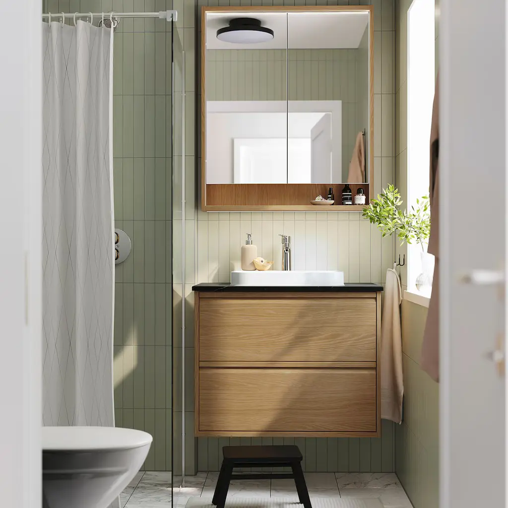 ÄNGSJÖN / BACKSJÖN Bathroom vanity with sink & faucet - oak effect/black marble effect 31x21 1/2x28 1/4 ". Generous, full drawer storage capacity for all your essentials as piping is led through the back and not via a cut-out in the drawers. Drawers open all the way for a good overview.
