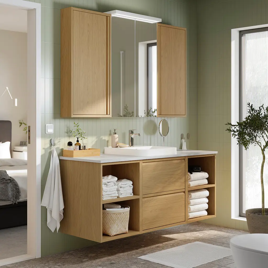 ÄNGSJÖN / BACKSJÖN Bathroom vanity with sink & faucet - oak effect/white marble effect 61x21 1/2x28 1/4 ". Depending on your space and needs, complete this solution with your choice of a mirror or mirror cabinet from our range, sold separately. This product bears the CE mark.