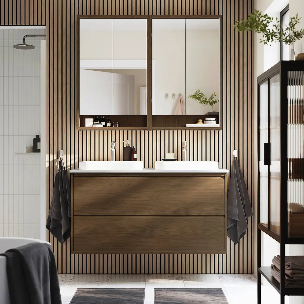 ÄNGSJÖN / BACKSJÖN Bathroom vanity with sink & faucets - brown oak effect/white marble effect 49x21 1/2x28 1/4 ". Generous, full drawer storage capacity for all your essentials as piping is led through the back and not via a cut-out in the drawers. Drawers open all the way for a good overview.
