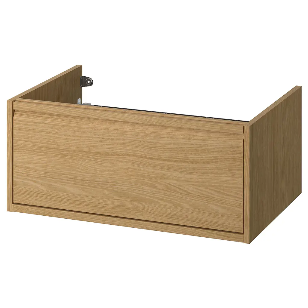 ÄNGSJÖN Bathroom vanity with drawer - oak effect 24x21x13 1/8 ". Generous, full drawer storage capacity for all your essentials as piping is led through the back and not via a cut-out in the drawer. The drawer opens all the way for a good overview.