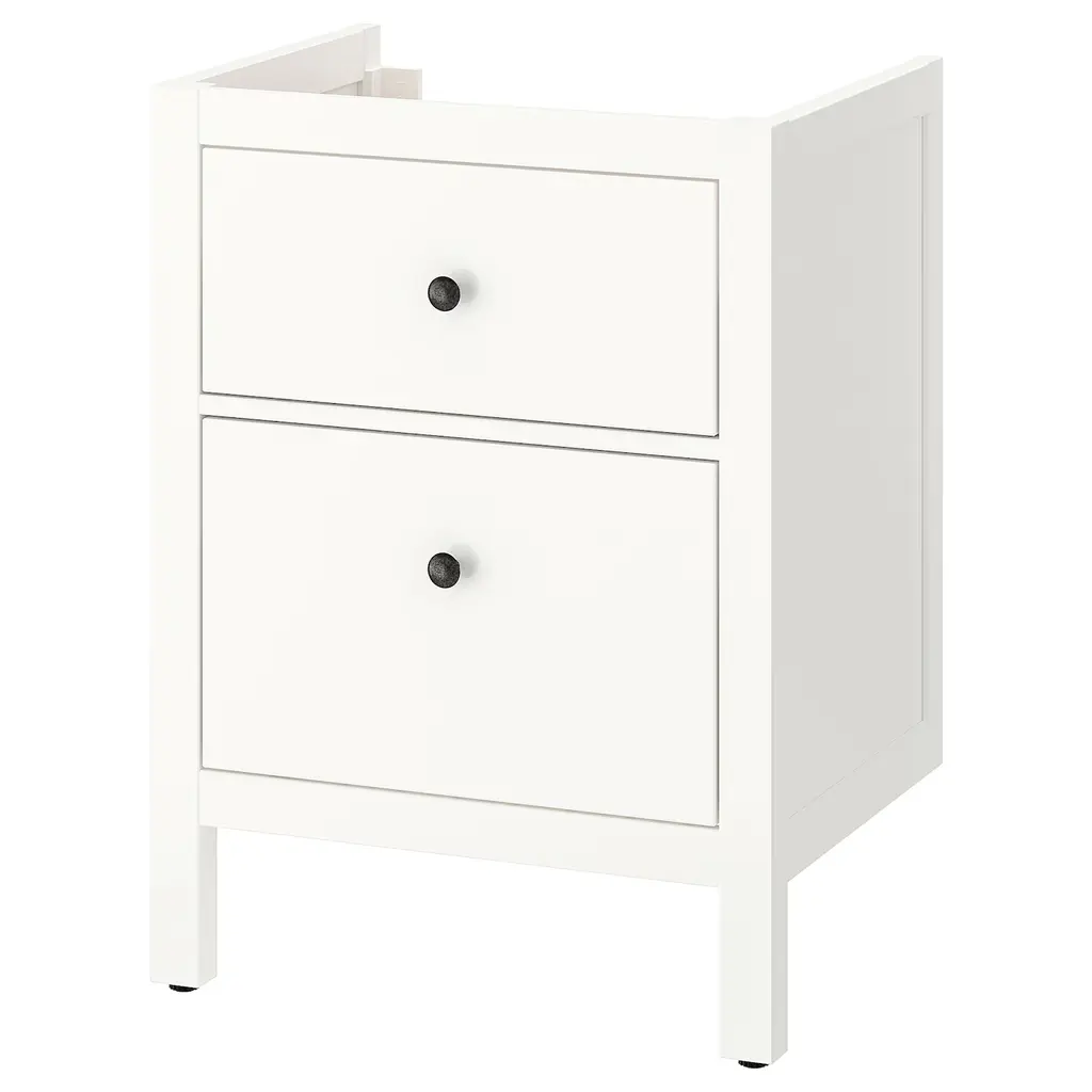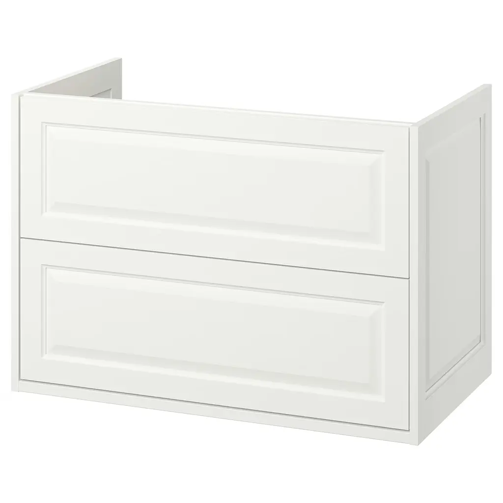 ÄNGSJÖN Bathroom vanity with drawers - high gloss white 48x21x25 1/8 ". Generous, full drawer storage capacity for all your essentials as piping is led through the back and not via a cut-out in the drawers. Drawers open all the way for a good overview.