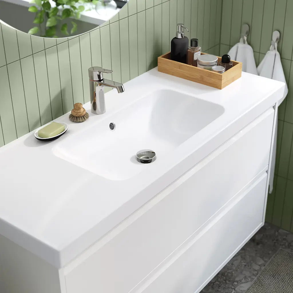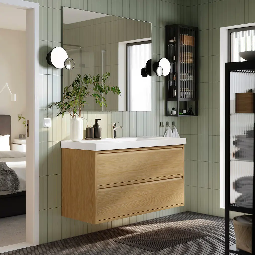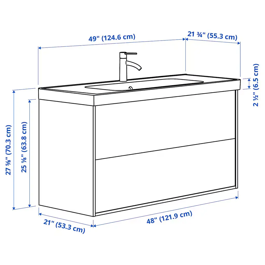 ÄNGSJÖN / ORRSJÖN Bathroom vanity with sink & faucet - oak effect 49x21 3/4x27 5/8 ". Generous, full drawer storage capacity for all your essentials as piping is led through the back and not via a cut-out in the drawers. Drawers open all the way for a good overview. This product bears the CE mark.