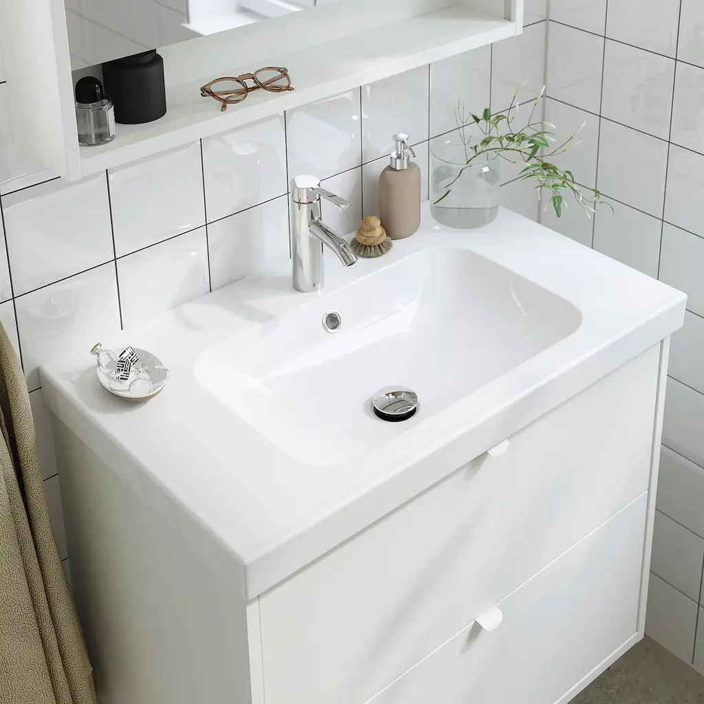 ÄNGSJÖN / ORRSJÖN Bathroom vanity with sink & faucet - high gloss white 31x21 3/4x27 5/8 ". Generous, full drawer storage capacity for all your essentials as piping is led through the back and not via a cut-out in the drawers. Drawers open all the way for a good overview.