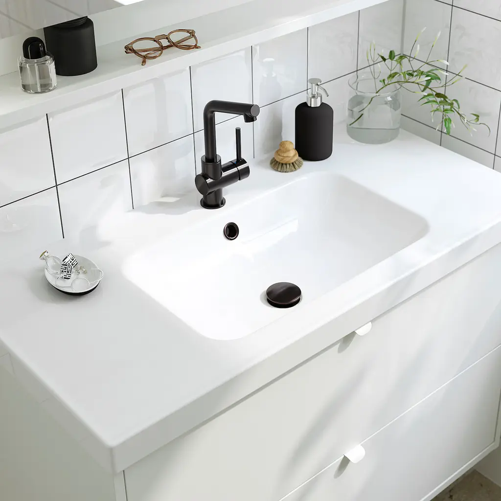 ÄNGSJÖN / ORRSJÖN Bathroom vanity with sink & faucet - oak effect 37x21 3/4x27 5/8 ". Generous, full drawer storage capacity for all your essentials as piping is led through the back and not via a cut-out in the drawers. Drawers open all the way for a good overview. This product bears the CE mark.