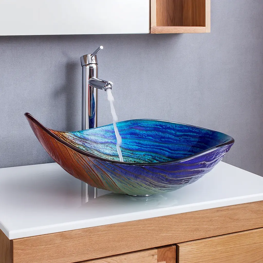 Features:- High-End & Elegant Appearance - 22 1/16" x 14 3/8" x 7 7/8" Aquaterior Countertop Bathroom Glass Sink features a unique waterdrop shape with shiny gradient colors, wave texture, and shiny quicksand effect, making it the perfect decorative yet functional piece to enhance the style and aesthetics of your bathroom- Exquisite & Durable - Made of 1/2" thick high-gloss tempered glass with a smooth surface, its exquisite design ensures durability, wear resistance and ease of cleaning, a perfect fit for both home and commercial use, ideal for homes, hotels, cafes, restaurants, shopping malls, salons, etc.- Large Size - Measuring 22 1/16" x 14 3/8" x 7 7/8", its large size, great water capacity, and waterdrop-shaped design prevent excessive water splashing and avoid overflowing, keeping your bathroom neat and dry; Features curved edge to avoid scratches and accidental injury, ensuring your safety- Easy Installation - Designed for simple countertop installation, just drill a suitable hole on the countertop for draining purposes, and you will be able to complete the installation without the need to replace the vanity, along with user manual for hassle-free DIY project- Quality Guarantee - Equipped with CUPC certification and one-year warranty for your peace of mind and worry-free usage, along with online after-sales customer support for hassle-free installation and maintenanceSpecifications:- Overall Size(LxWxH): 22 1/16" x 14 3/8" x 7 7/8"(highest edge) or 5 1/8"(lowest edge) (56 x 36.5 x 20 or 13 cm)- Interior Size(LxWxH): 21 1/16" x 13 3/8" x 5 1/2" (53.5 x 34 x 14 cm)- Drain Hole Diameter: 1 3/4" (4.5 cm)- Sink Thickness: 1/2" (1.2 cm)- Installation Types: Above Counter- Material: Tempered Glass- Recommended Spout Height of Faucet: 7 7/8" to 9 13/16" (20 to 25 cm)- Net Weight: 13.3 Lbs (6.05 kg)Package Contents:- 1x Tempered Glass Sink- 1x Manual
