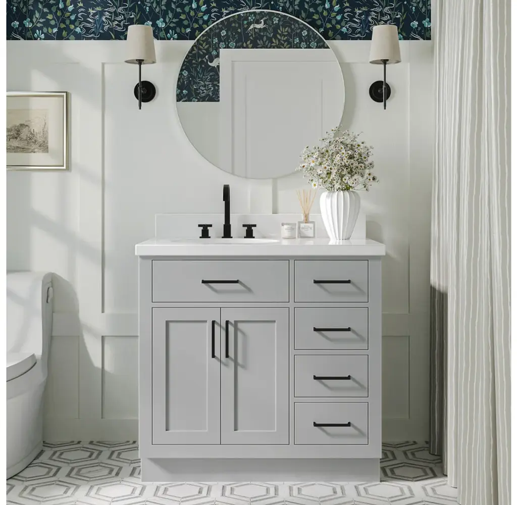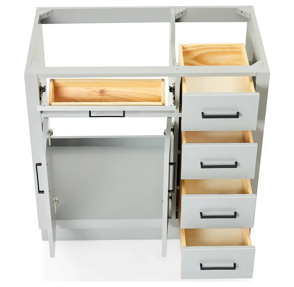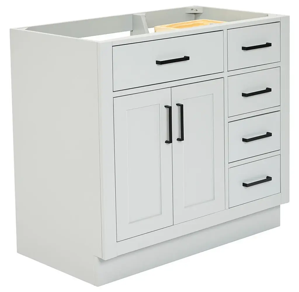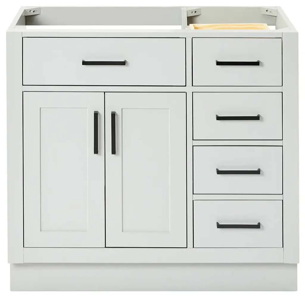 The Hepburn Vanity Collection from ARIEL Bath is the perfect combination of elegance and form, taking inspiration from traditional cabinetry but with a modern twist. Constructed from high quality hardwood plywood, this vanity will be sure to last for many years to come.Covered under Ariel's 3 year limited warranty36"W x 21.5"D x 34.5"HHardwood plywood construction for lasting beauty and durabilityGrey painted finishTwo soft-closing doors with adjustable hinges so you'll never have to worry about hearing a door slamFour full extension, self-closing drawers and one 45-degree open drawer to meet all your storage needsDove-tail construction drawer boxes for additional strength and stability