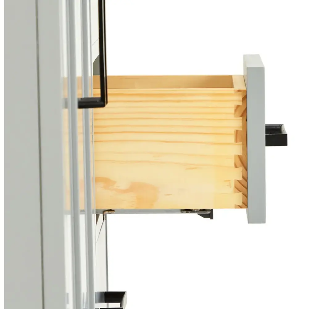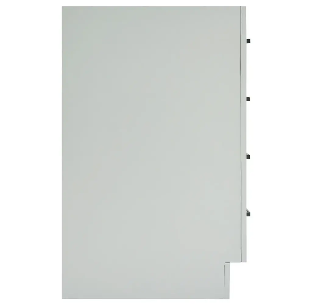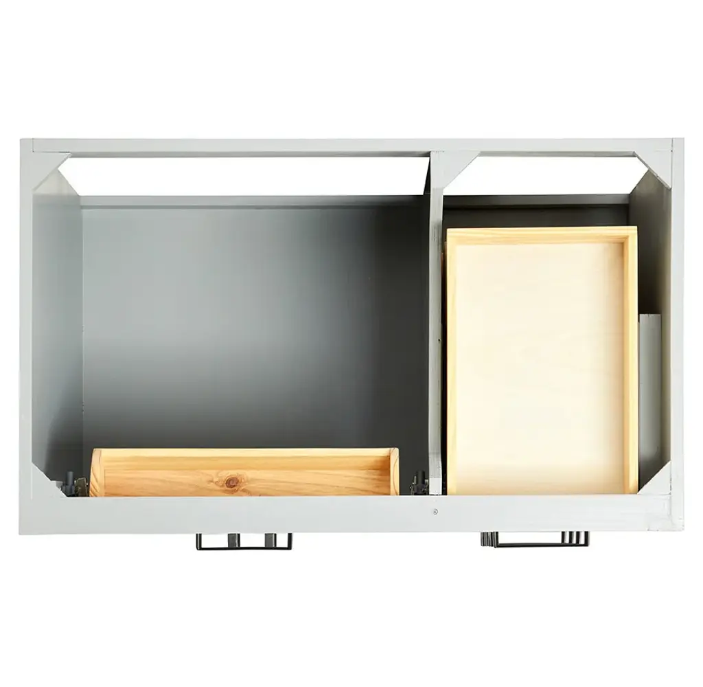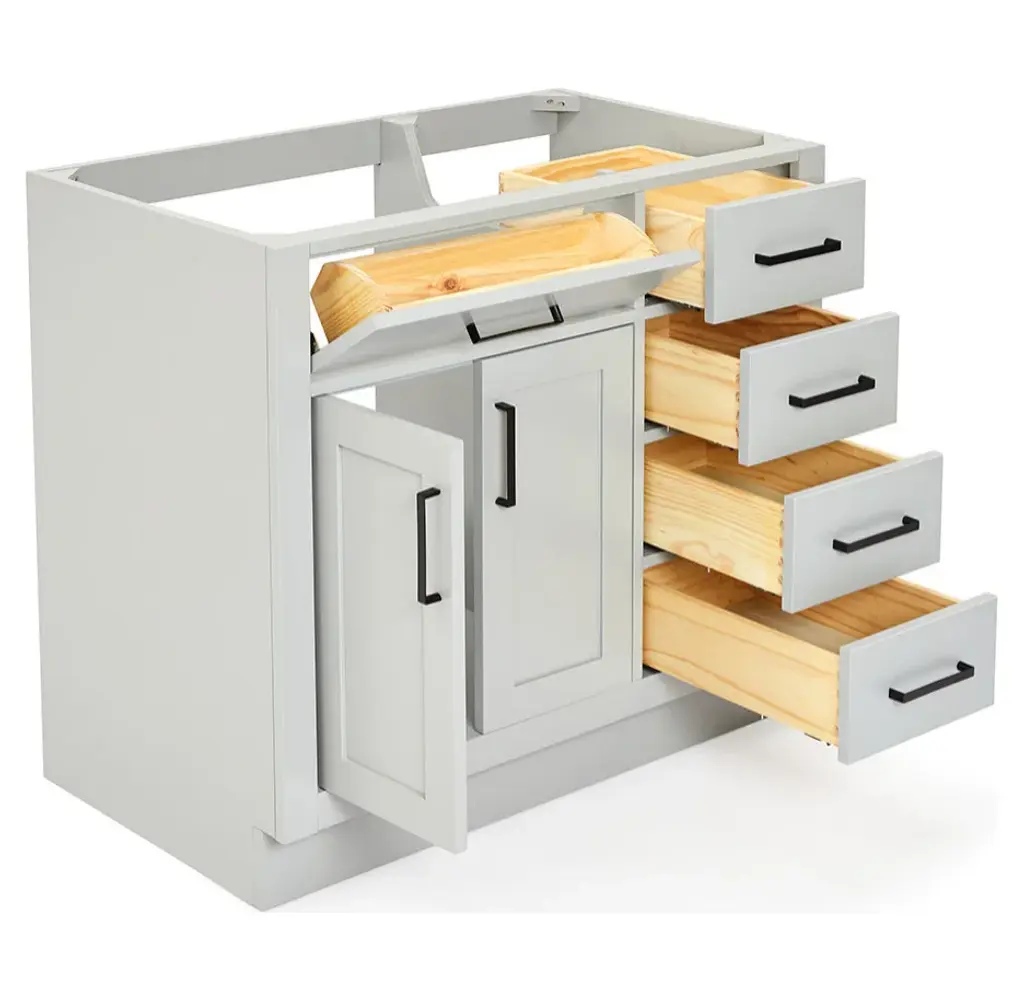 The Hepburn Vanity Collection from ARIEL Bath is the perfect combination of elegance and form, taking inspiration from traditional cabinetry but with a modern twist. Constructed from high quality hardwood plywood, this vanity will be sure to last for many years to come.Covered under Ariel's 3 year limited warranty36"W x 21.5"D x 34.5"HHardwood plywood construction for lasting beauty and durabilityGrey painted finishTwo soft-closing doors with adjustable hinges so you'll never have to worry about hearing a door slamFour full extension, self-closing drawers and one 45-degree open drawer to meet all your storage needsDove-tail construction drawer boxes for additional strength and stability