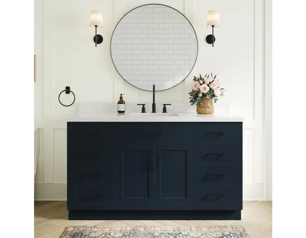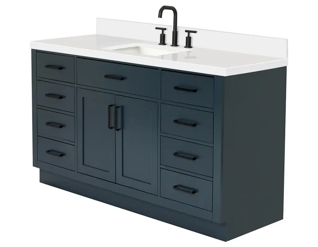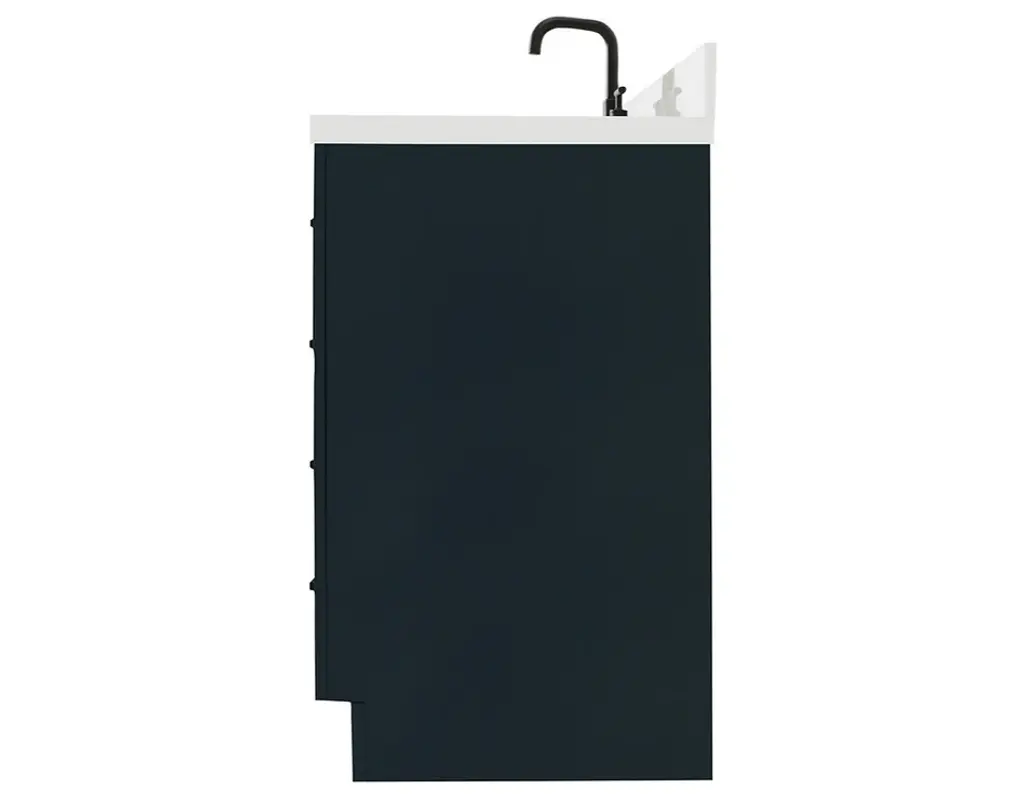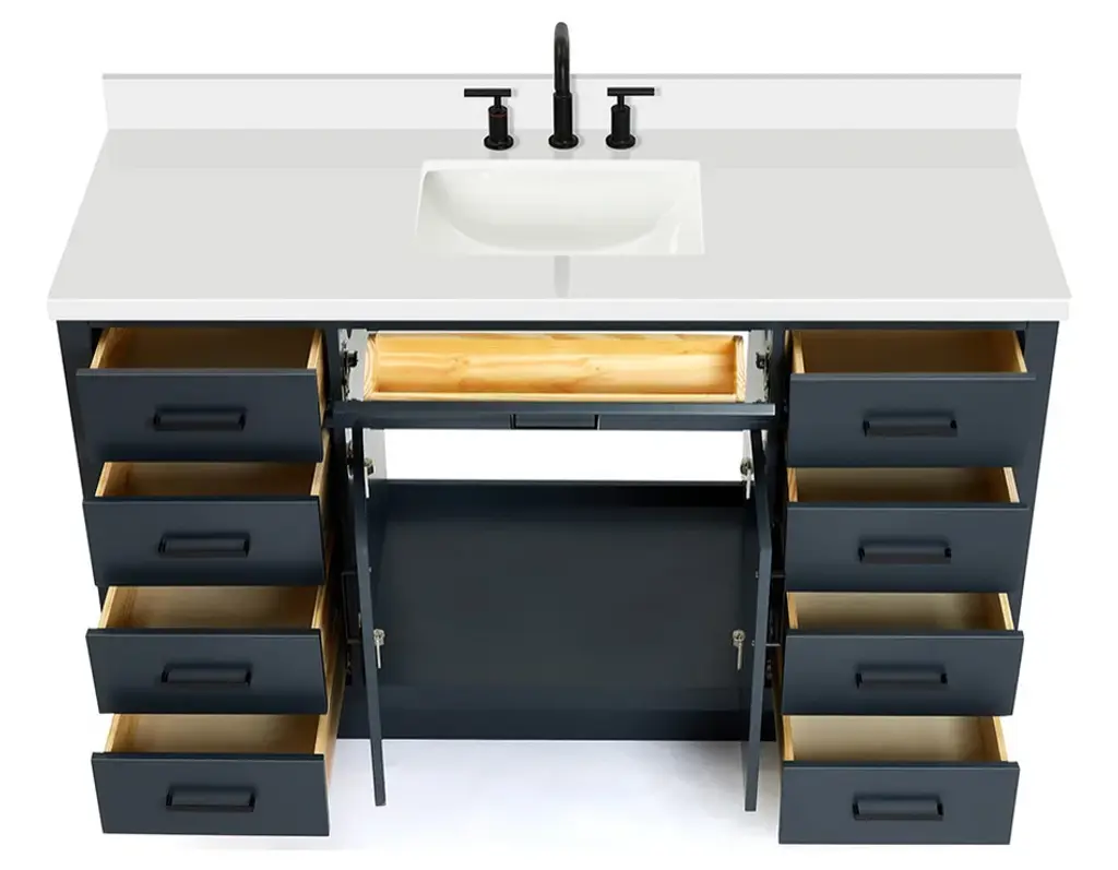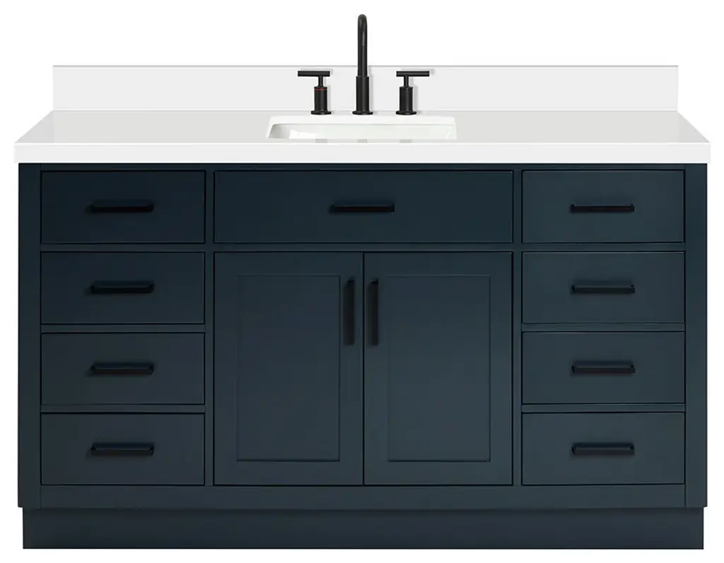 The Hepburn Vanity Collection from ARIEL Bath is the perfect combination of elegance and form, taking inspiration from traditional cabinetry but with a modern twist. Constructed from high quality hardwood plywood, this vanity will be sure to last for many years to come.Covered under Ariel's 3 year limited warranty61"W x 22"D x 36"HHardwood plywood construction for lasting beauty and durabilityMidnight Blue painted finish2 soft-closing doors with adjustable hinges so you'll never have to worry about hearing a door slamEight full extension, self-closing drawers and one 45-degree open drawer to meet all your storage needsDove-tail construction drawer boxes for additional strength and stability
