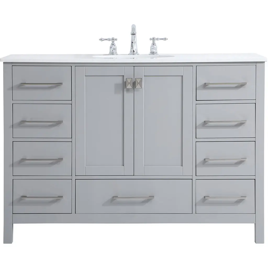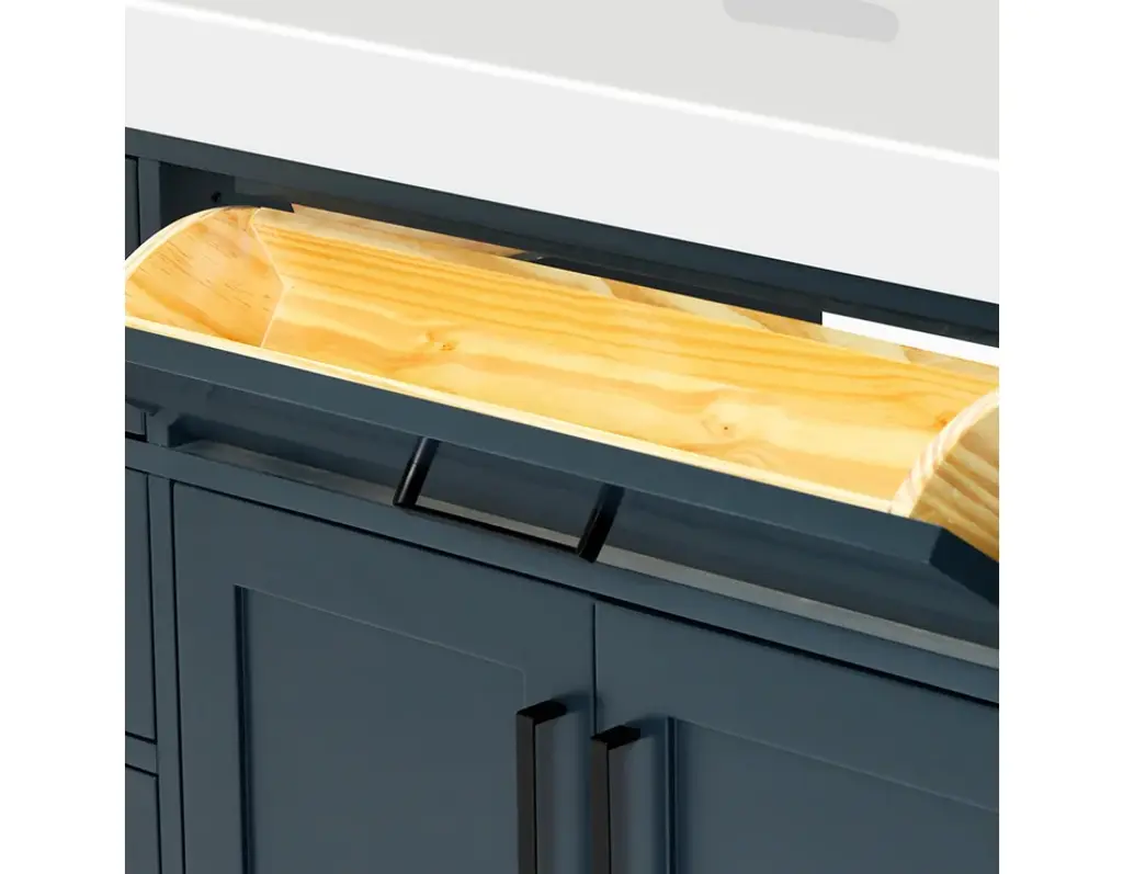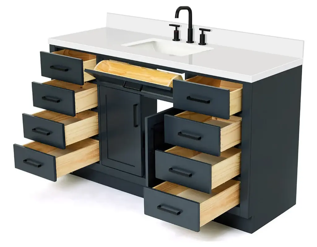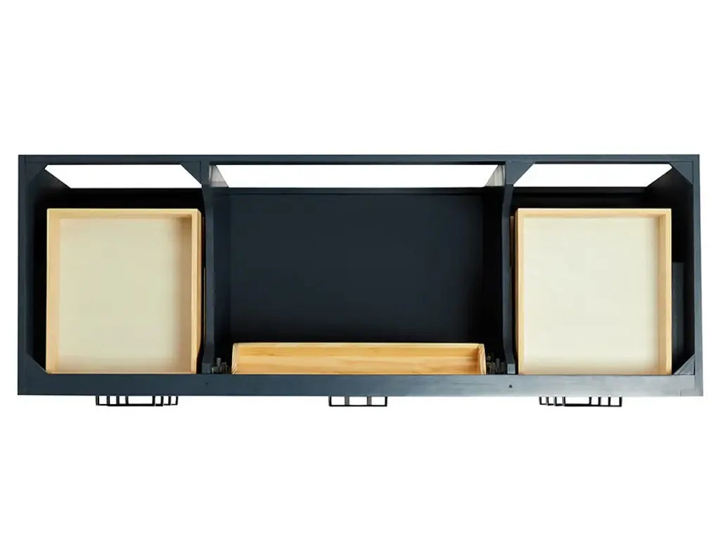 The Hepburn Vanity Collection from ARIEL Bath is the perfect combination of elegance and form, taking inspiration from traditional cabinetry but with a modern twist. Constructed from high quality hardwood plywood, this vanity will be sure to last for many years to come.Covered under Ariel's 3 year limited warranty61"W x 22"D x 36"HHardwood plywood construction for lasting beauty and durabilityMidnight Blue painted finish2 soft-closing doors with adjustable hinges so you'll never have to worry about hearing a door slamEight full extension, self-closing drawers and one 45-degree open drawer to meet all your storage needsDove-tail construction drawer boxes for additional strength and stability