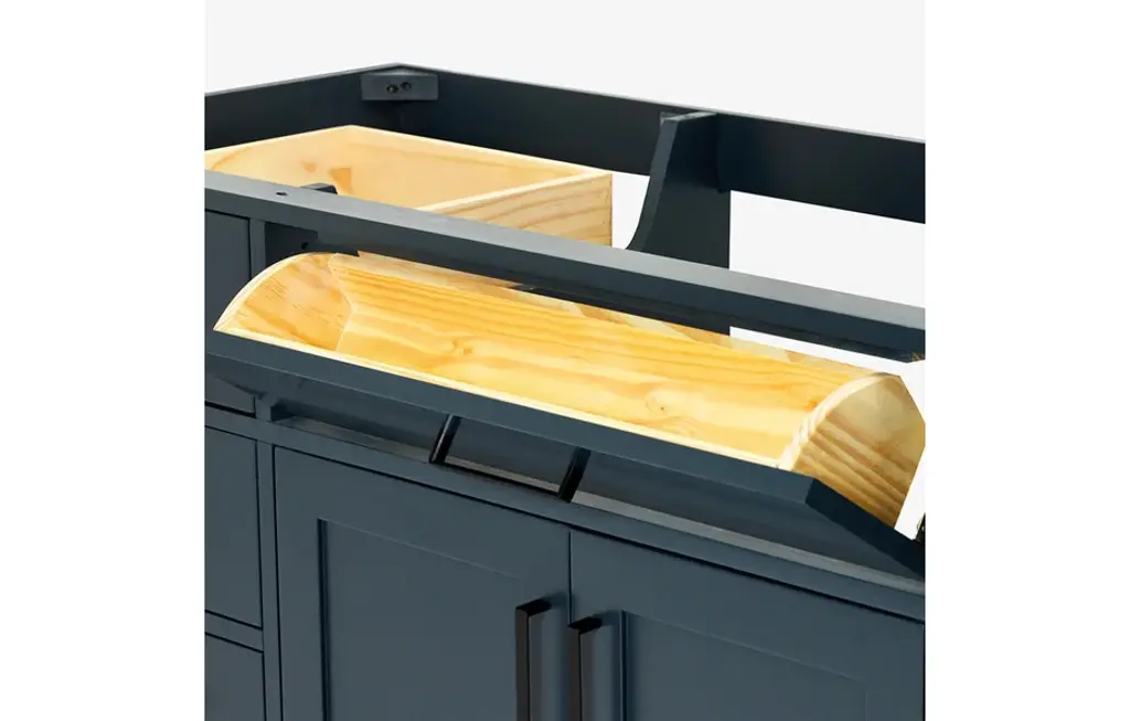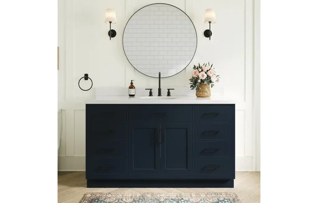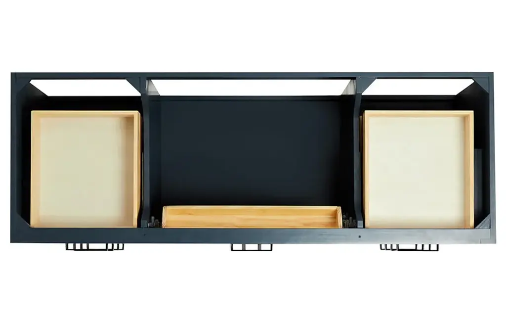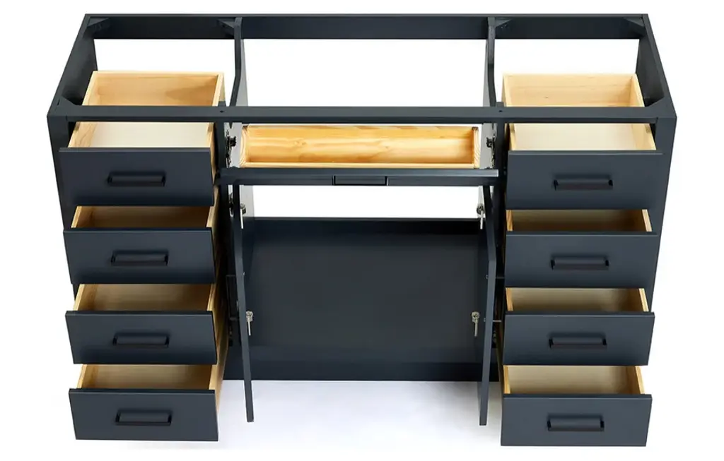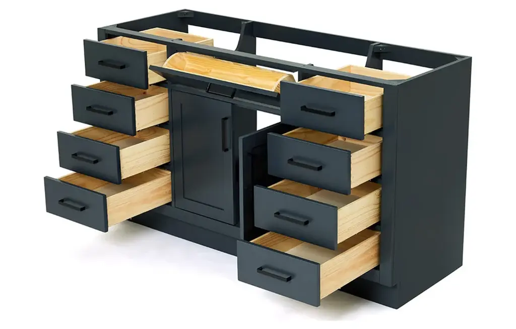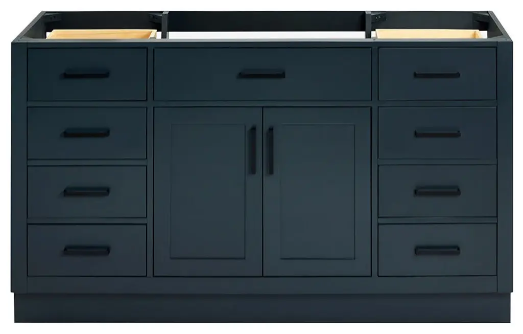 The Hepburn Vanity Collection from ARIEL Bath is the perfect combination of elegance and form, taking inspiration from traditional cabinetry but with a modern twist. Constructed from high quality hardwood plywood, this vanity will be sure to last for many years to come.Covered under Ariel's 3 year limited warranty60"W x 21.5"D x 34.5"HHardwood plywood construction for lasting beauty and durabilityMidnight Blue painted finishTwo soft-closing doors with adjustable hinges so you'll never have to worry about hearing a door slamEight full extension, self-closing drawers and one 45-degree open drawer to meet all your storage needsDove-tail construction drawer boxes for additional strength and stability