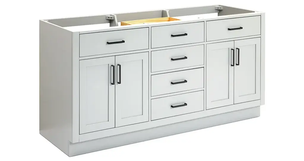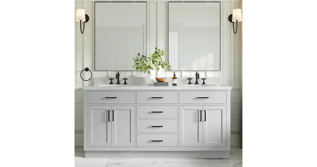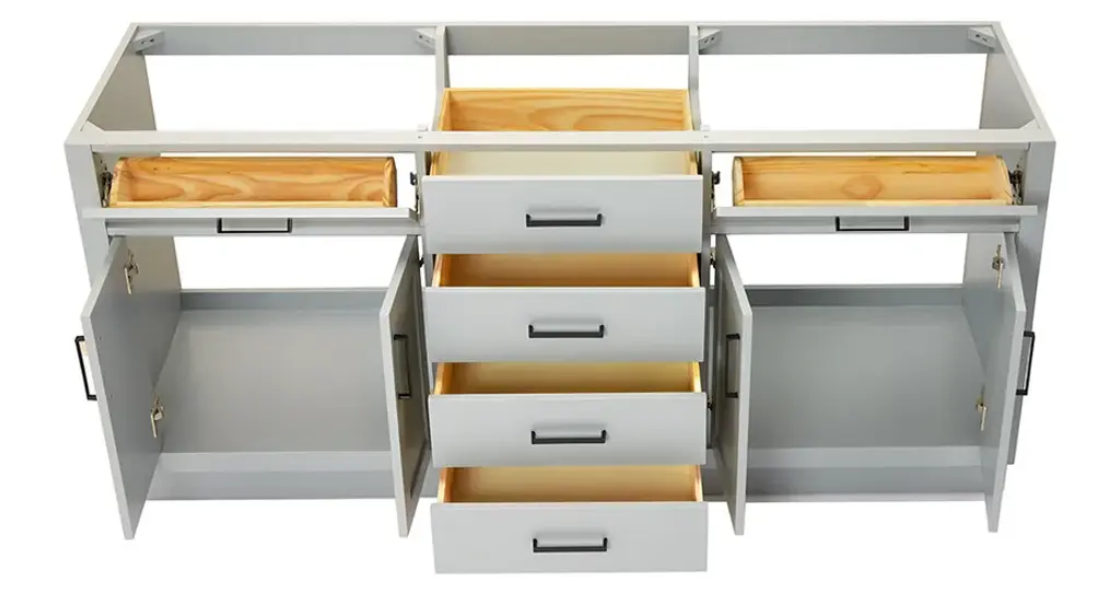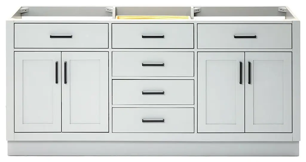 The Hepburn Vanity Collection from ARIEL Bath is the perfect combination of elegance and form, taking inspiration from traditional cabinetry but with a modern twist. Constructed from high quality hardwood plywood, this vanity will be sure to last for many years to come.Covered under Ariel's 3 year limited warranty72"W x 21.5"D x 34.5"HHardwood plywood construction for lasting beauty and durabilityGrey painted finishFour soft-closing doors with adjustable hinges so you'll never have to worry about hearing a door slamFour full extension, self-closing drawers and two 45-degree open drawers to meet all your storage needsDove-tail construction drawer boxes for additional strength and stability