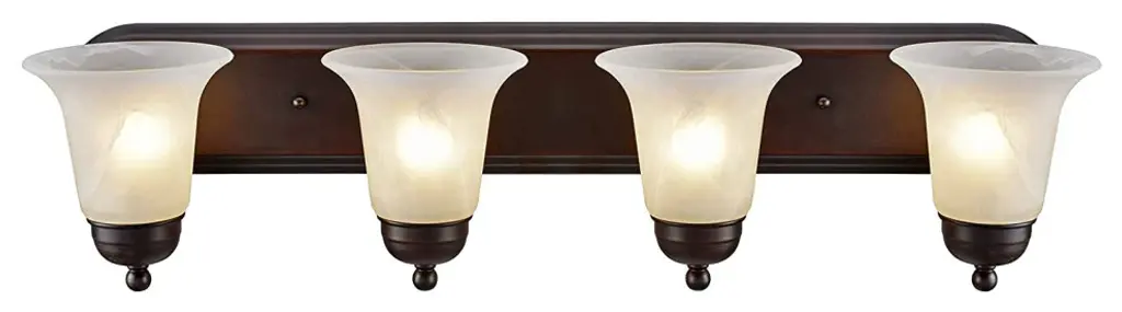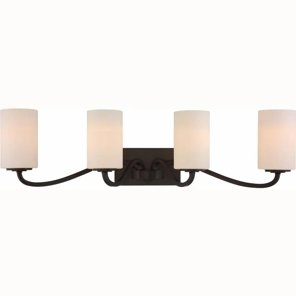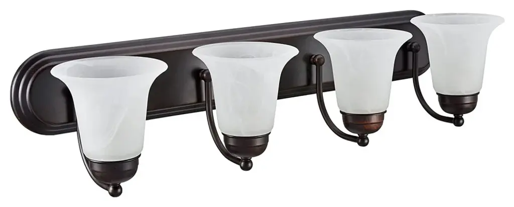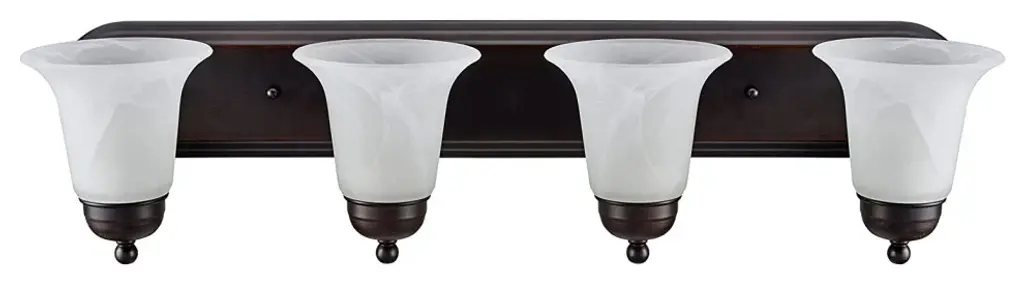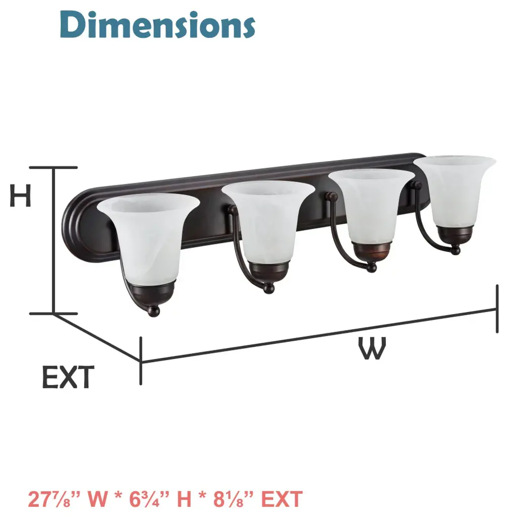 Aspen Creative offers a 4 light bathroom vanity wall light fixture in oil rubbed bronze. Fixture dimensions 8 1/8" Deep x 29 7/8" Width x 6 3/4" Height. Backplate dimensions 1" Deep x 30" Width x 4 5/8" Height. Requires 4 type A - 100 watt E26 medium base light bulb (not included). Includes alabaster glass bellshades. Shade dimensions 5 5/8" Width x 4 1/4" Height. UL listed for bathroom wall installation above the mirror and vanity cabinet as well as powder rooms and makeup rooms.